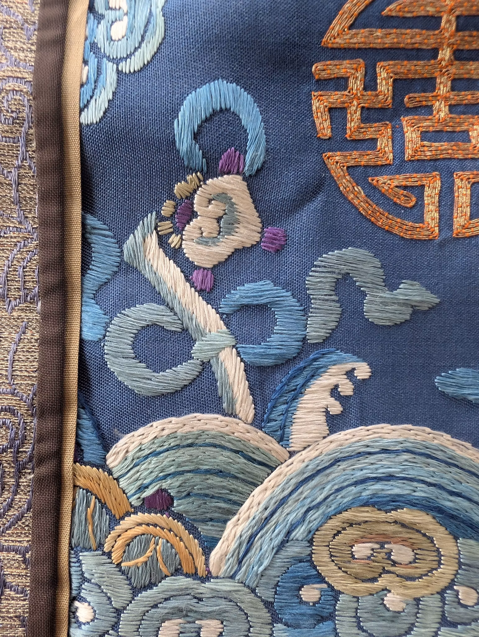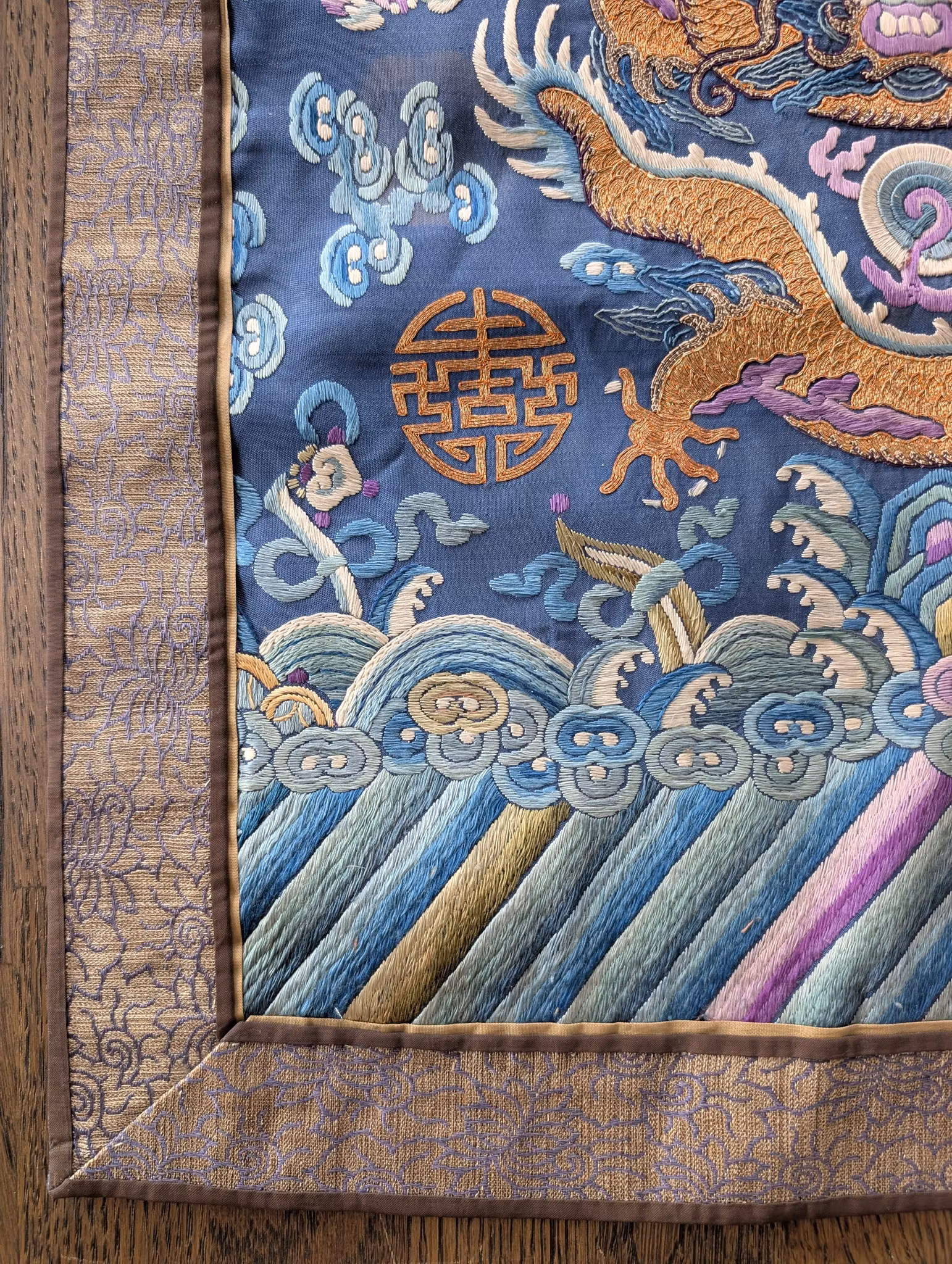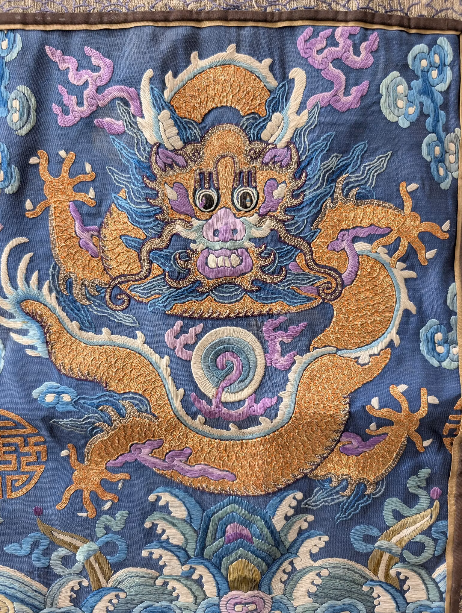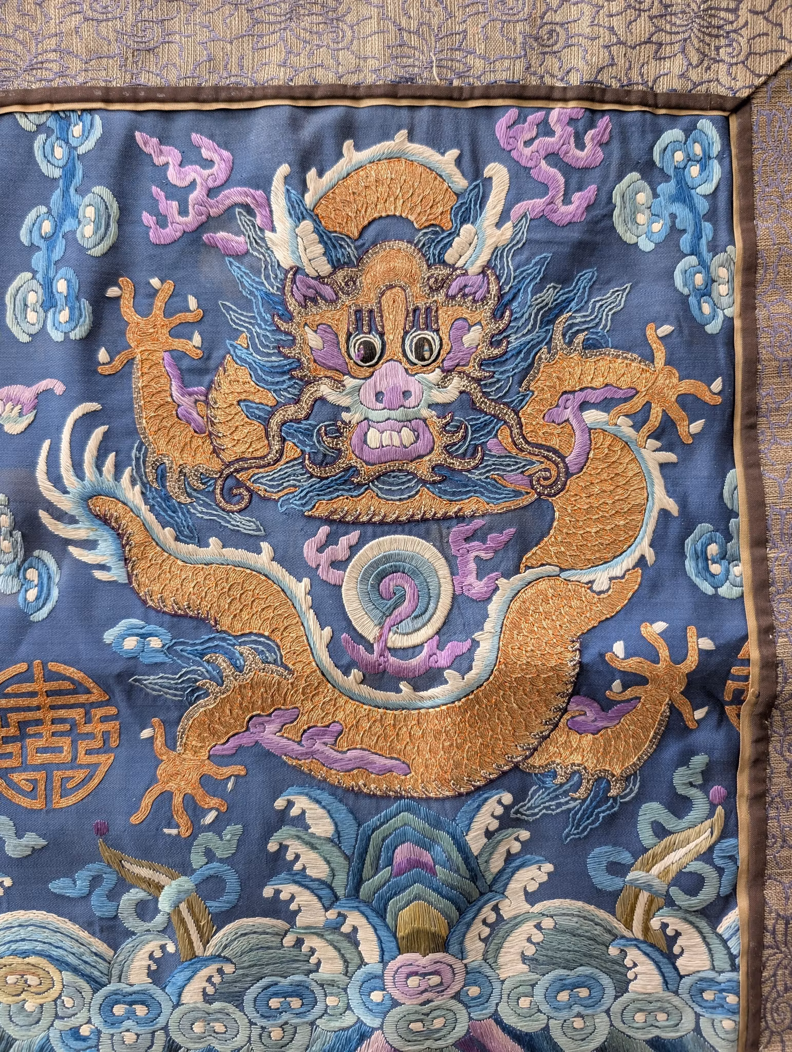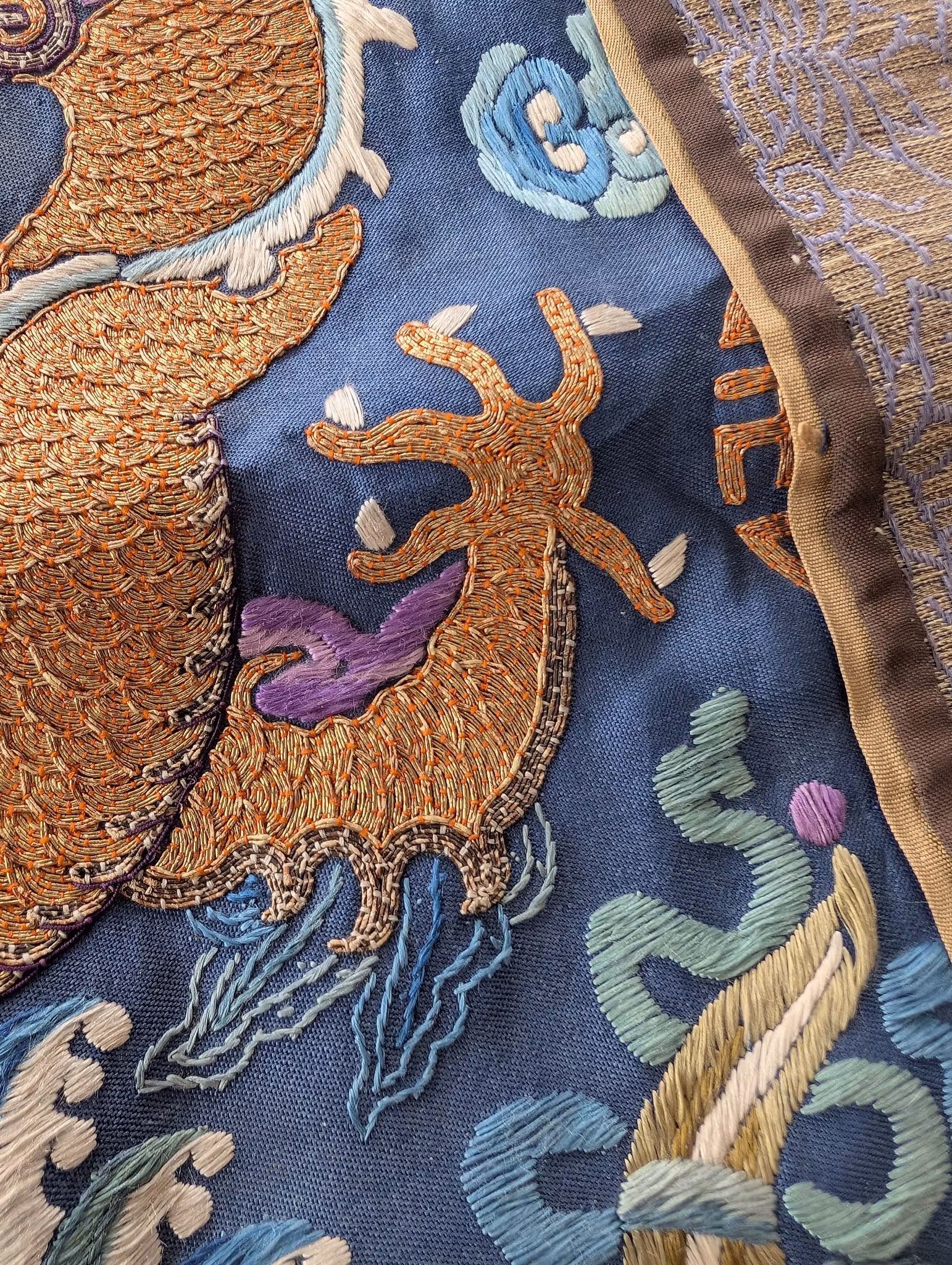 Textile fragment from an antique Chinese Qing Dynasty Jifu / Dragon Robe. The textile was cut from the shoulder of the robe.