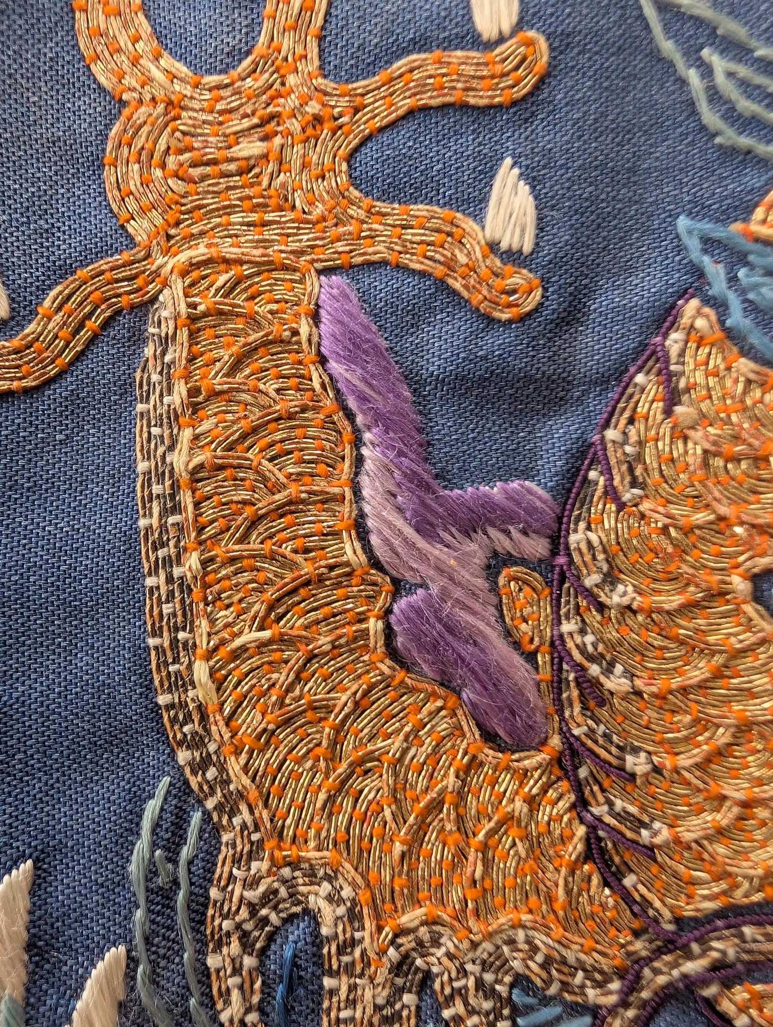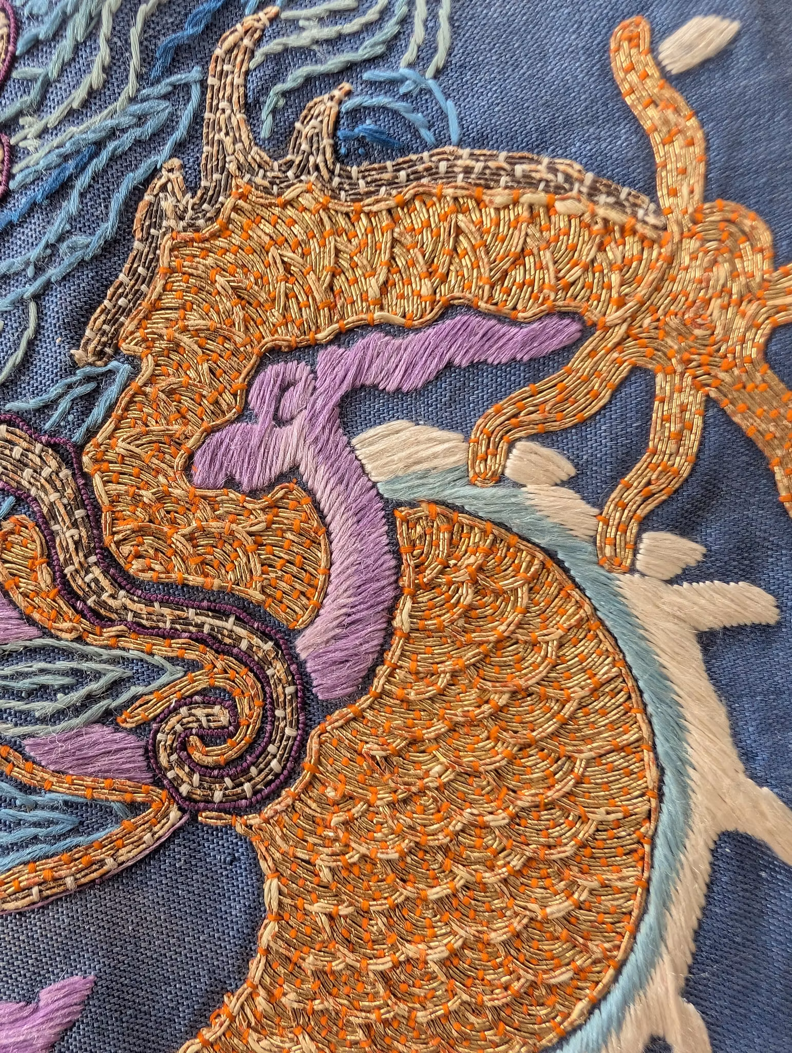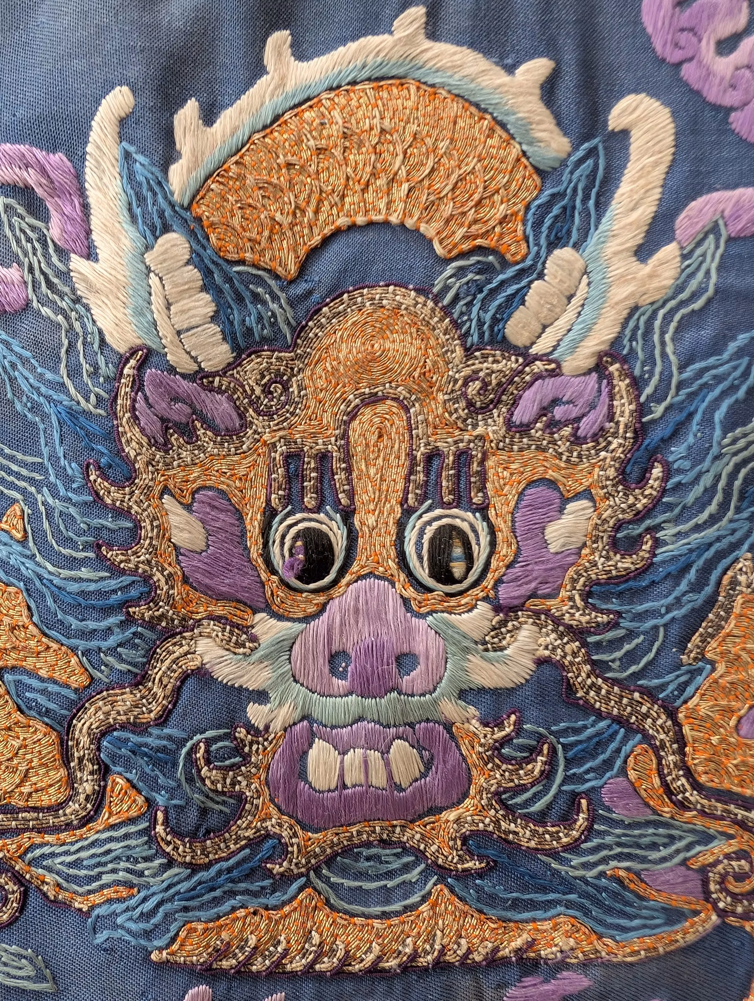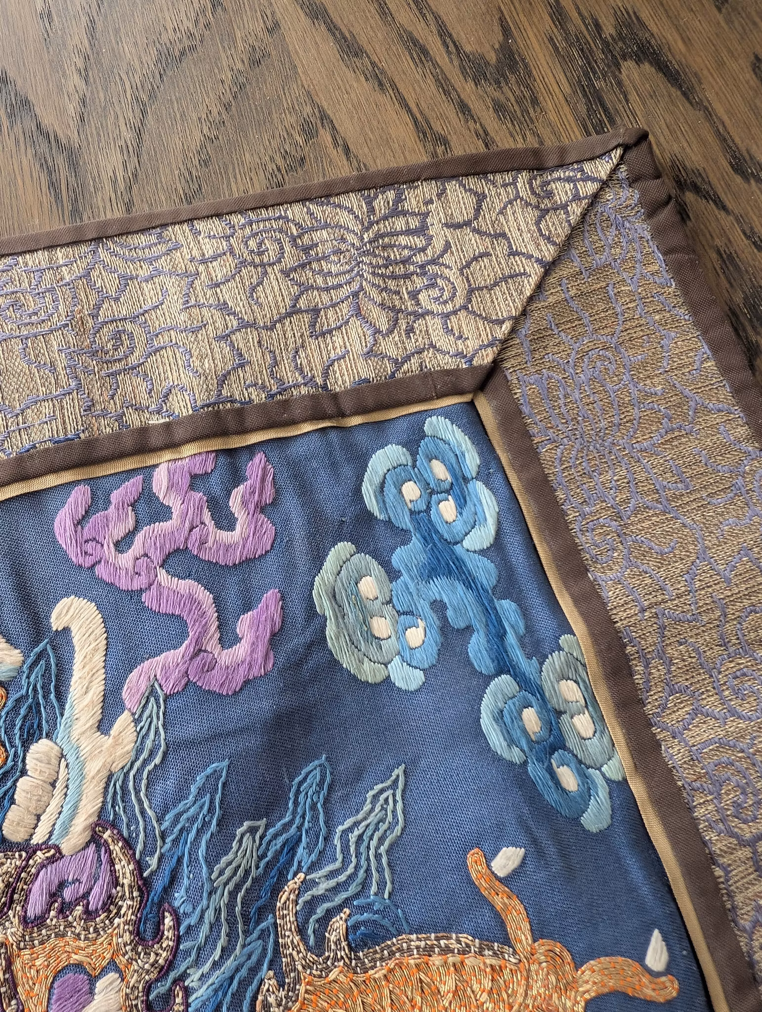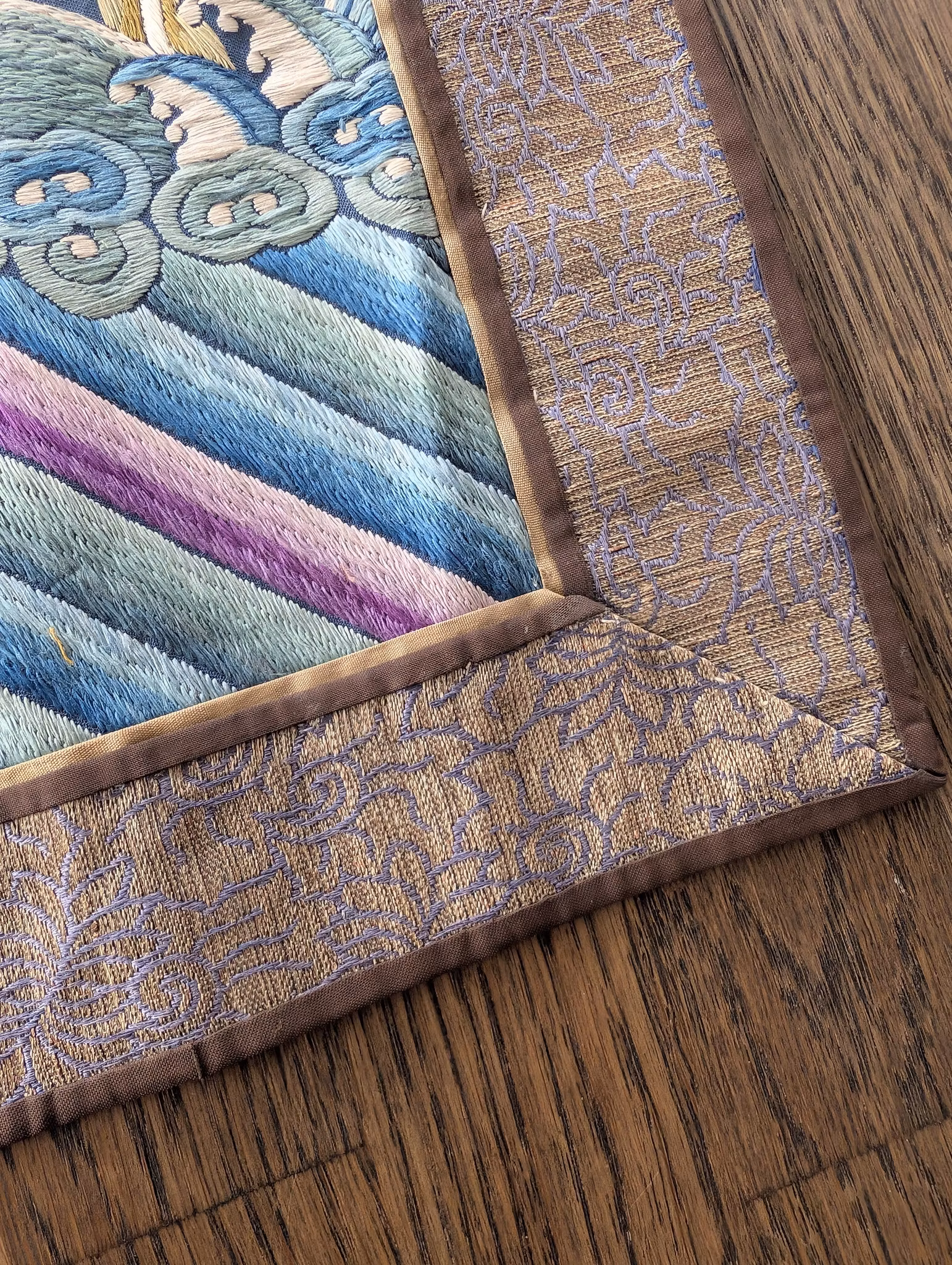 Textile fragment from an antique Chinese Qing Dynasty Jifu / Dragon Robe. The textile was cut from the shoulder of the robe.