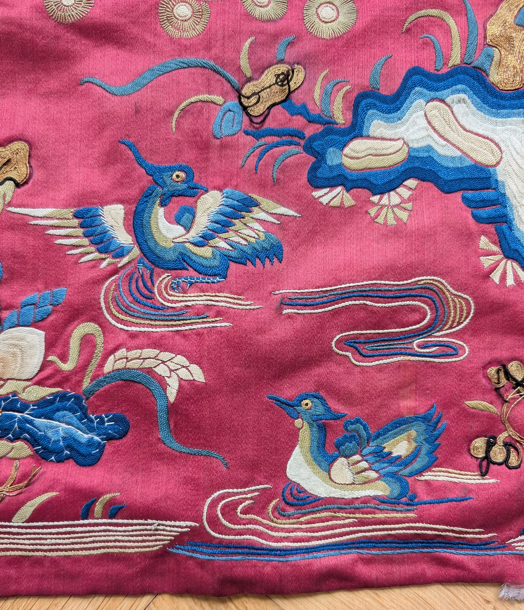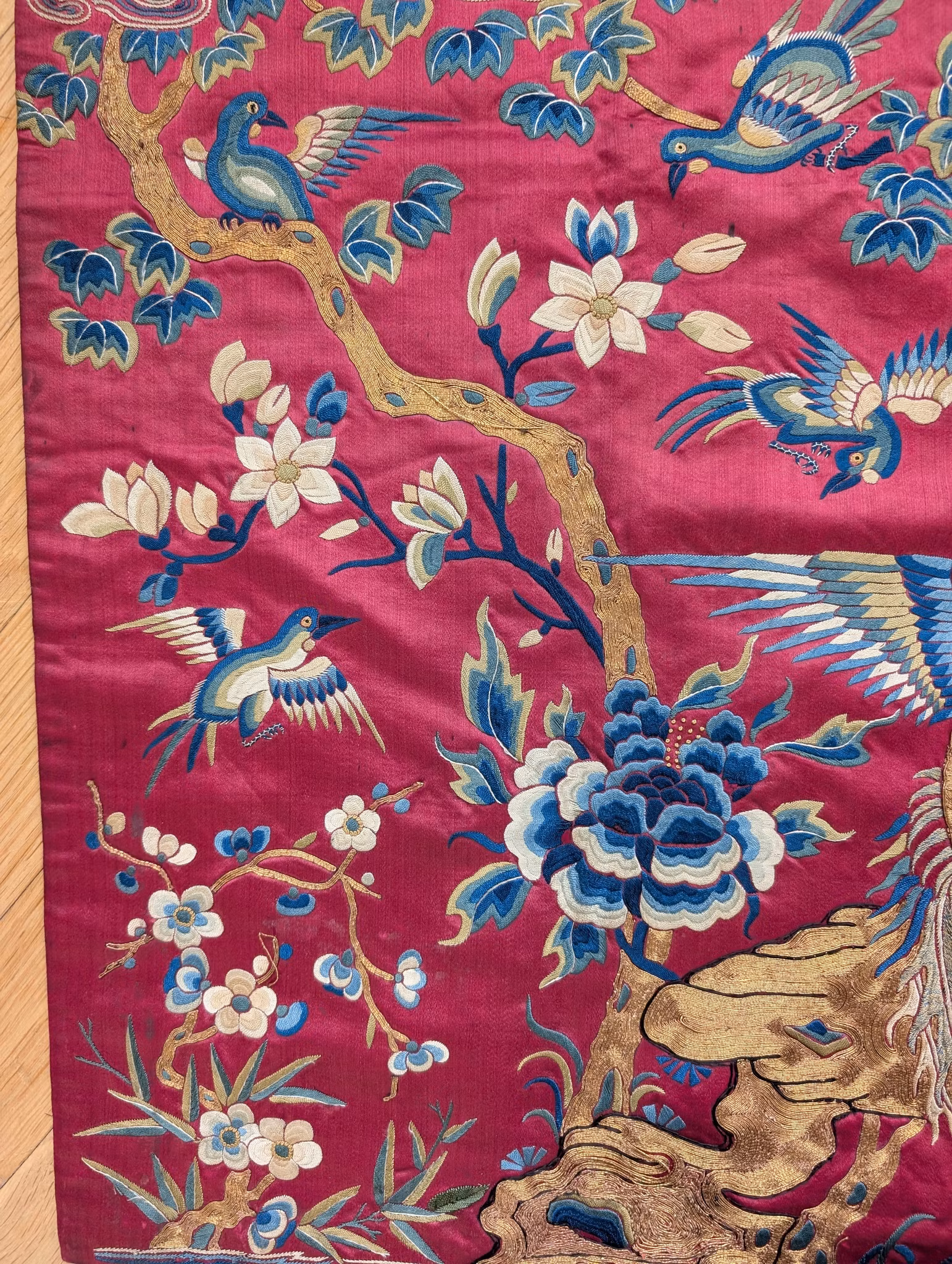 Beautiful large silk embroidery with Pheonix, Cranes, Mandarin Ducks in a lotus pond, three friends of winter and various fruits and flowers.