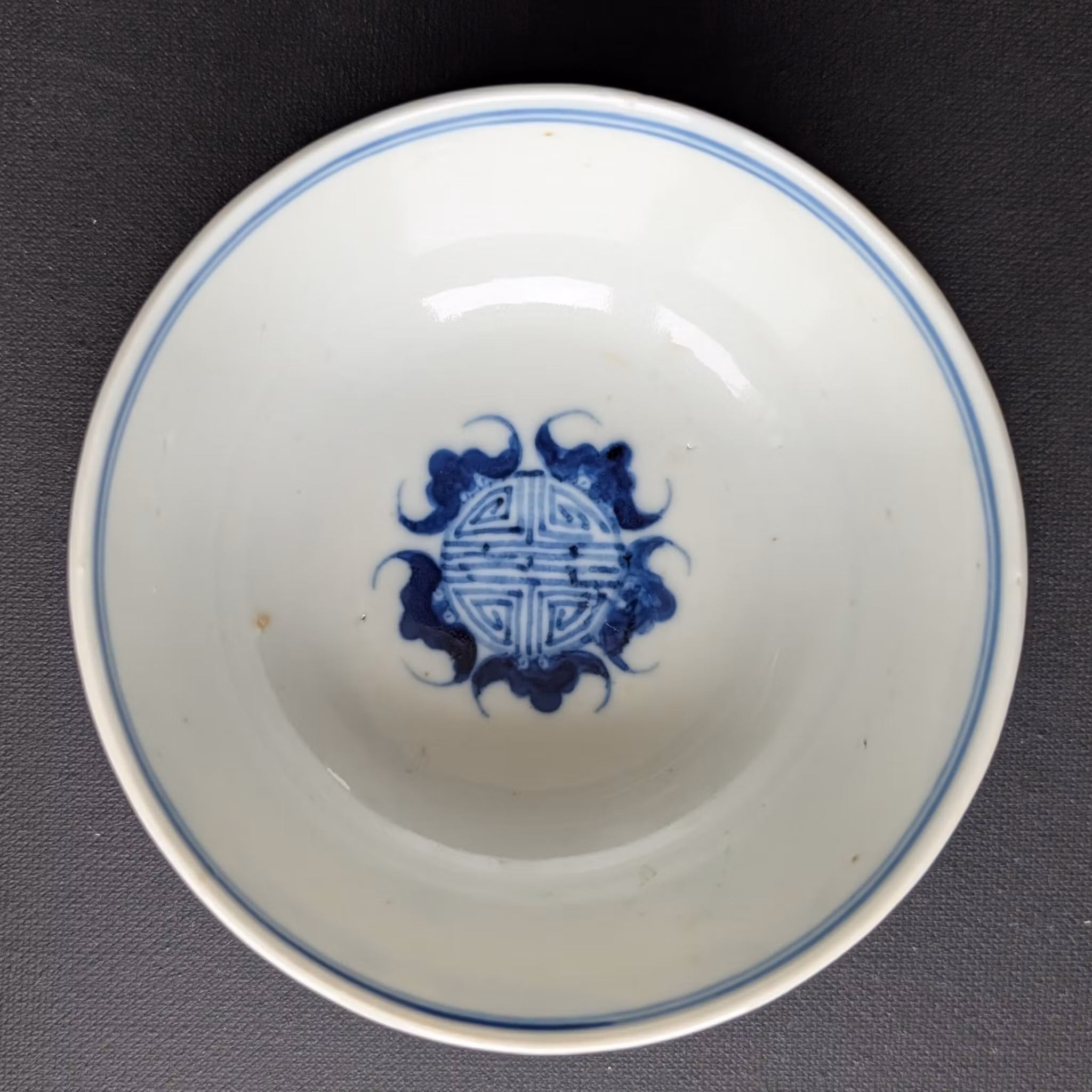 Beautiful blue and white bowl decorated with bats and shou characters Longevity pattern!