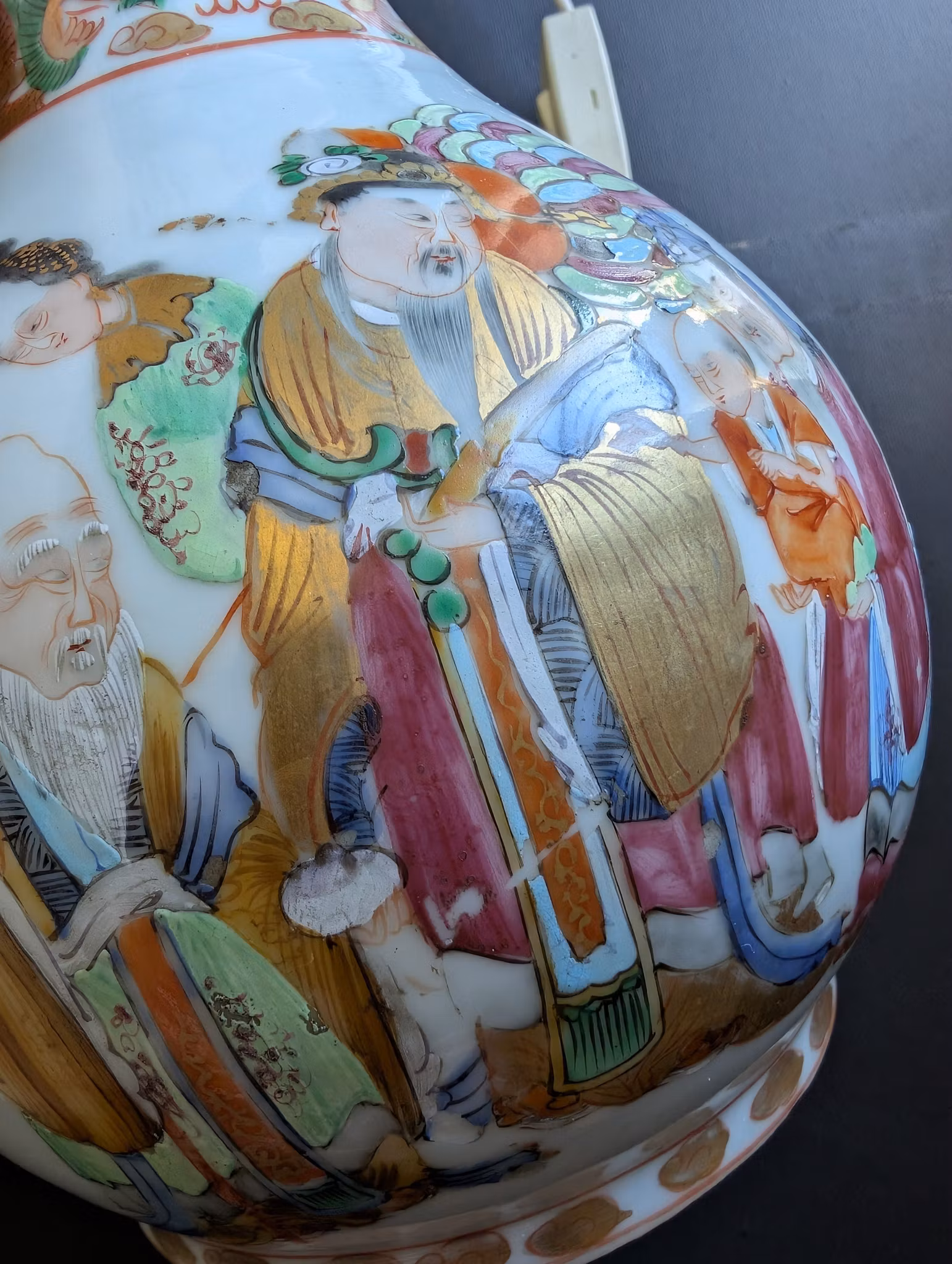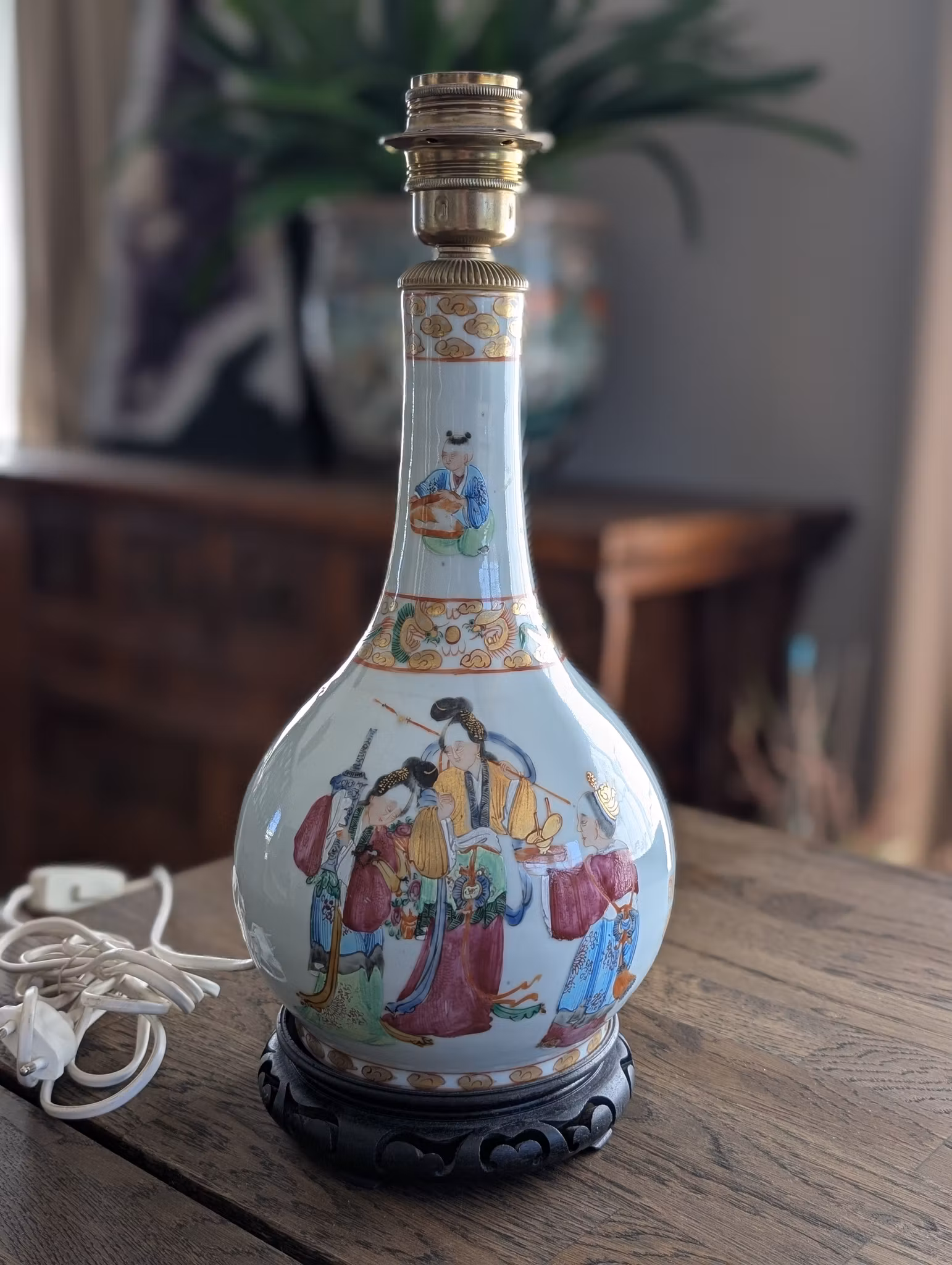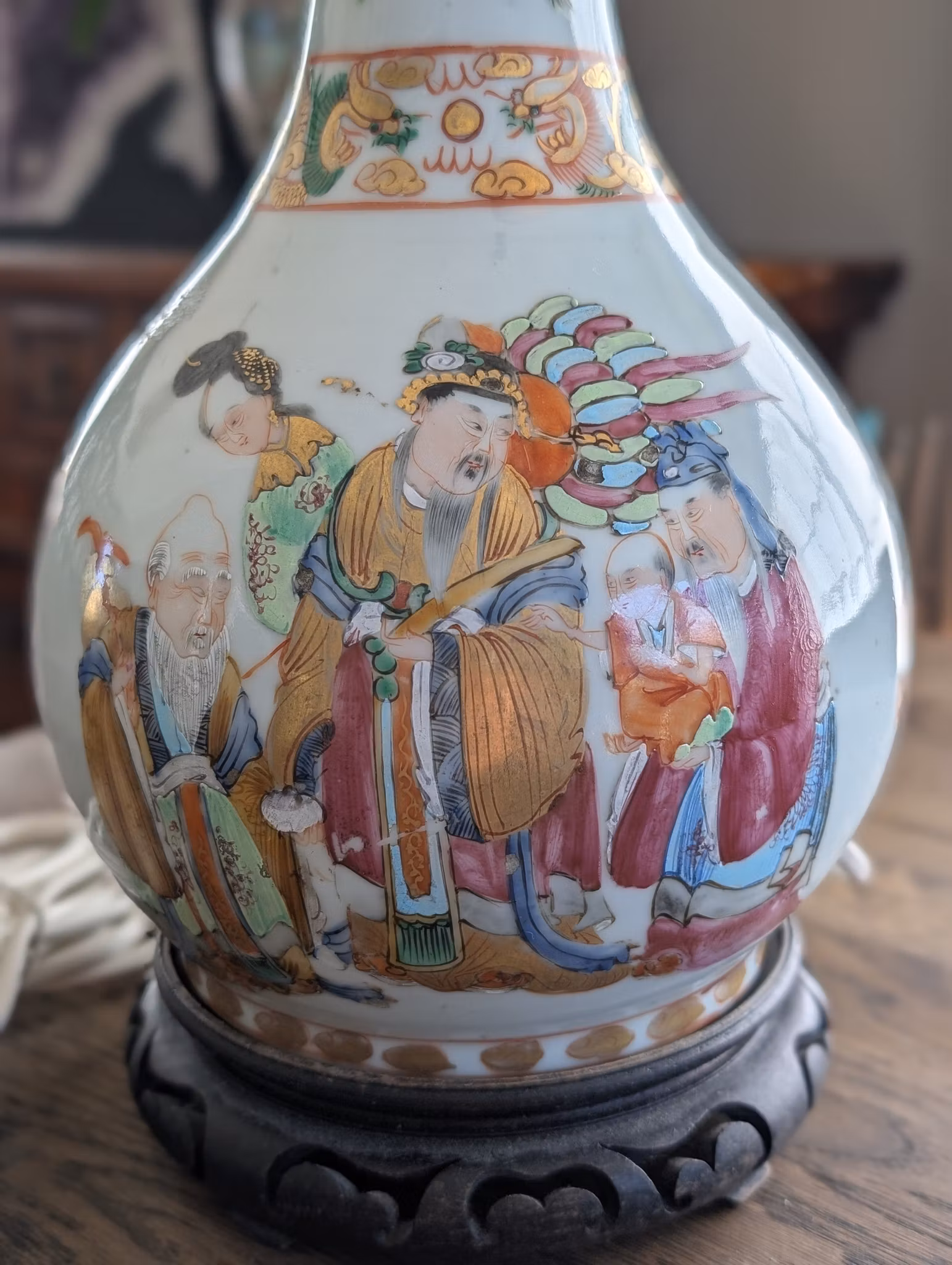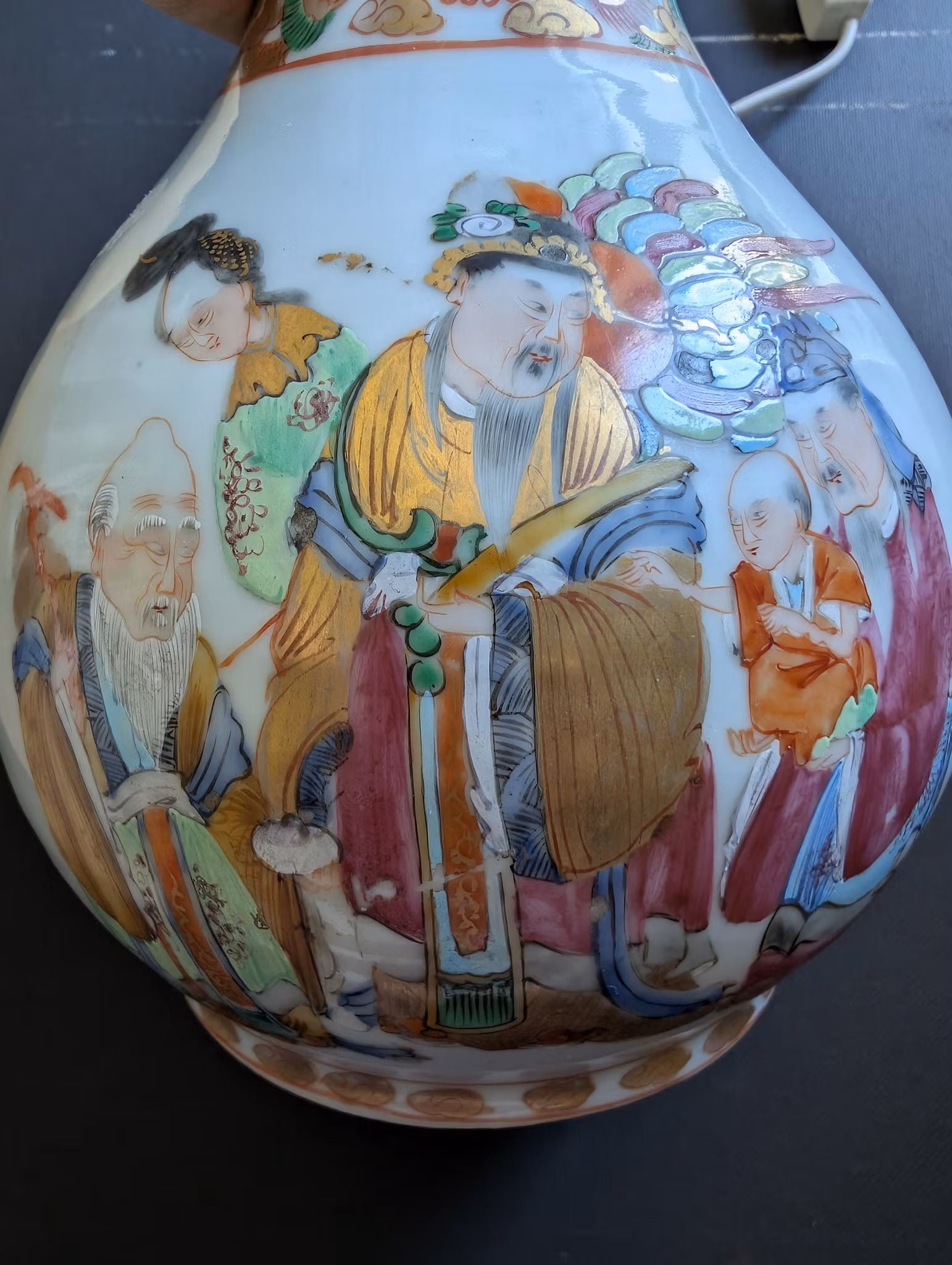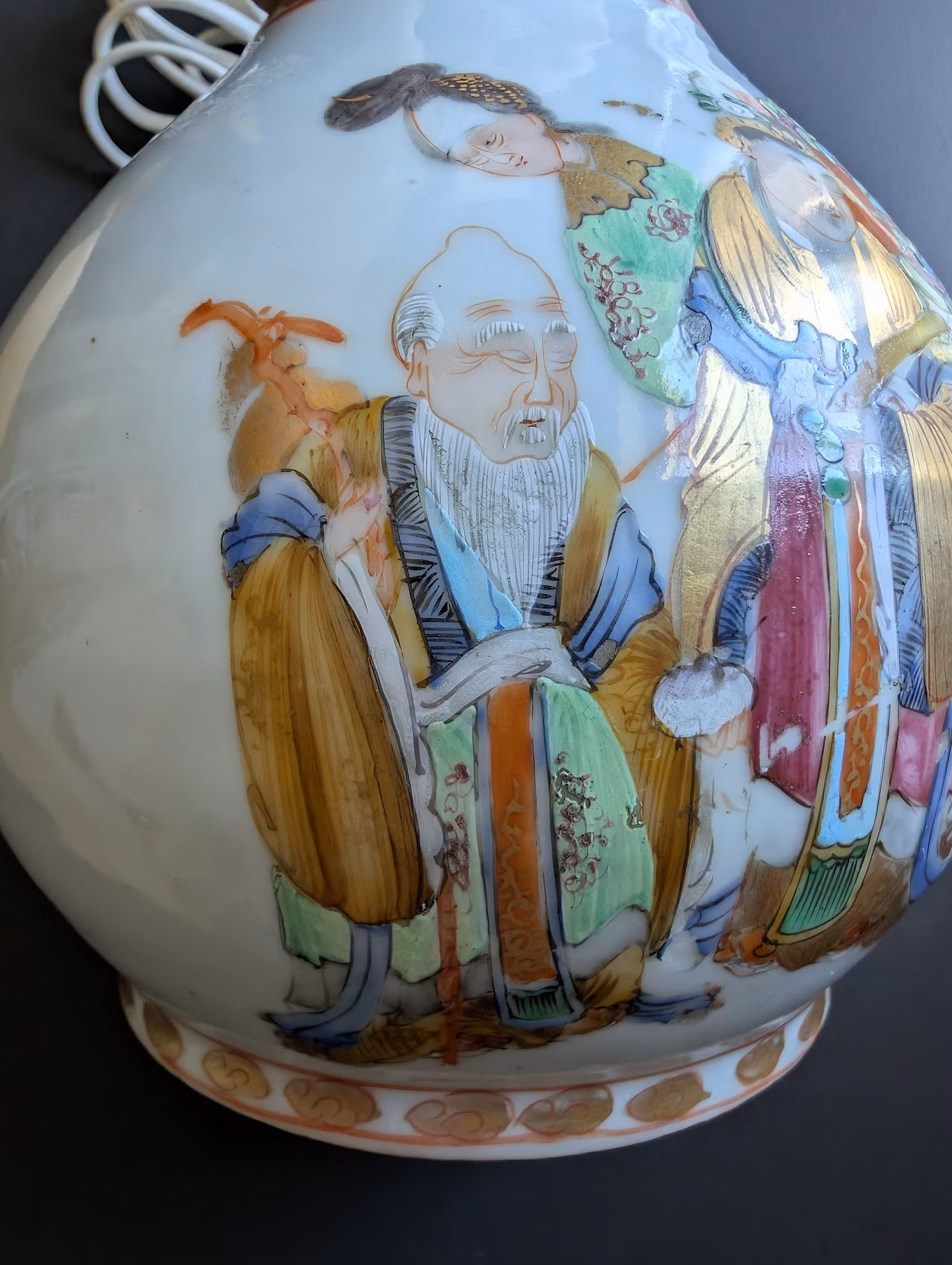 Very Beautiful bottle vase made into a lamp. Decoration on one side of the three star goods 三星,and the other side with the quuen mother of the west 西王母.