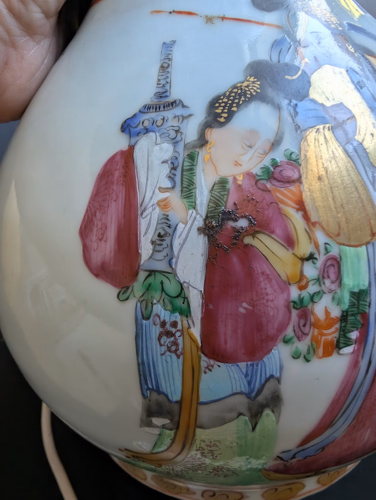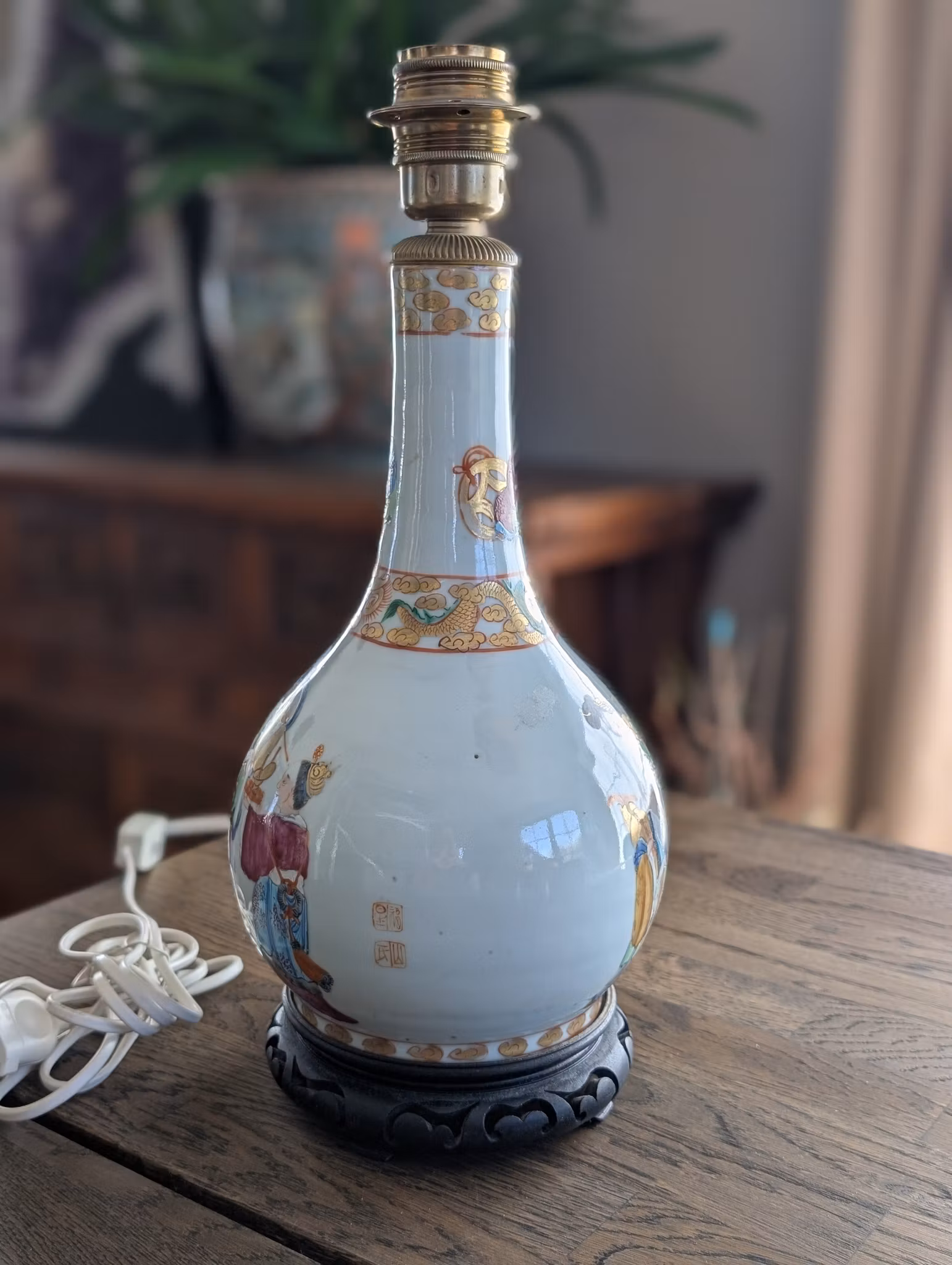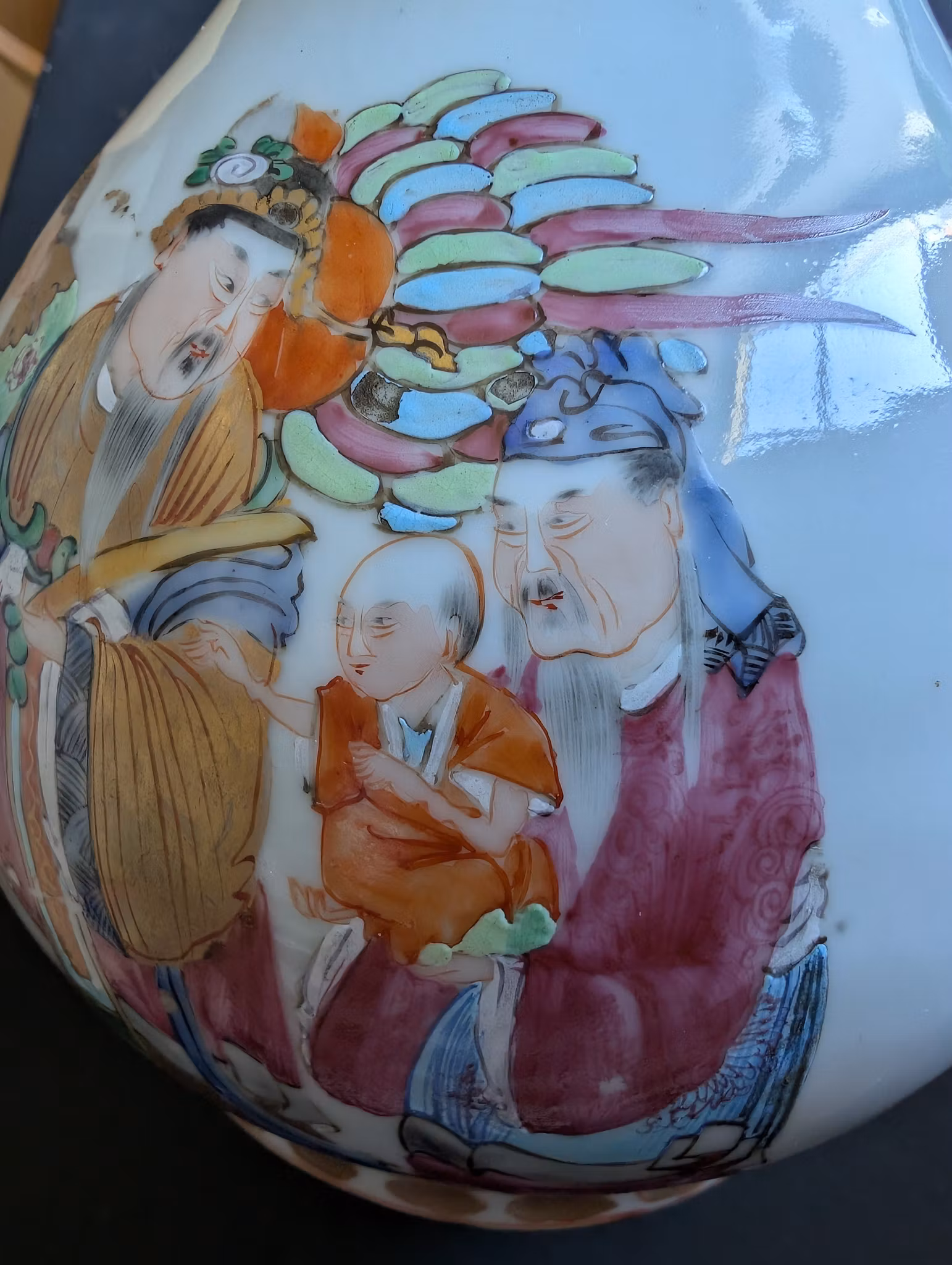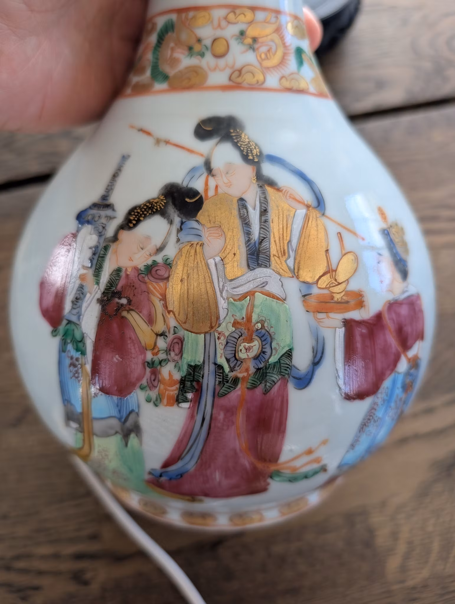 Very Beautiful bottle vase made into a lamp. Decoration on one side of the three star goods 三星,and the other side with the quuen mother of the west 西王母.
