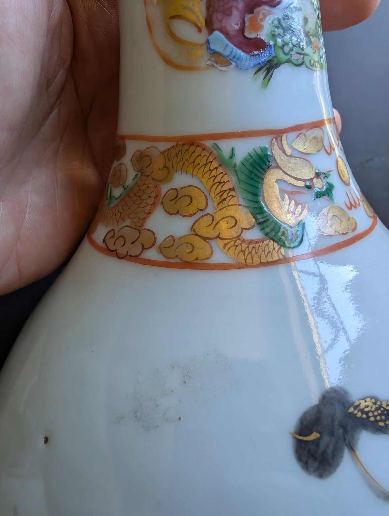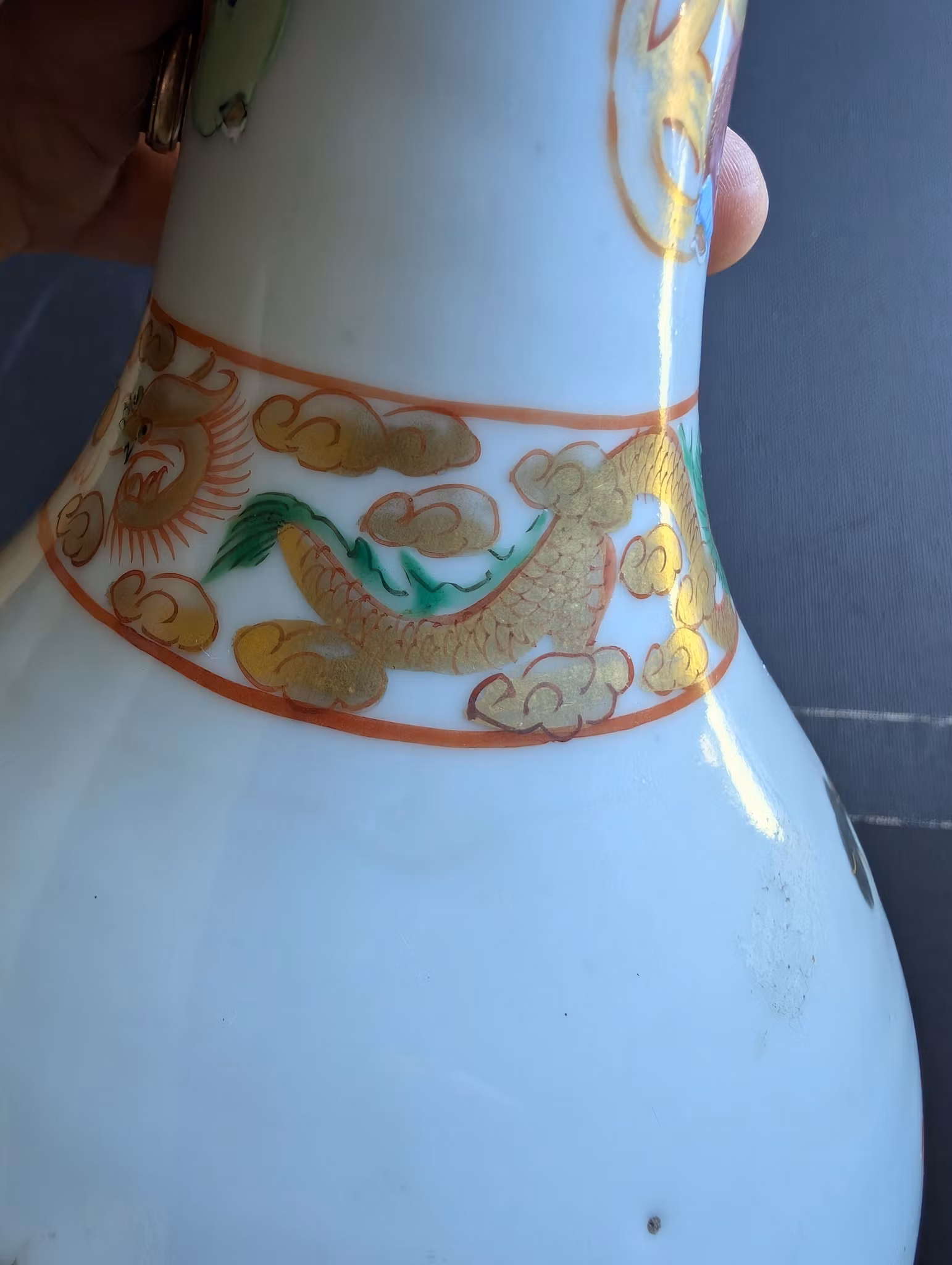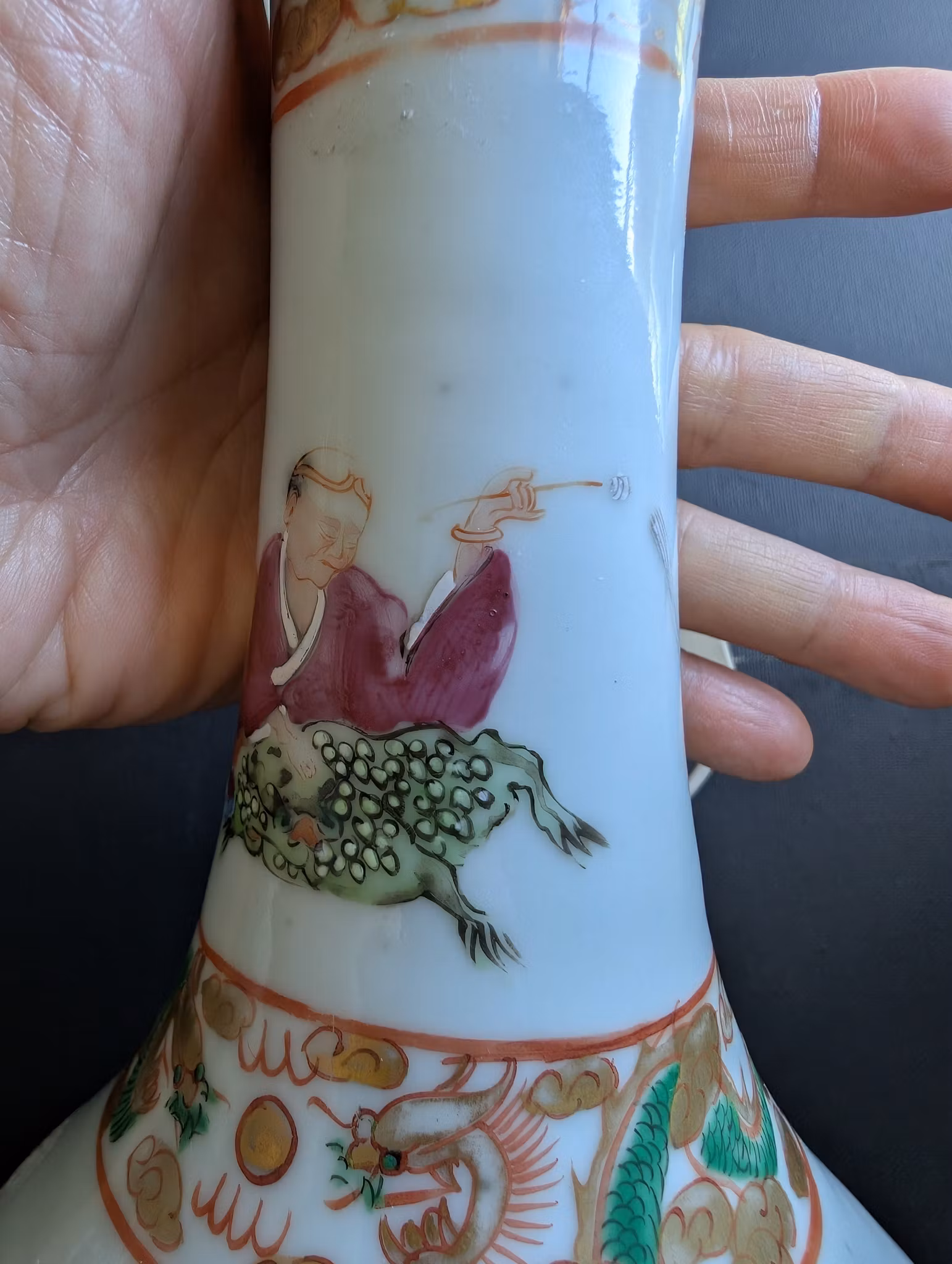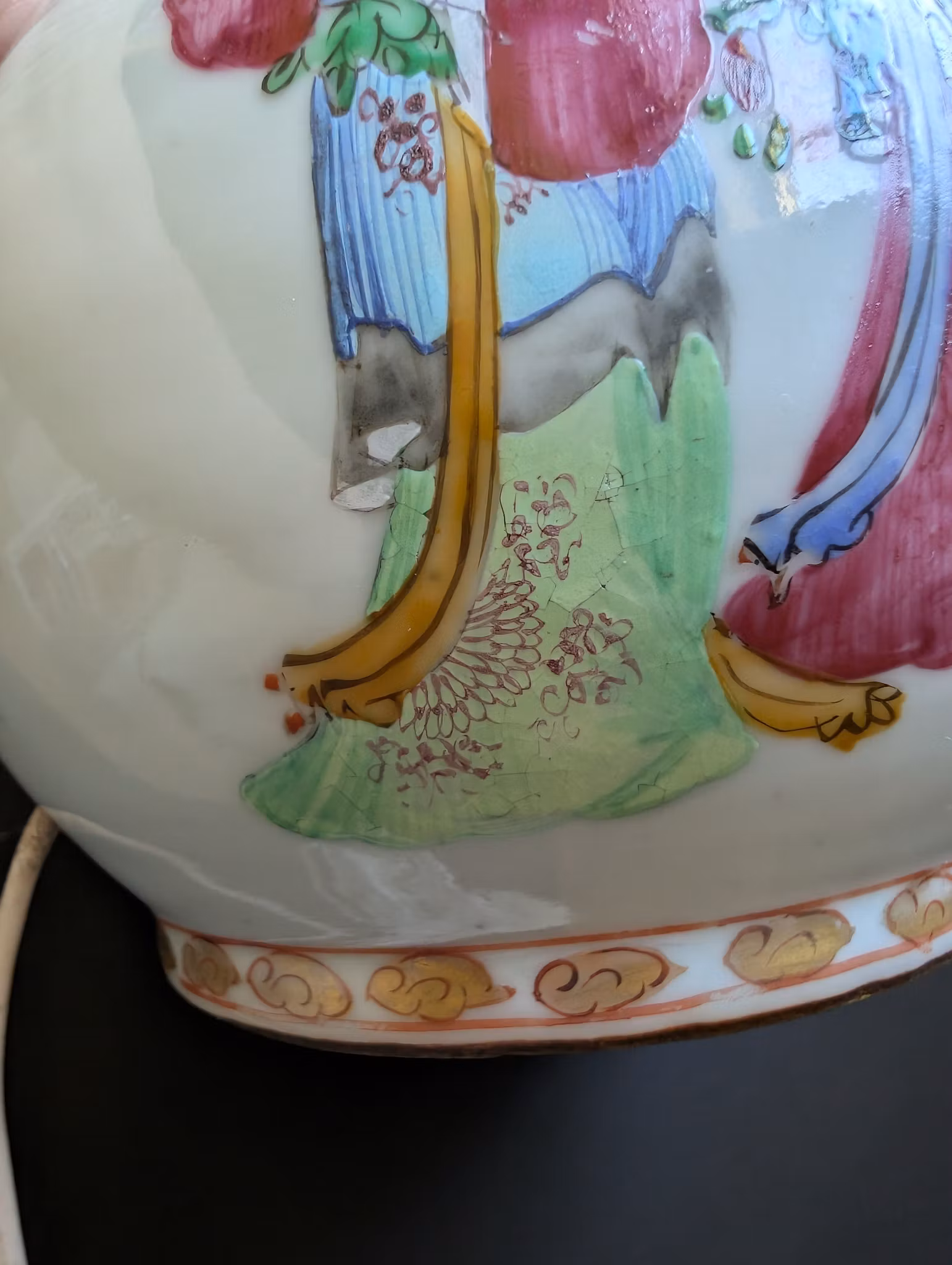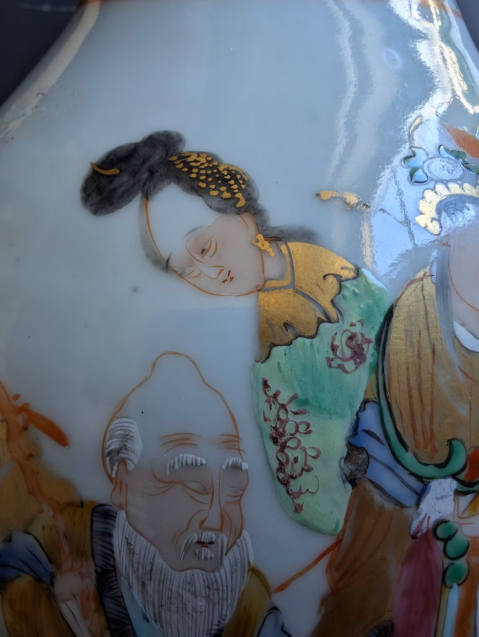 Very Beautiful bottle vase made into a lamp. Decoration on one side of the three star goods 三星,and the other side with the quuen mother of the west 西王母.