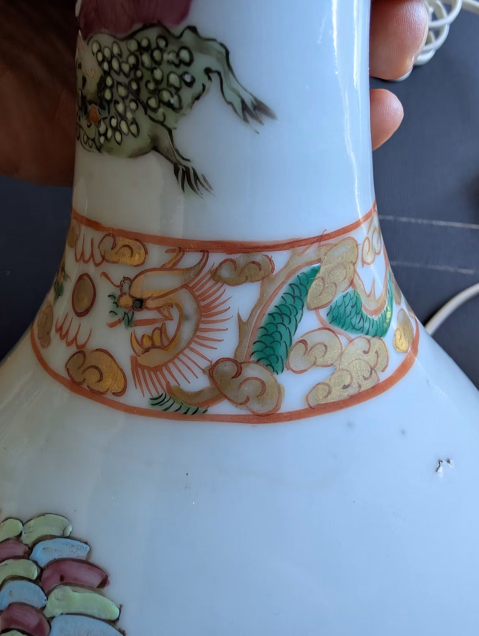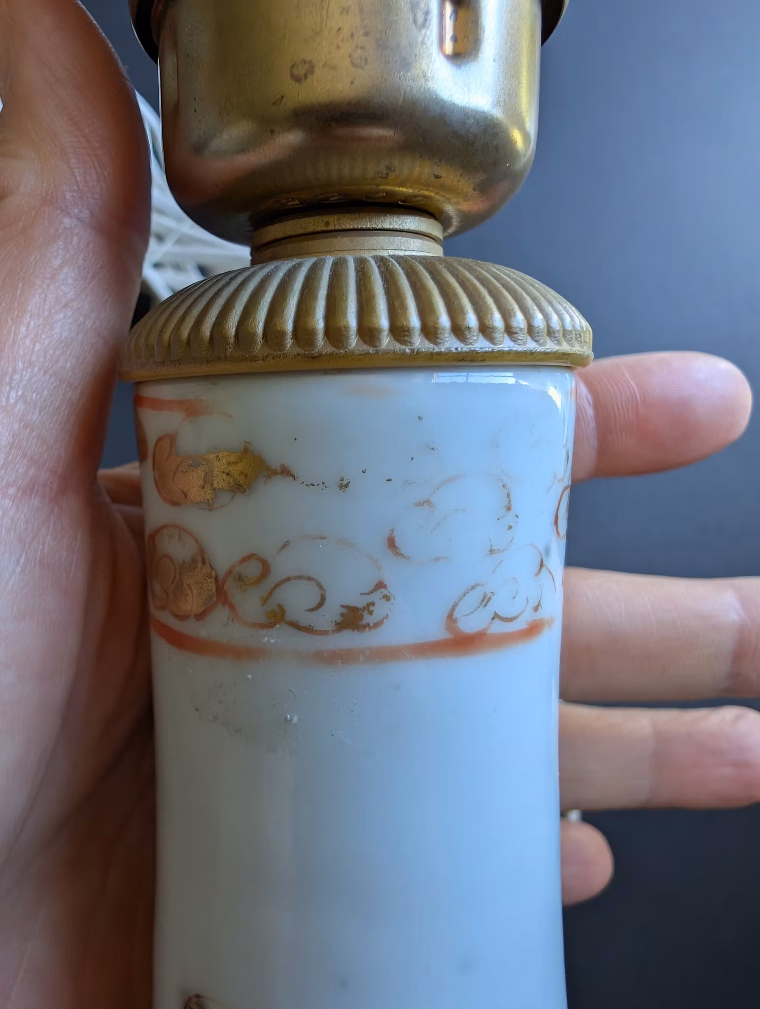 It has a drilled hole for the cable on the side. Mounted for lamp at the top. Has not removed the metal mount to examine the inside of the vase. The lamp is functioning when tested and is fitted with a North European socket. No guarantee is given on the function of the antique electric lamp.