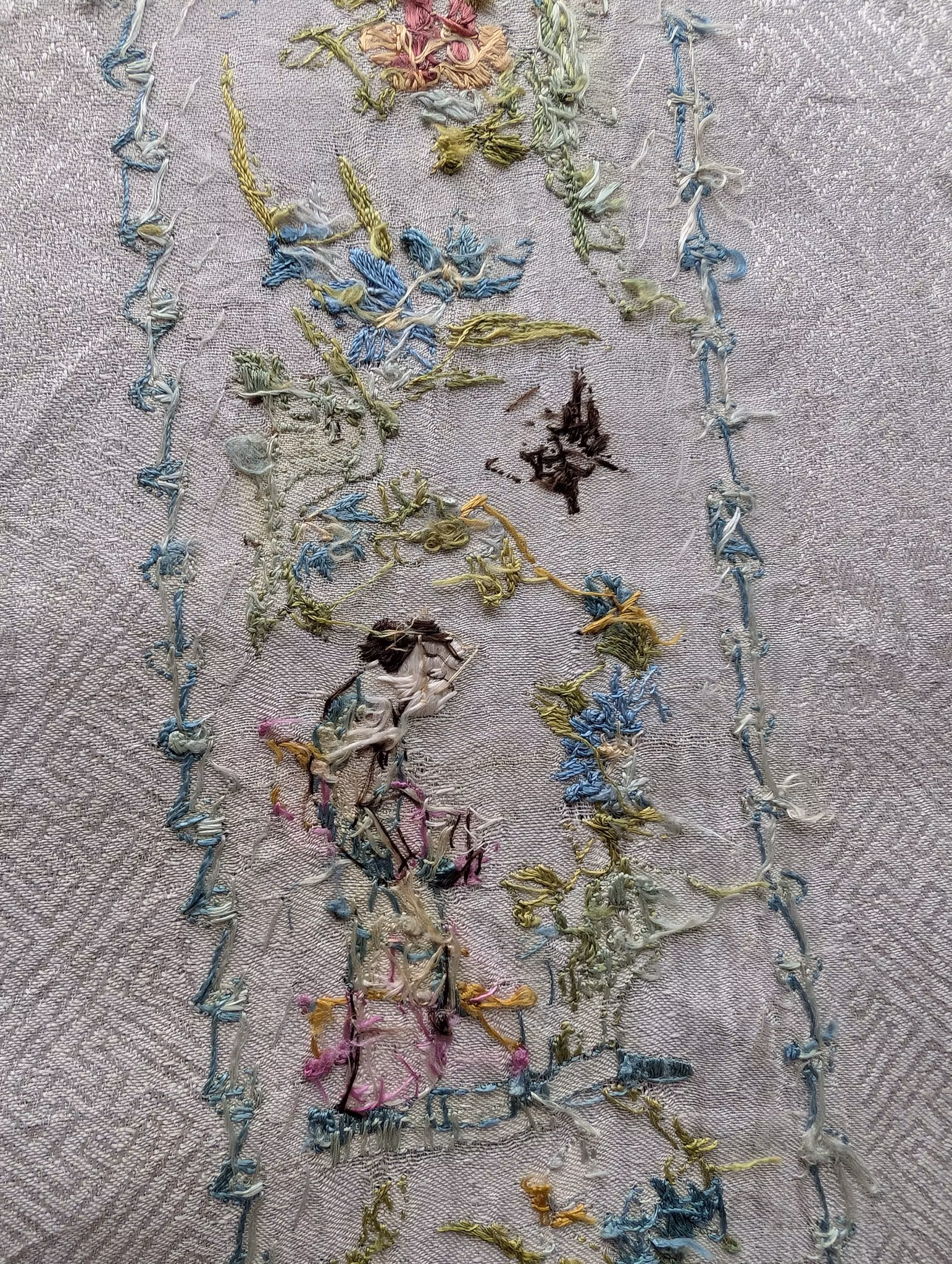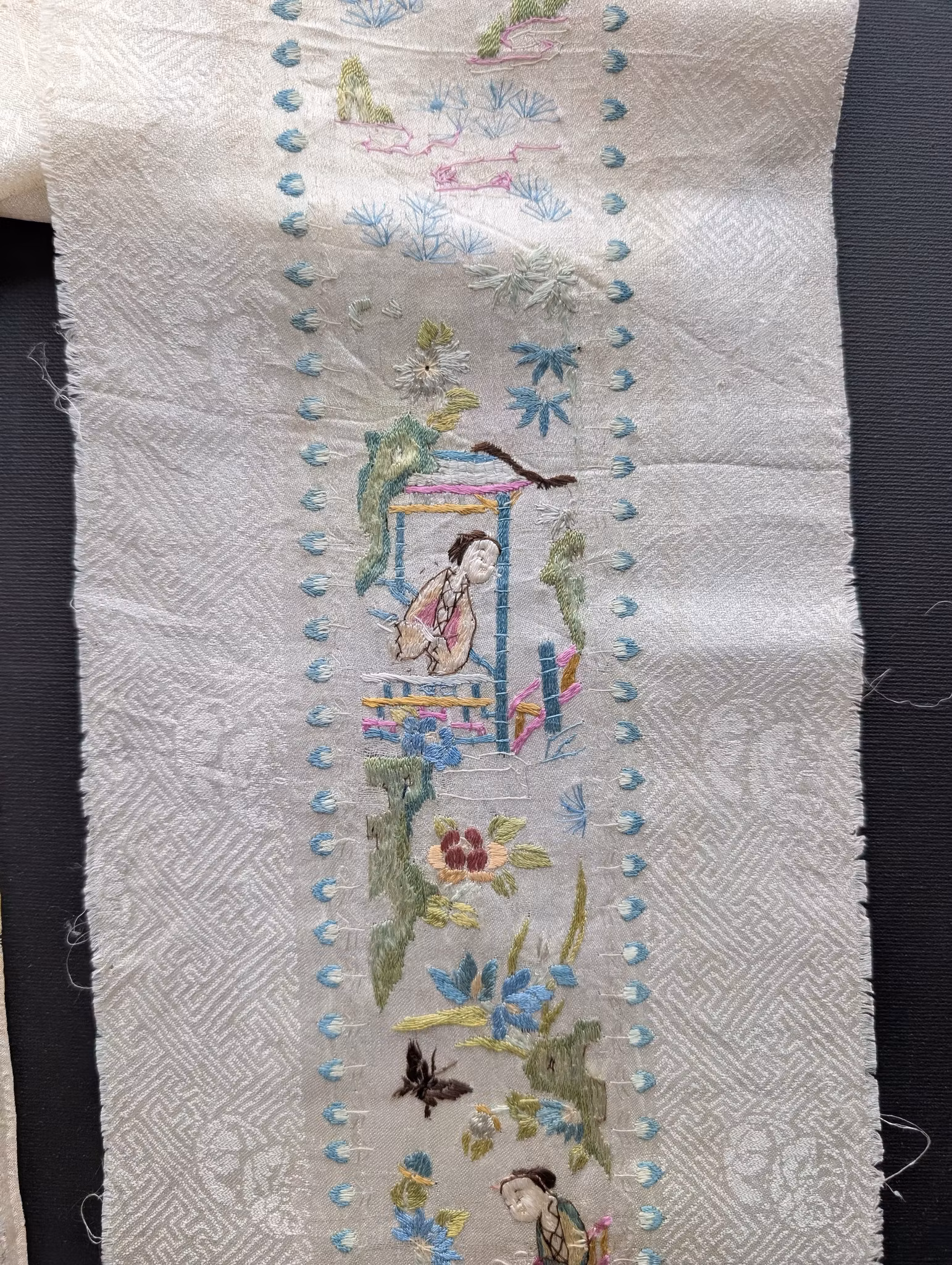 Condition: Fading, pulls, damages, stains. Some of the silk frames lining slightly open. Please look carefully at the details on the pictures.