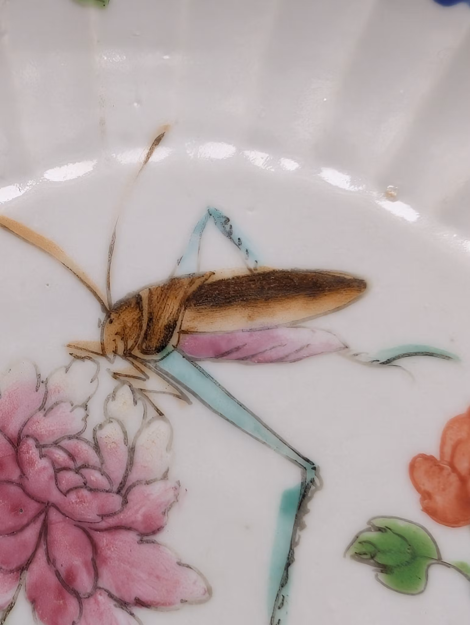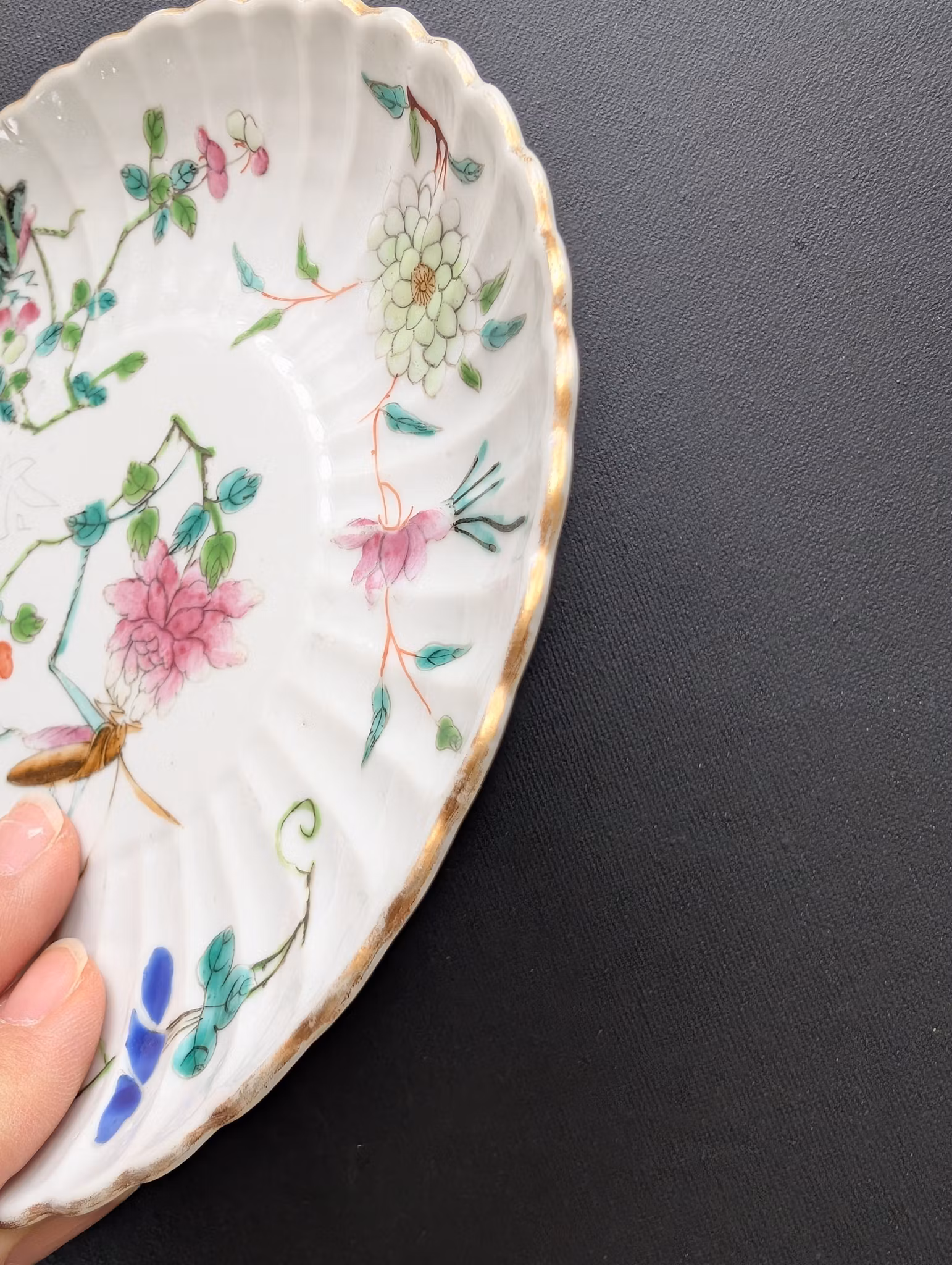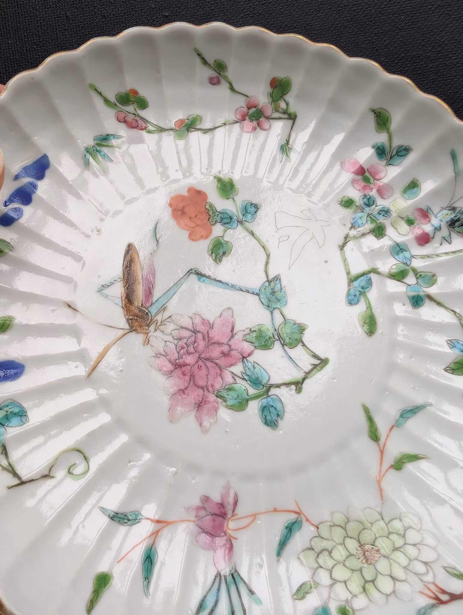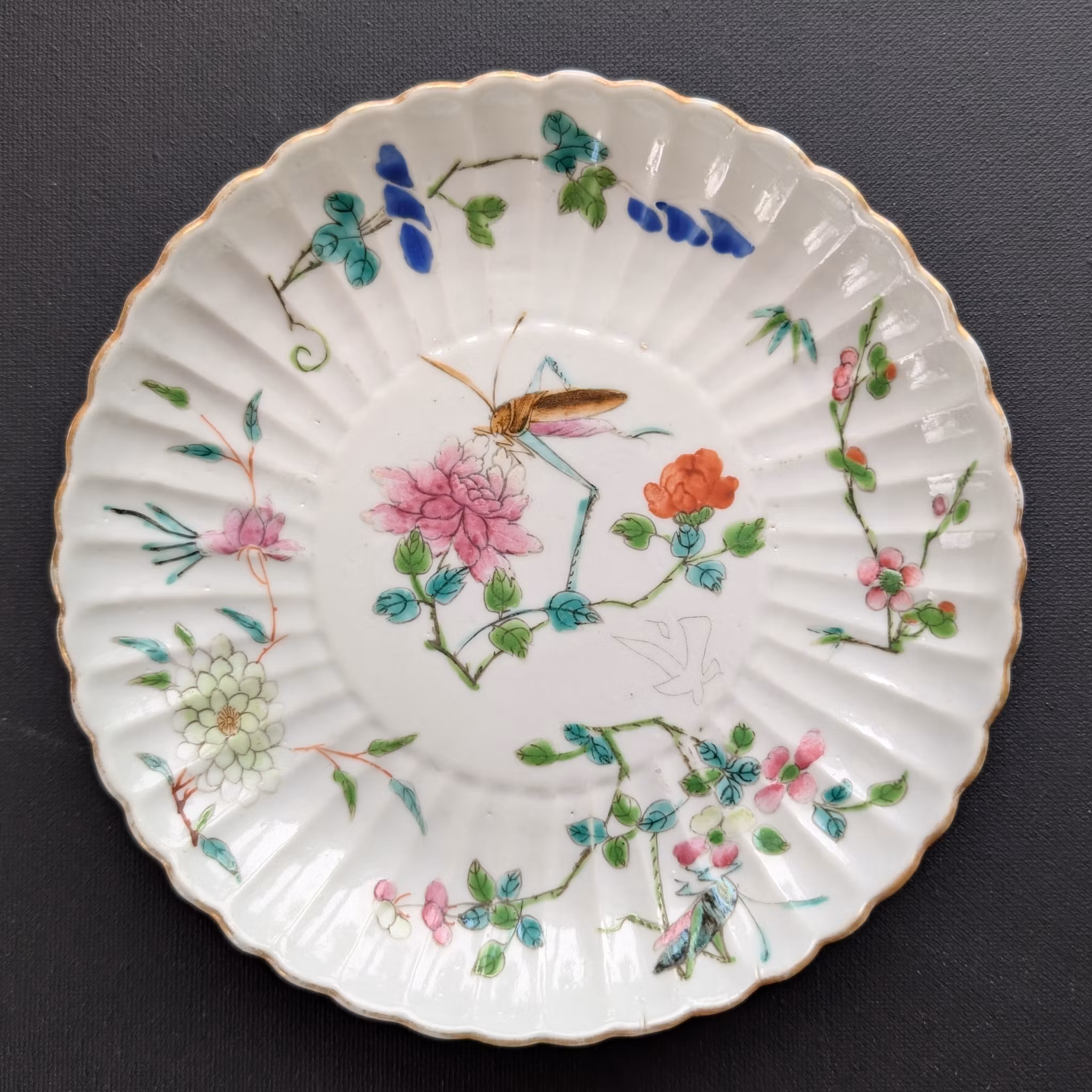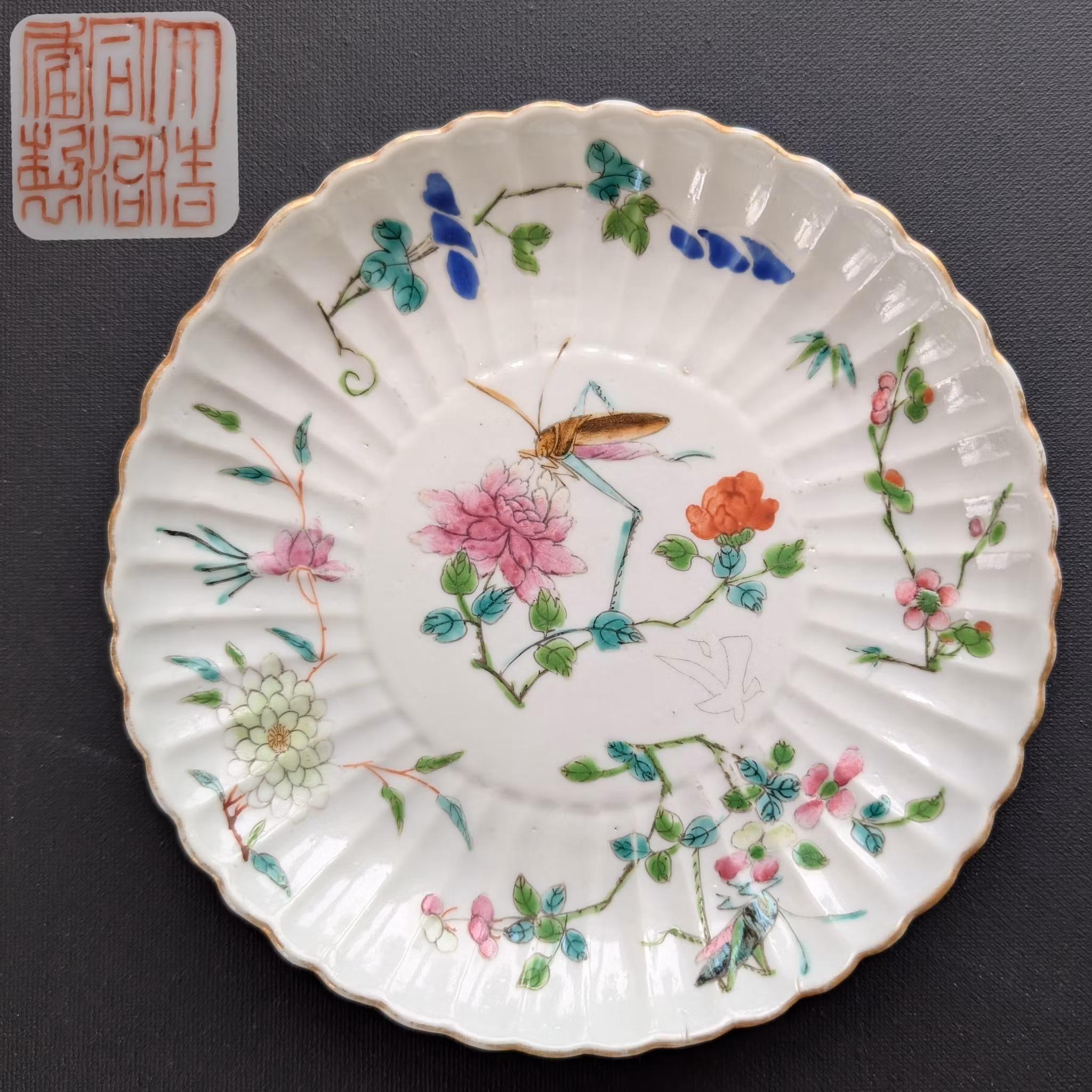 Beautiful plate decorated with various flowers and two insects. Back with handwritten Tongzhi six character mark.