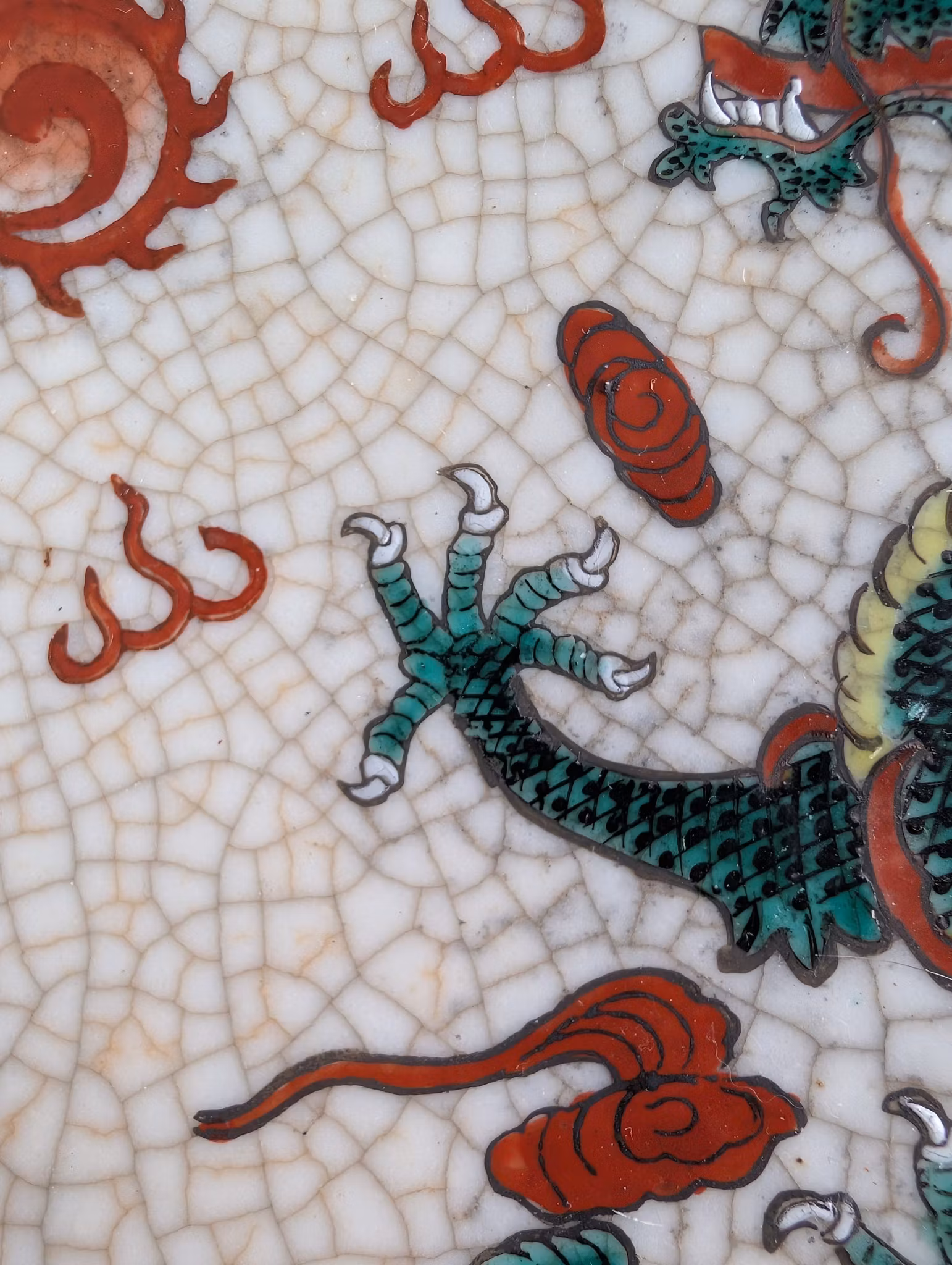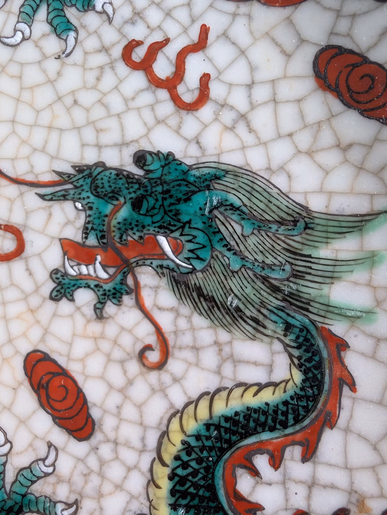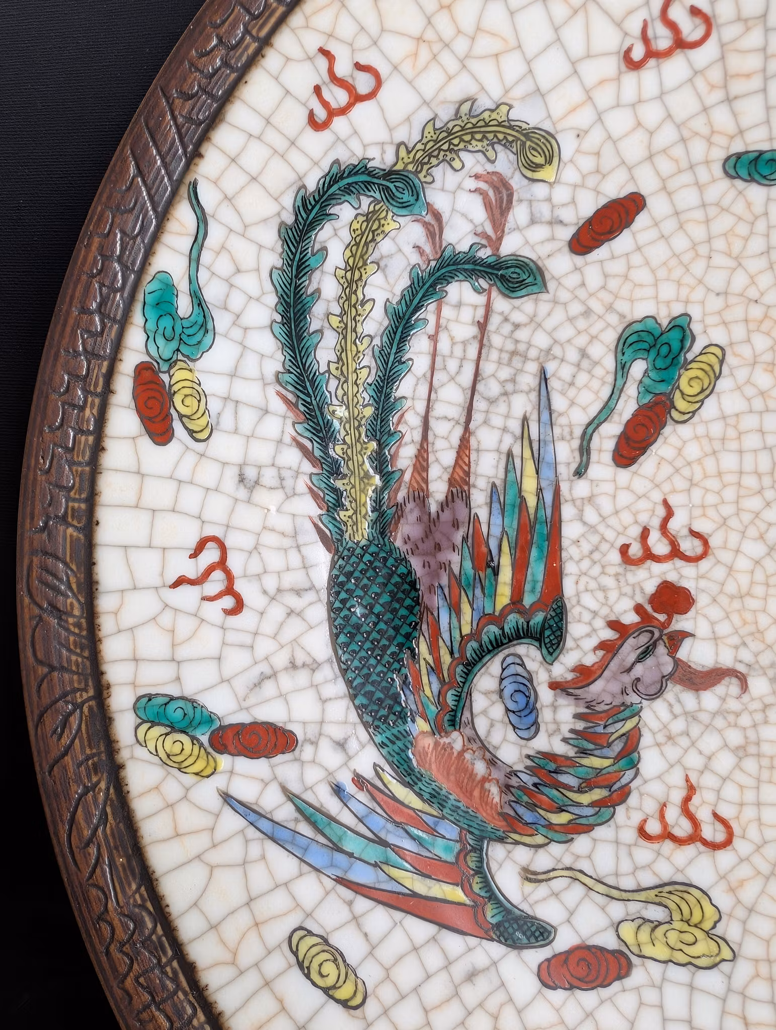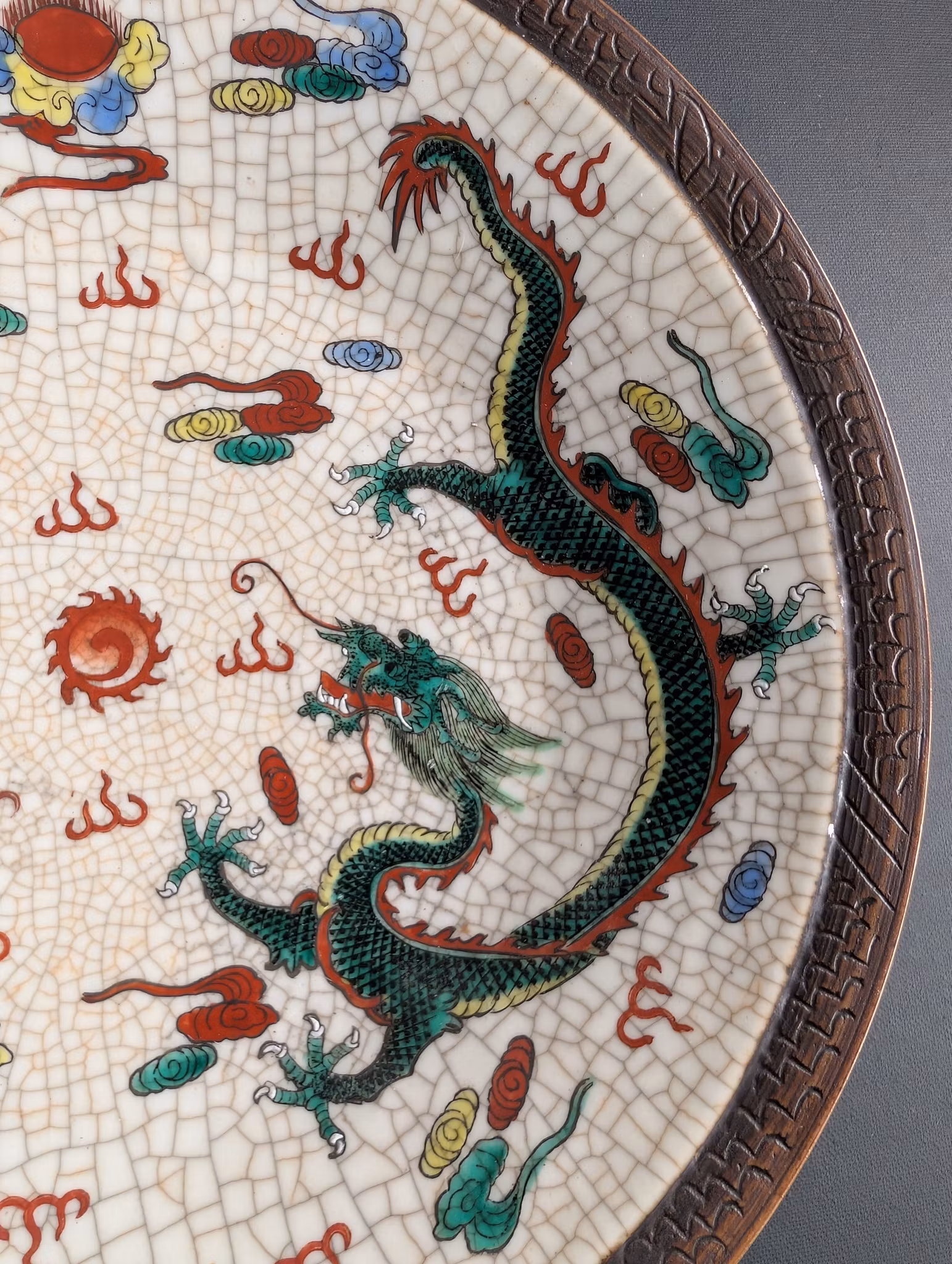 Large vintage Chinese porcelain charger dragon and phoenix Nanjing / Nanking Crackle ware #2861