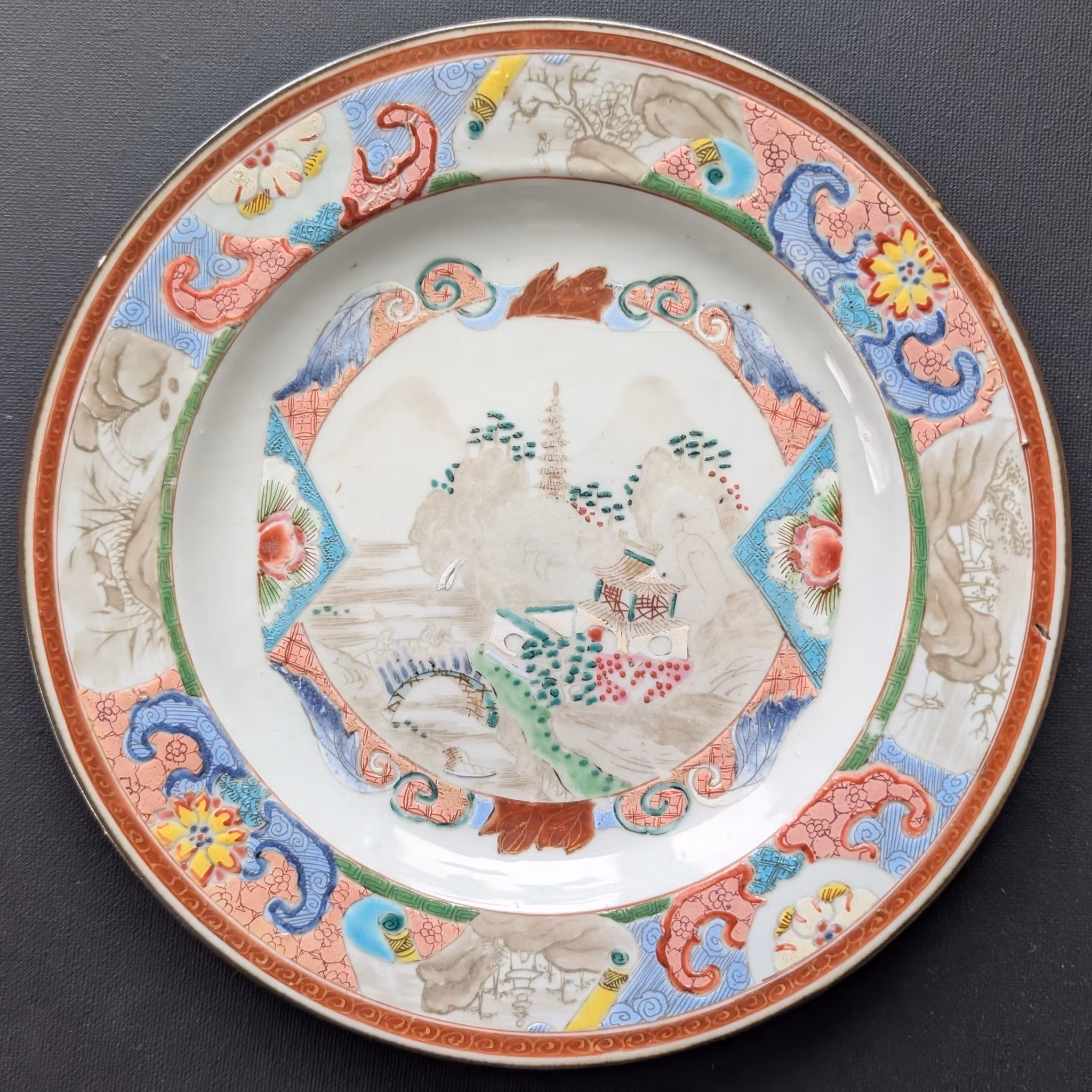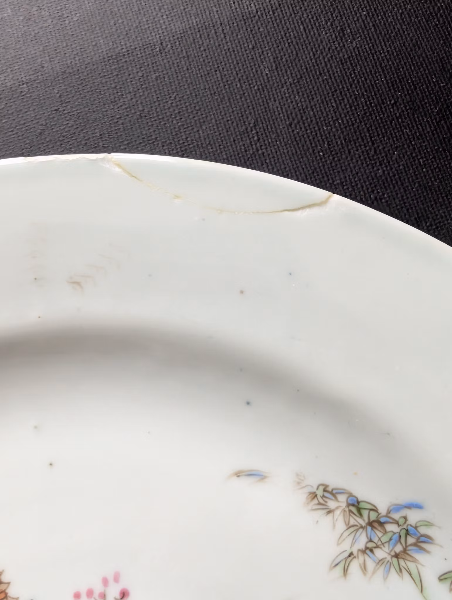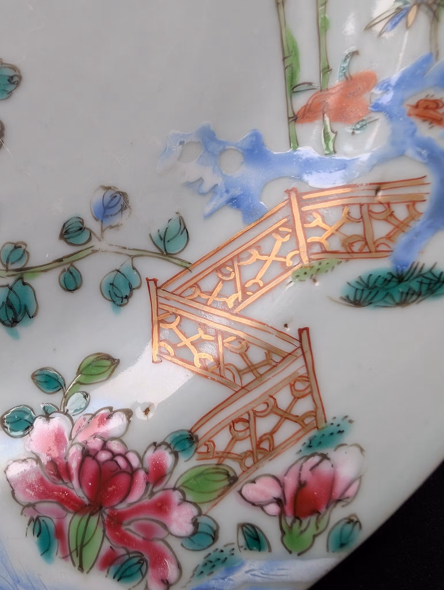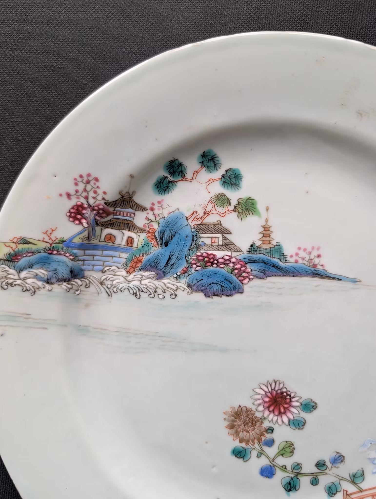 Two Chinese antique famille rose plate with landscape scenes, Qianlong period #2856, #2857 瑕疵品 &学习标本
