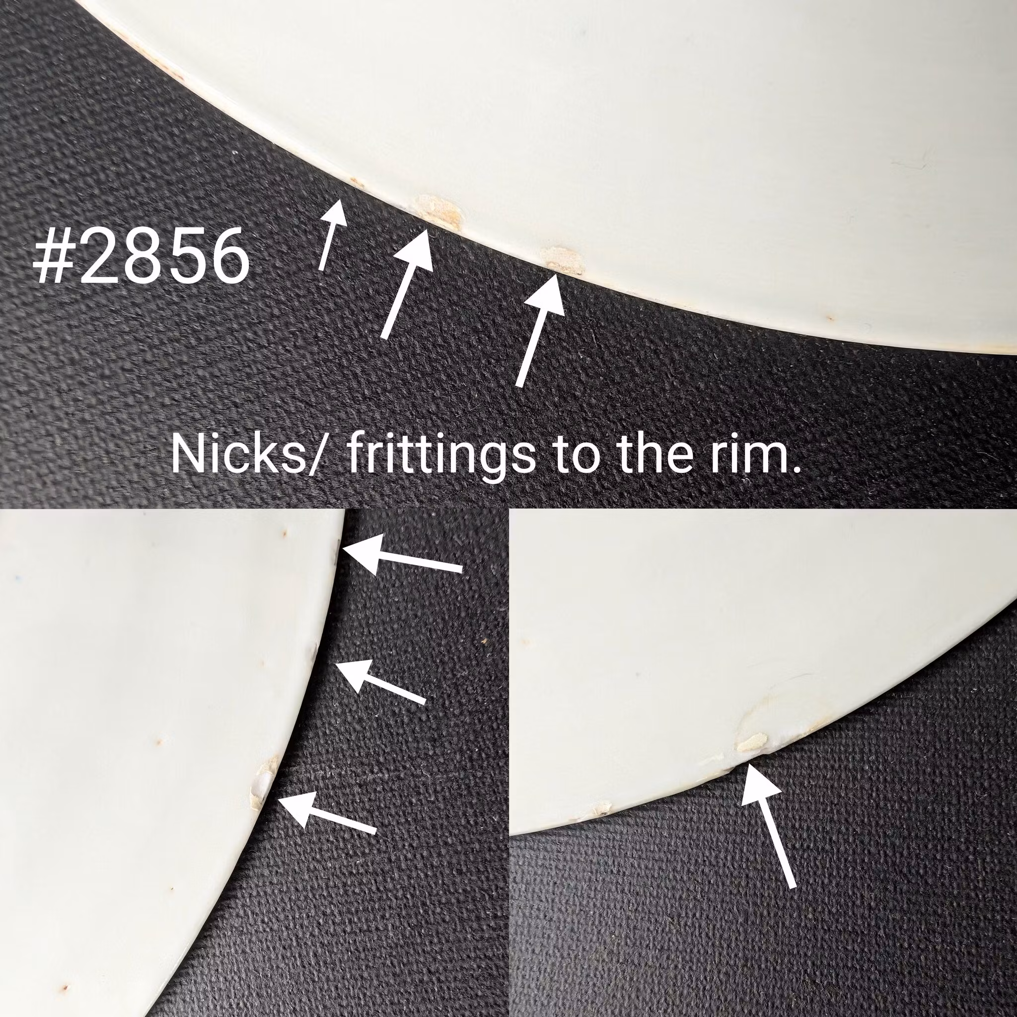 Check with UV light. #2857: Nicks to the rim, one star-hairline to the base. #2856: Nicks/ extensive fritting's to the rim, one long hairline to the rim, one re-glued chip to the rim. Both with wear and manufacturing flaws. See pictures for details.
