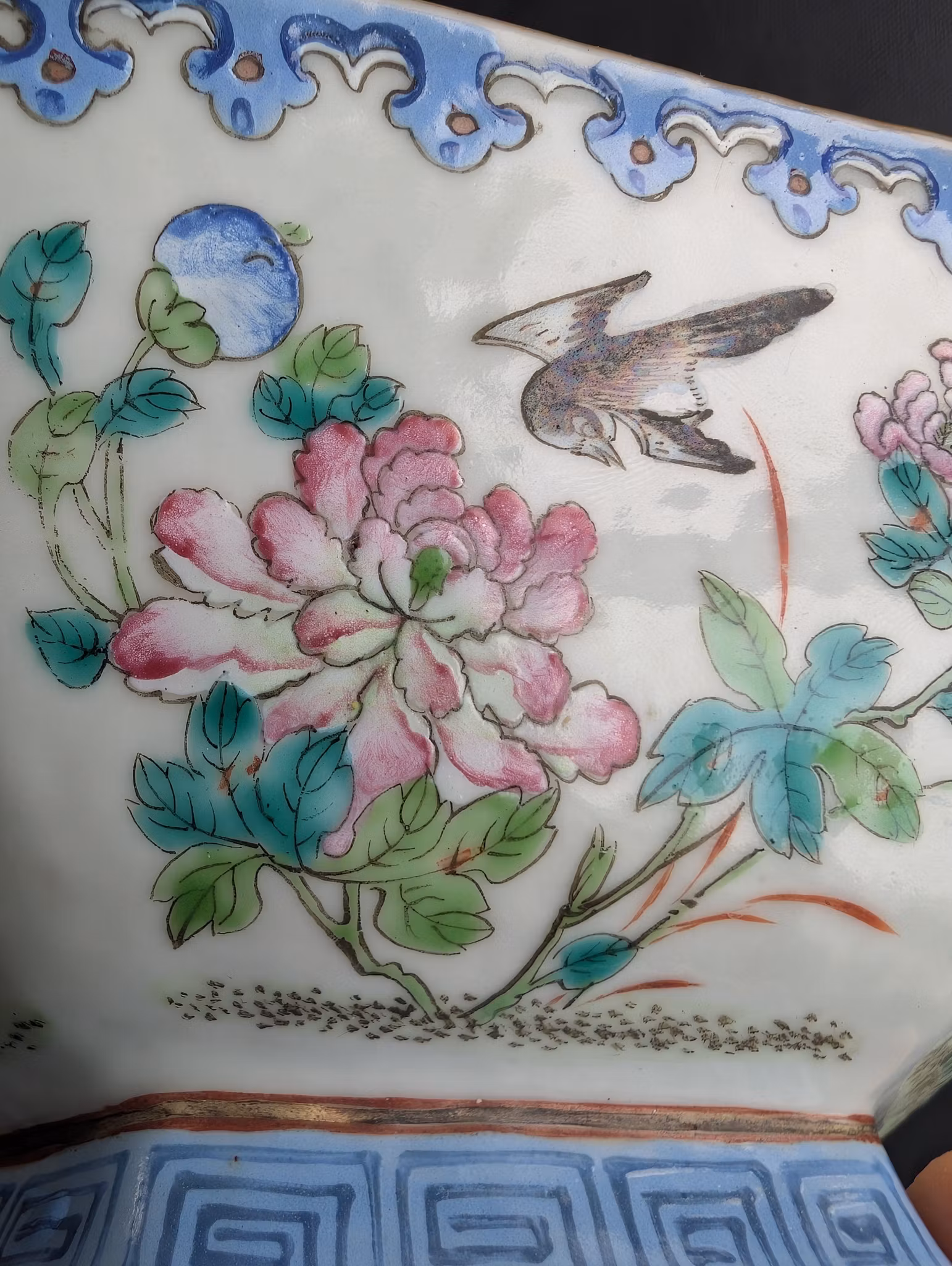Large hexagonal altar bowl decorated with flowers and birds. 富贵白头 一路连科 居家大吉 喜上眉梢 图
