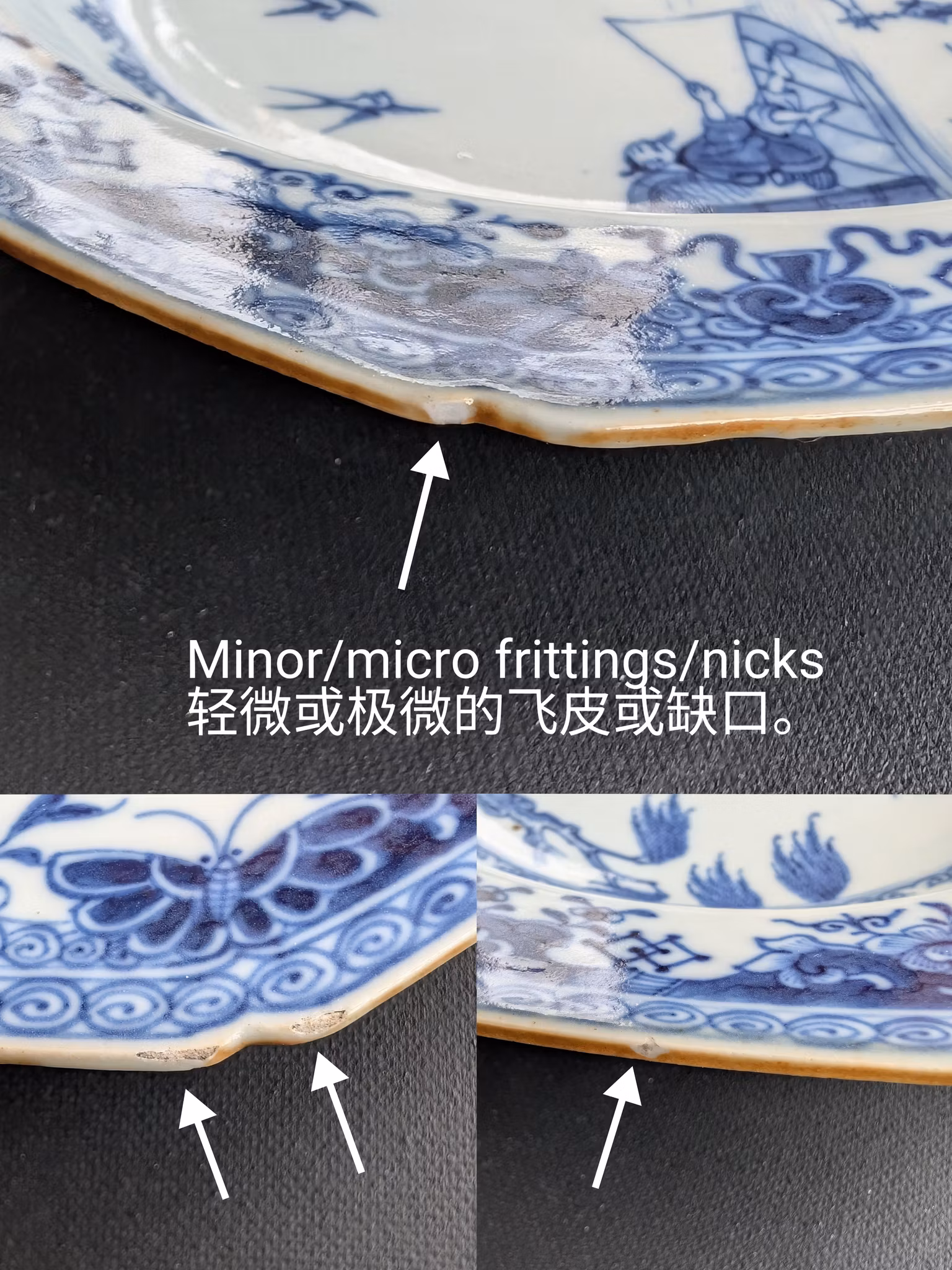 Checked with UV Light. Very nice condition. No hairline, no restoration. Minimal glaze frittings to the rim. General wear and manufacturing flaws.