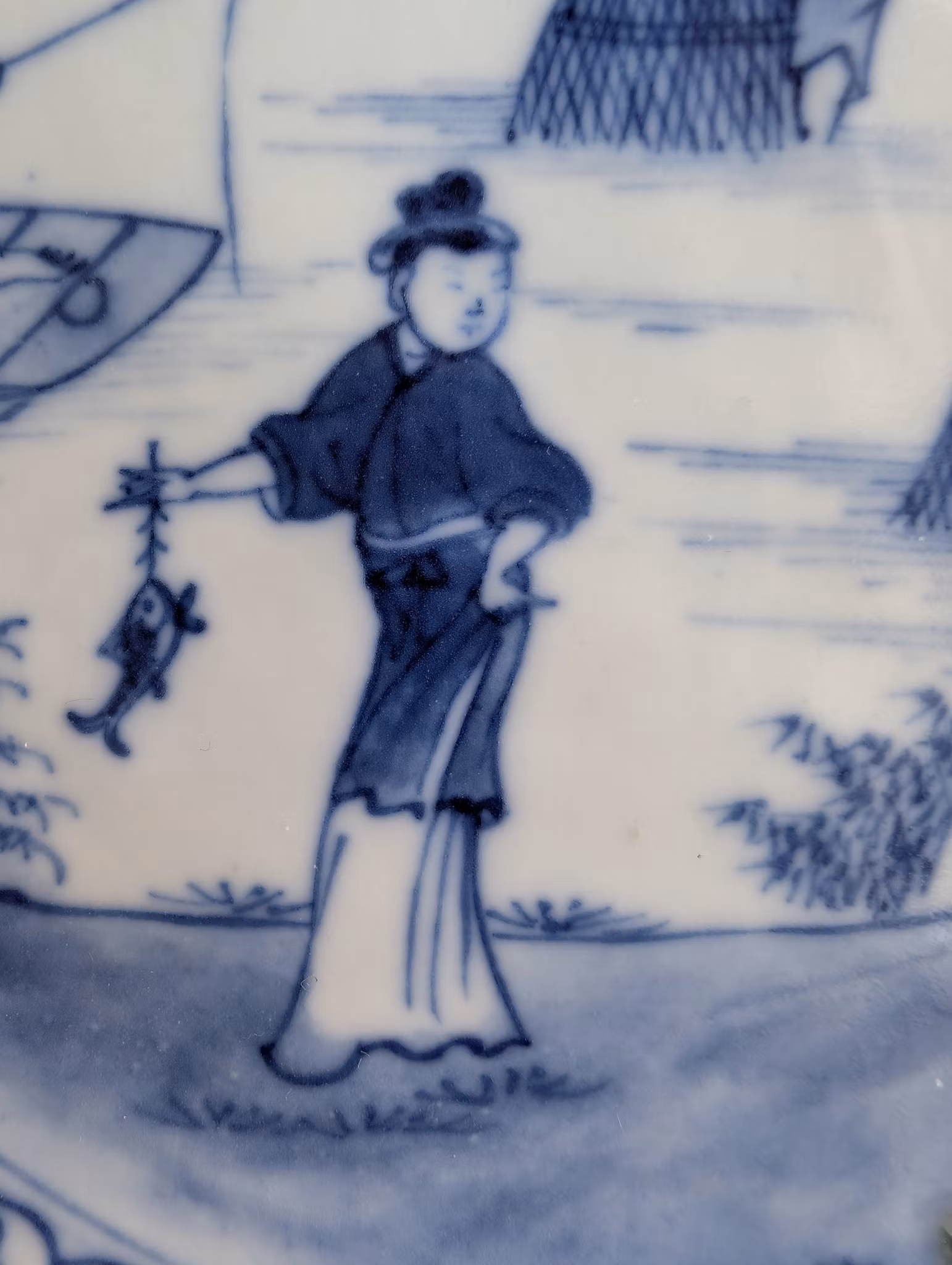 Chinese antique blue and white porcelain plate with fishermen, Qianlong, 18th c #2850