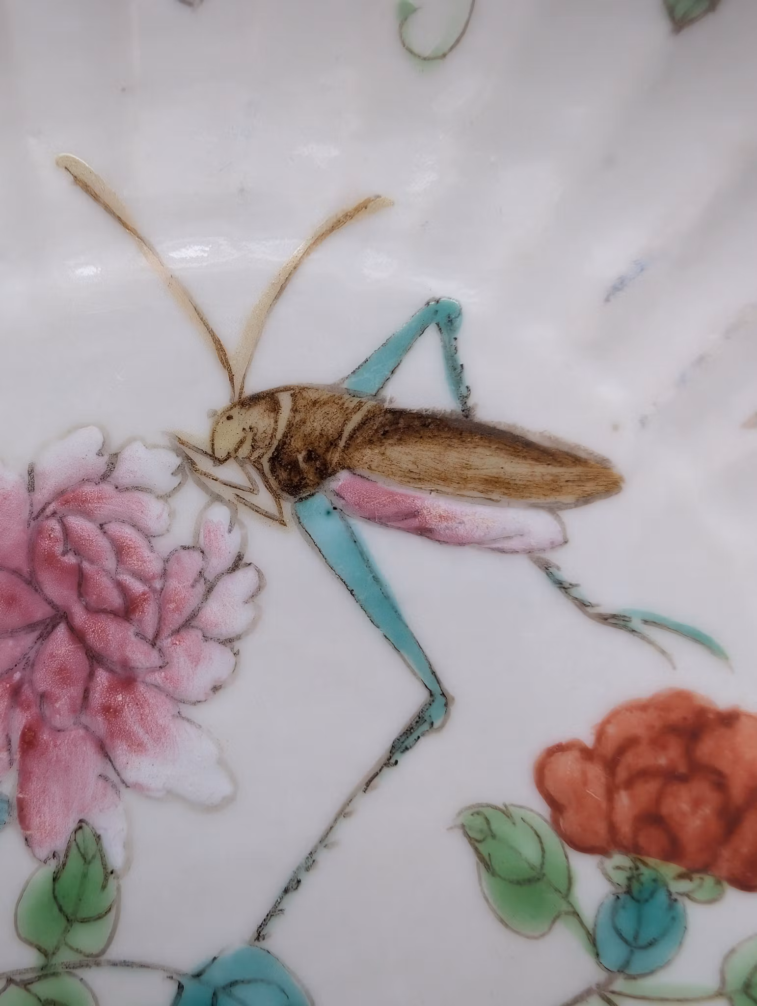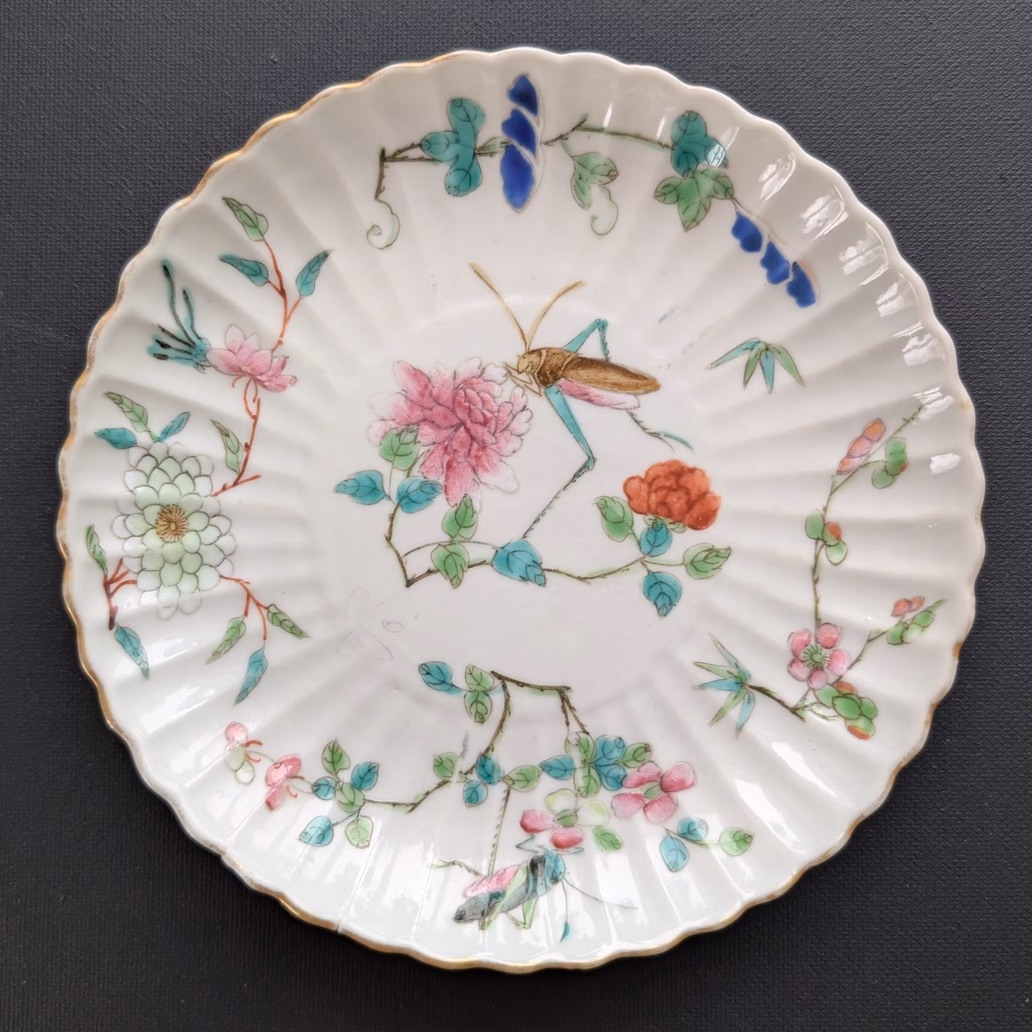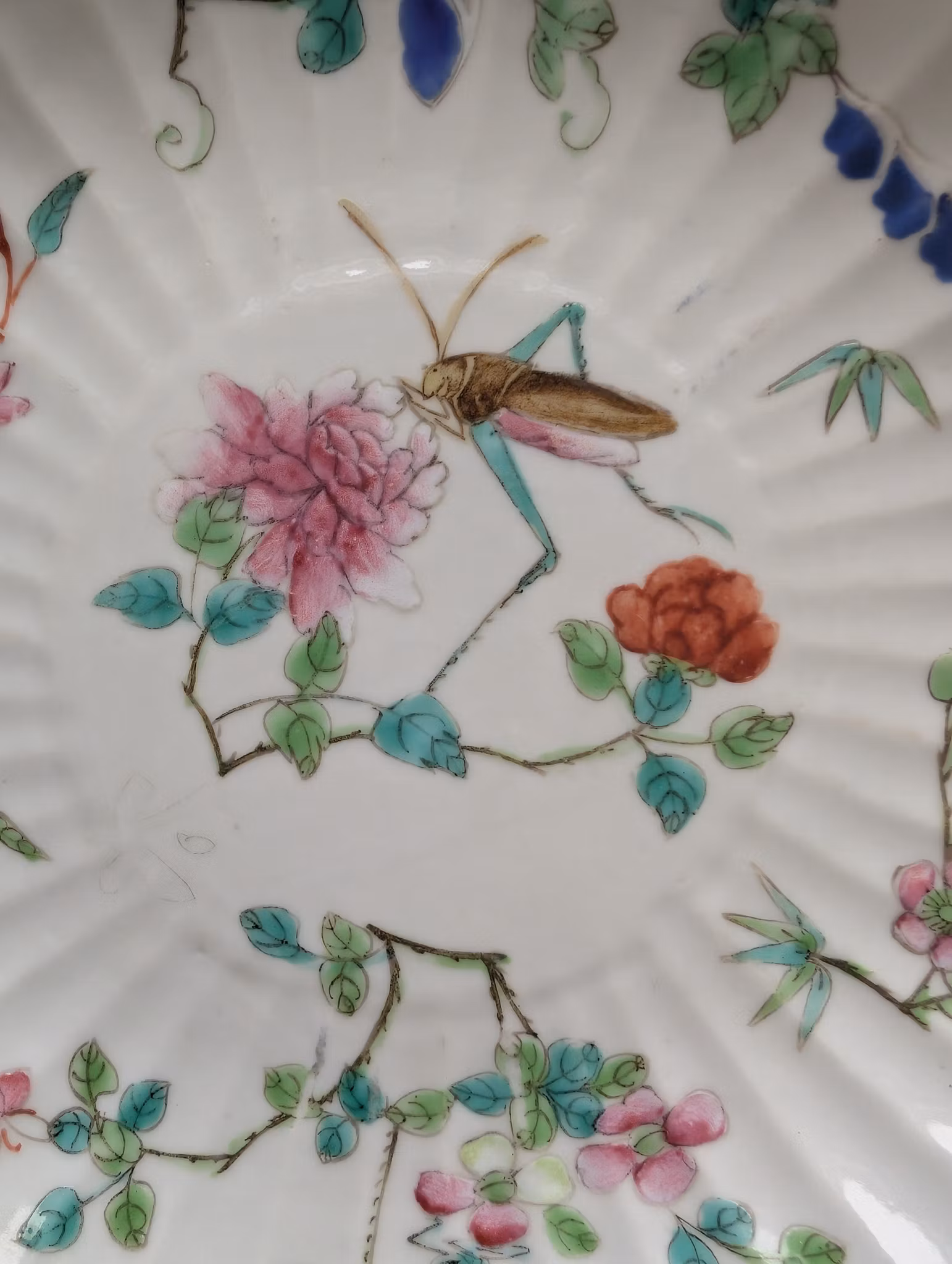 Beautiful plate decorated with various flowers and two insects. Back with handwritten Tongzhi six character mark.