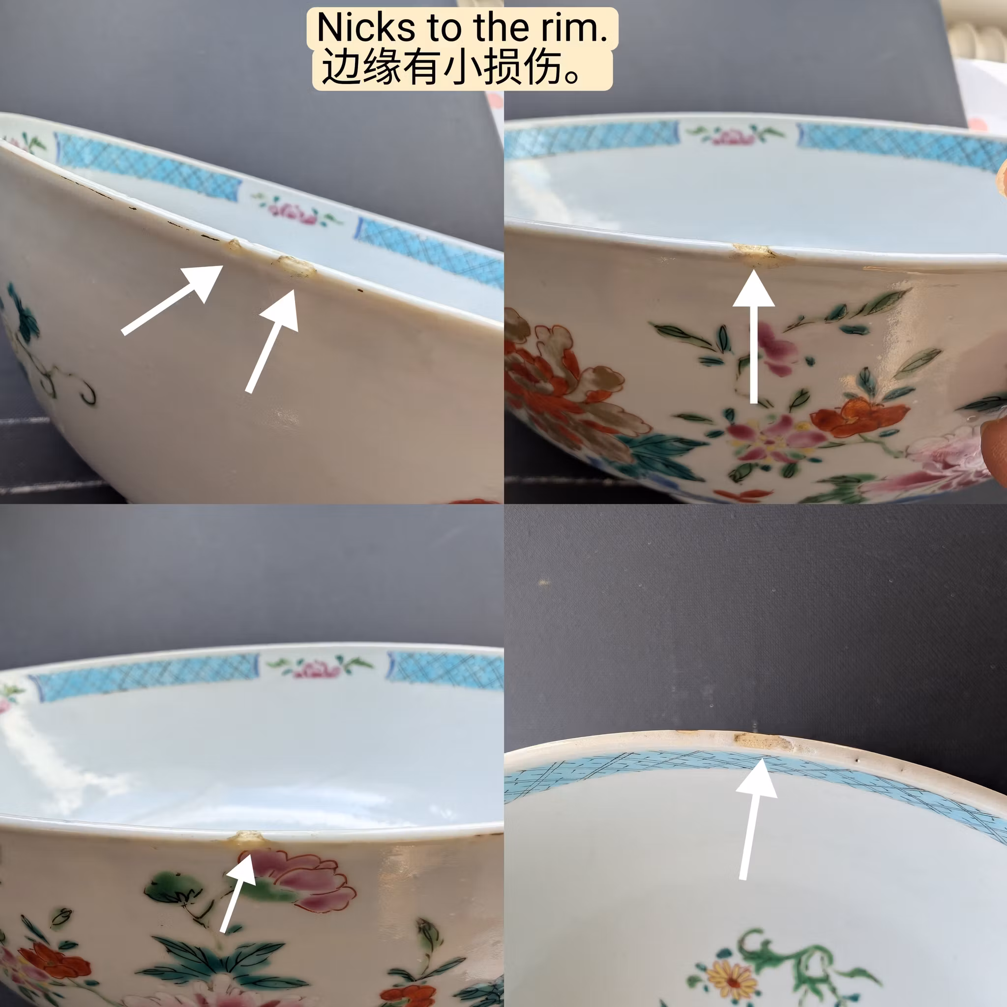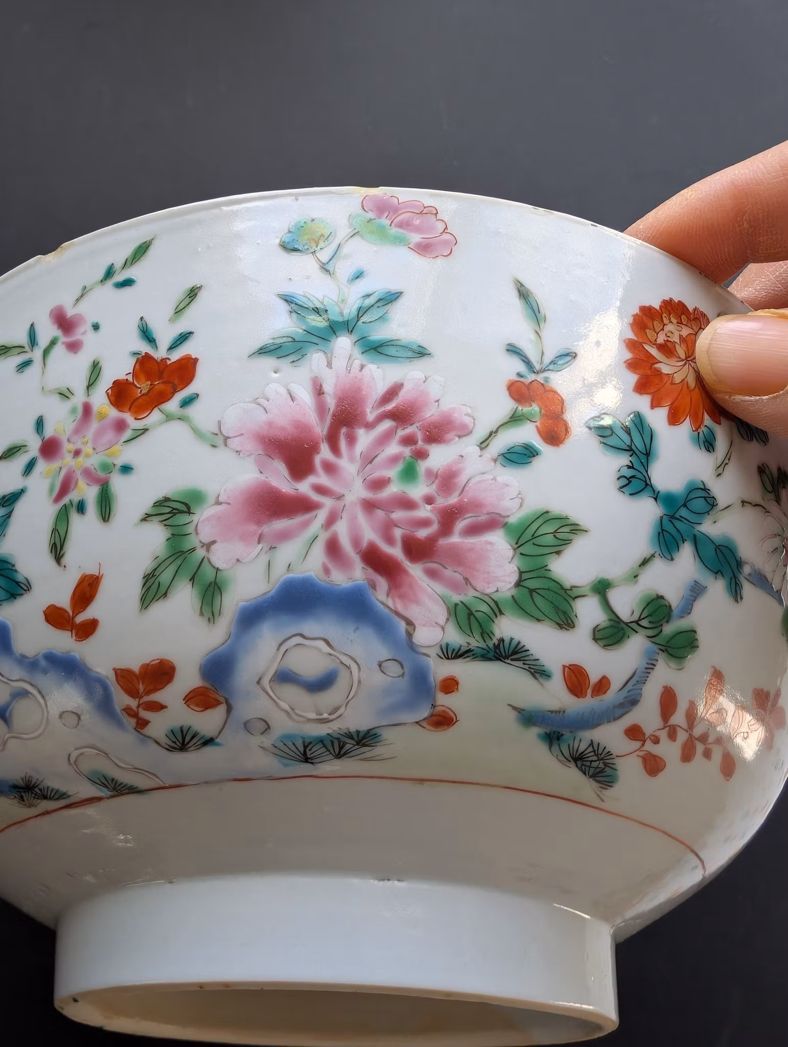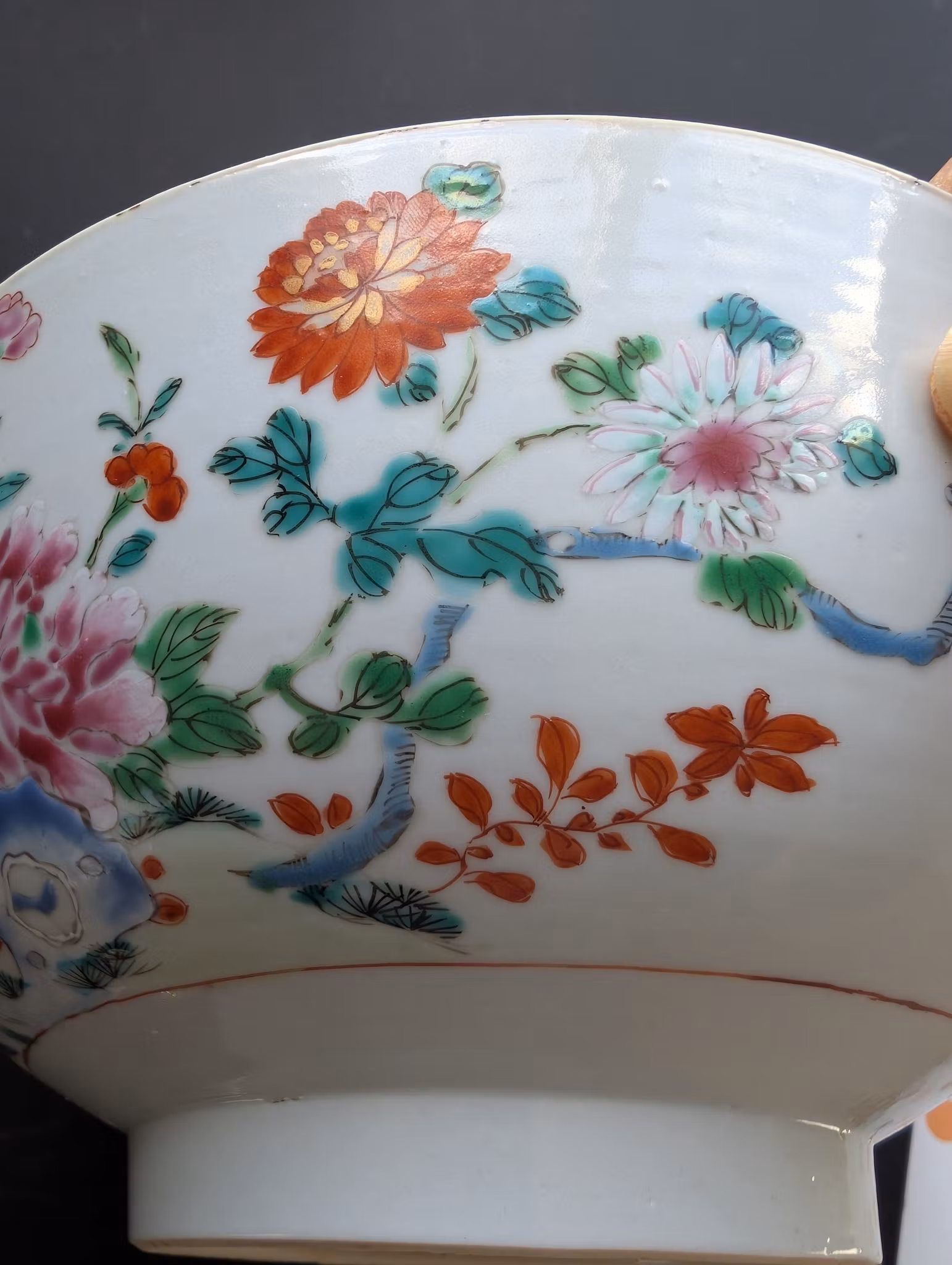 Beutiful famille rose punch bowl with decorations of peonies and garden rocks.