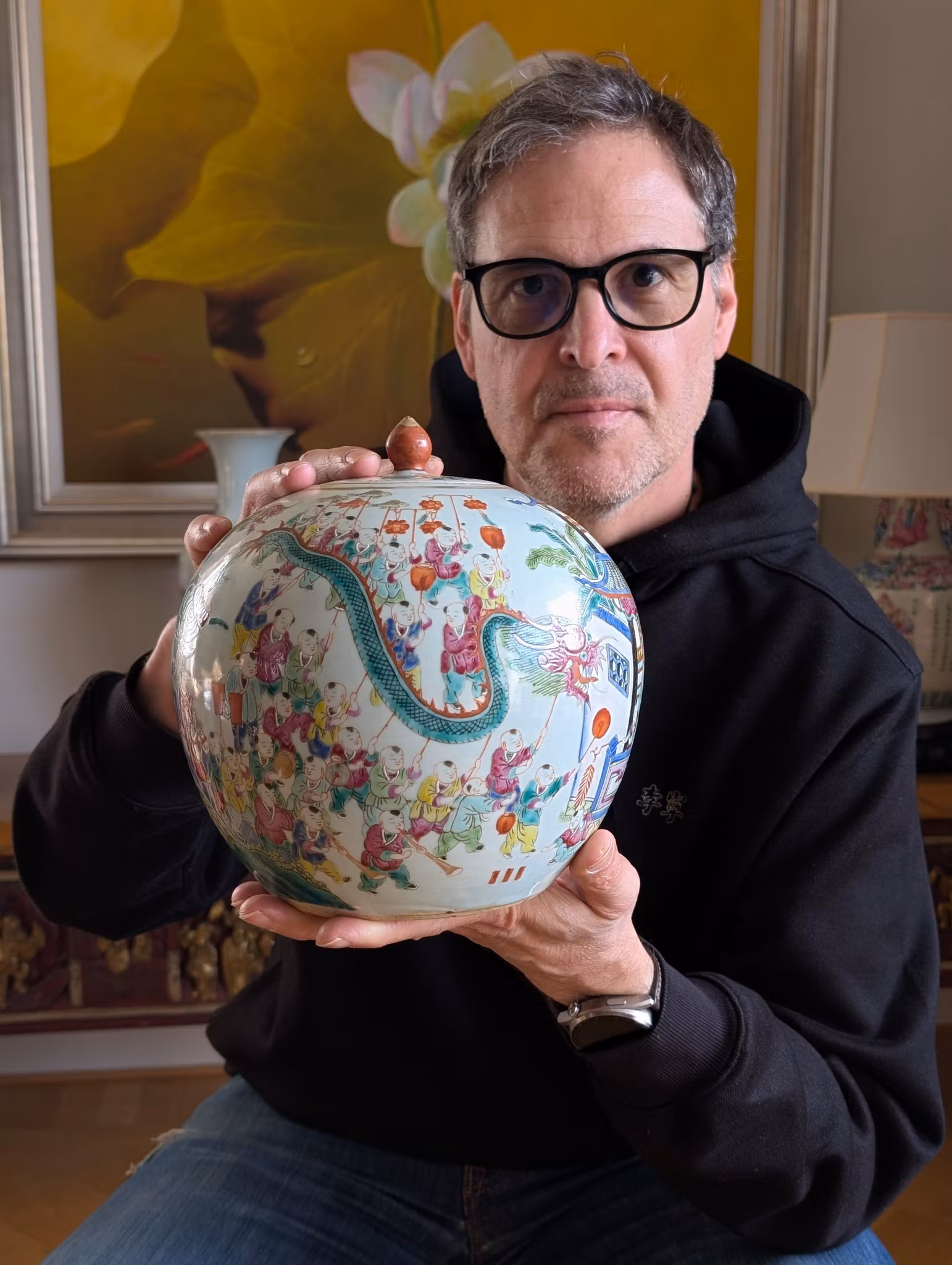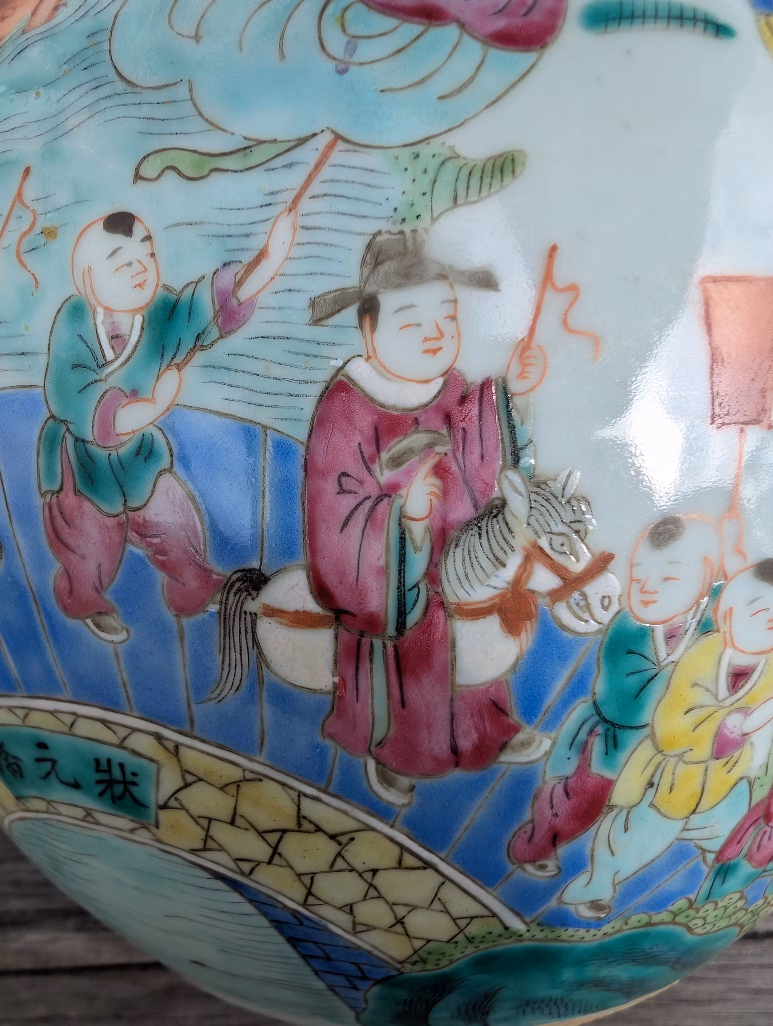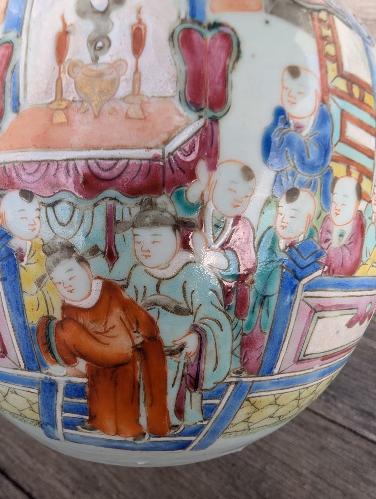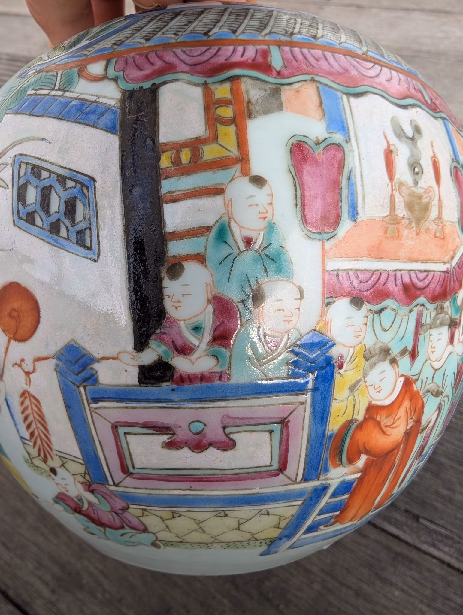 Beautiful antique jar decorated with Chinese new year celebrations in 360 degree painting covering the entire jar.