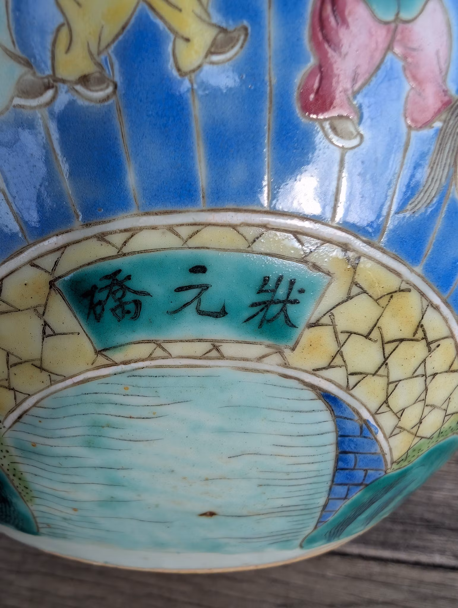 Checked with UV light. Base with a star-hairline. One minor nick at the mouth. Internal baking / firing cracks from the manufacturing process. Wear. See pictures for details.