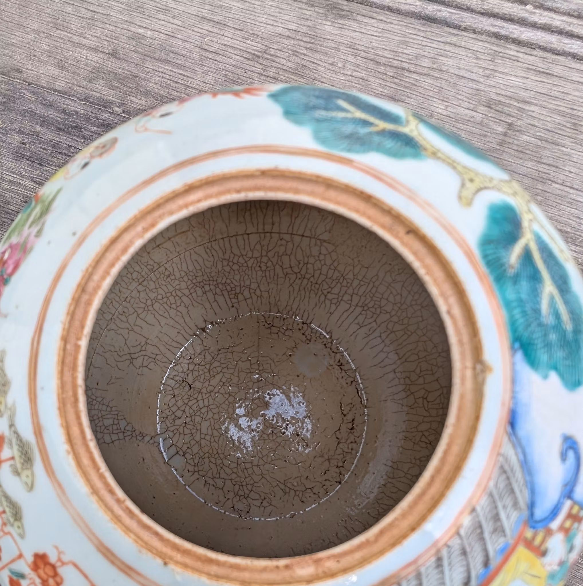 品相报告: 紫灯光检查过, 内部有制作过程中产生的窑烧裂纹, 罐子的口缘有一个很轻微的小缺口,底部有一条星状裂纹,请仔细看所有图片。