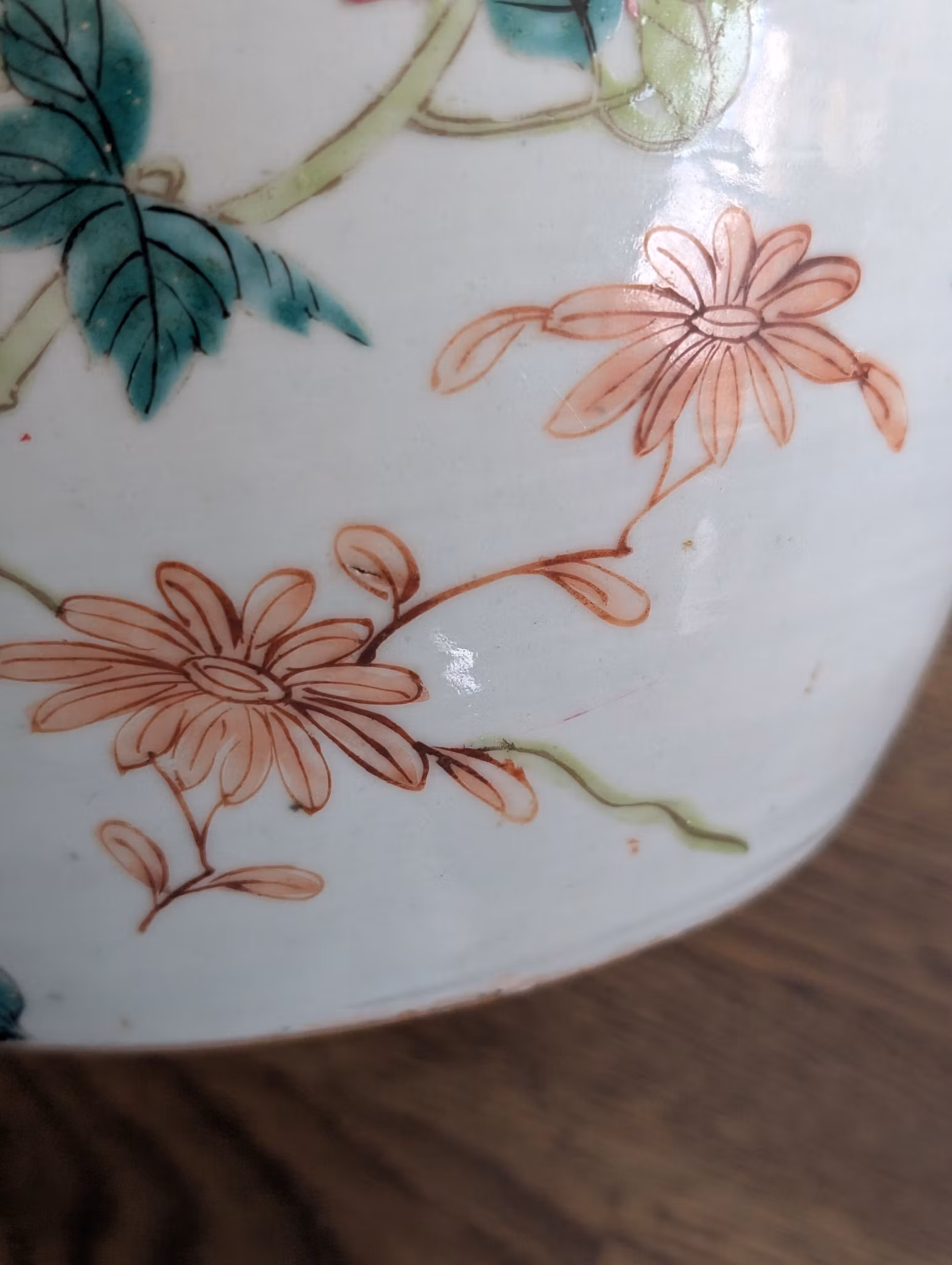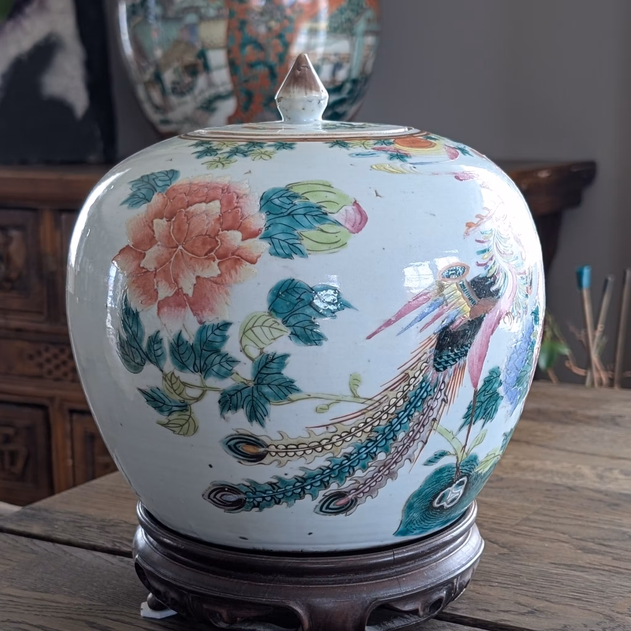 Beautiful antique jar decorated with double phoenixes, butterflies, peonies and peaches. The lid is original.