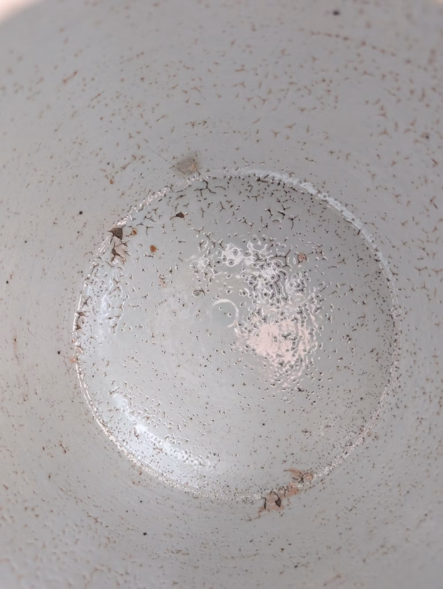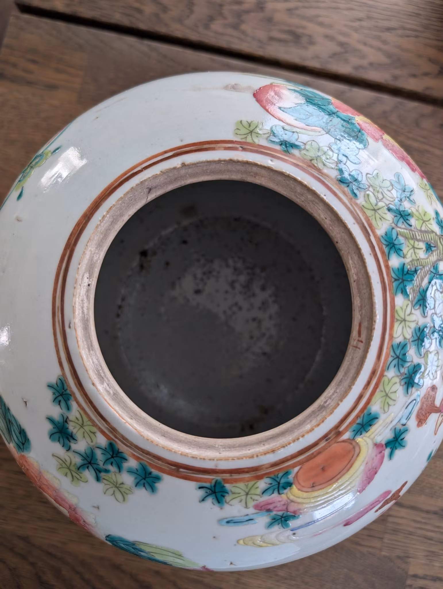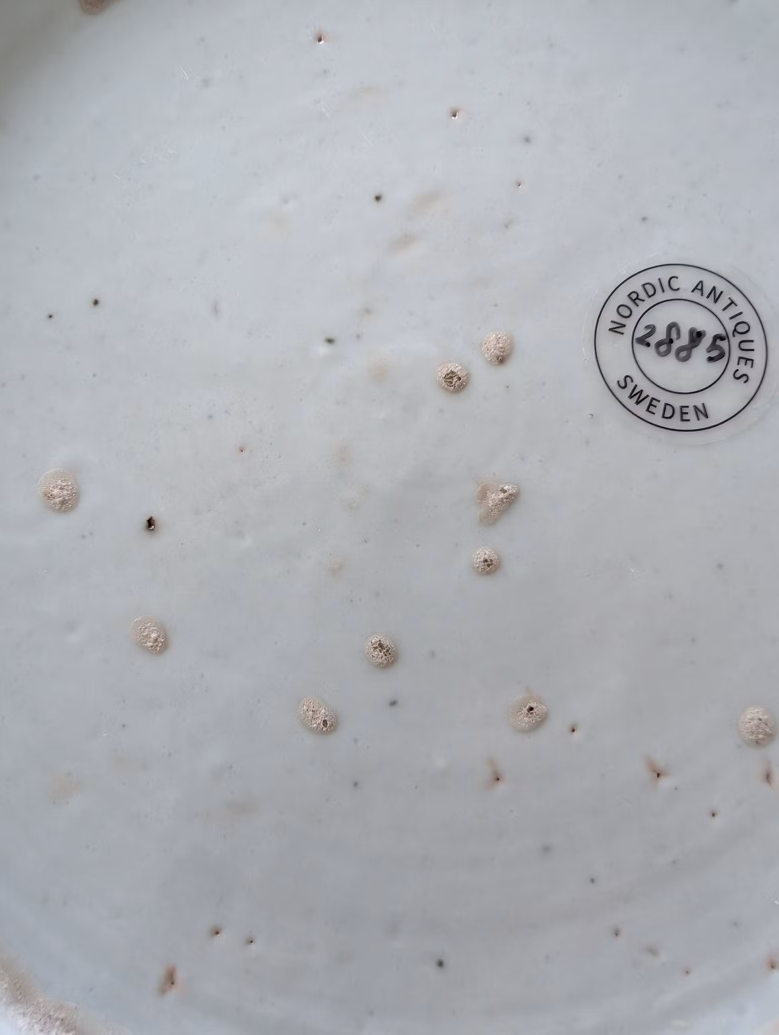 Checked with UV light. Glaze fritting on the lid knob, Scratches and baking / firing flaws from the manufacturing process. Wear. See pictures for details.