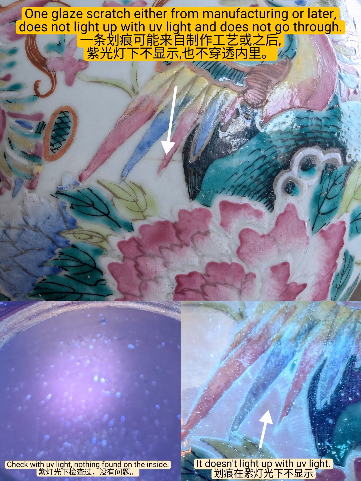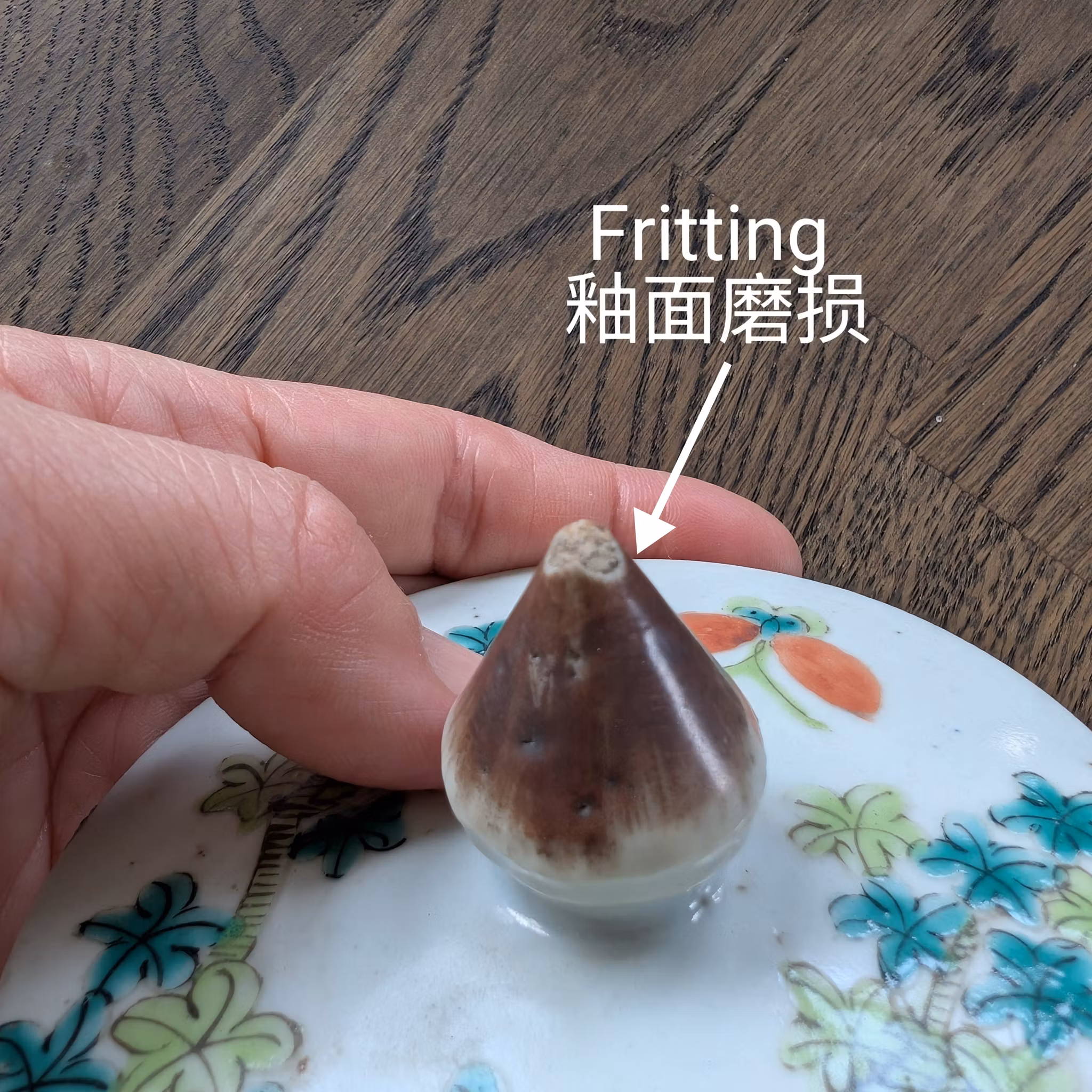 品相报告: 紫灯光检查过, 盖顶尖釉面磨损,(不穿透)划痕, 制作工艺的瑕疵, 窑烧裂,使用磨损。 细节请看照片。