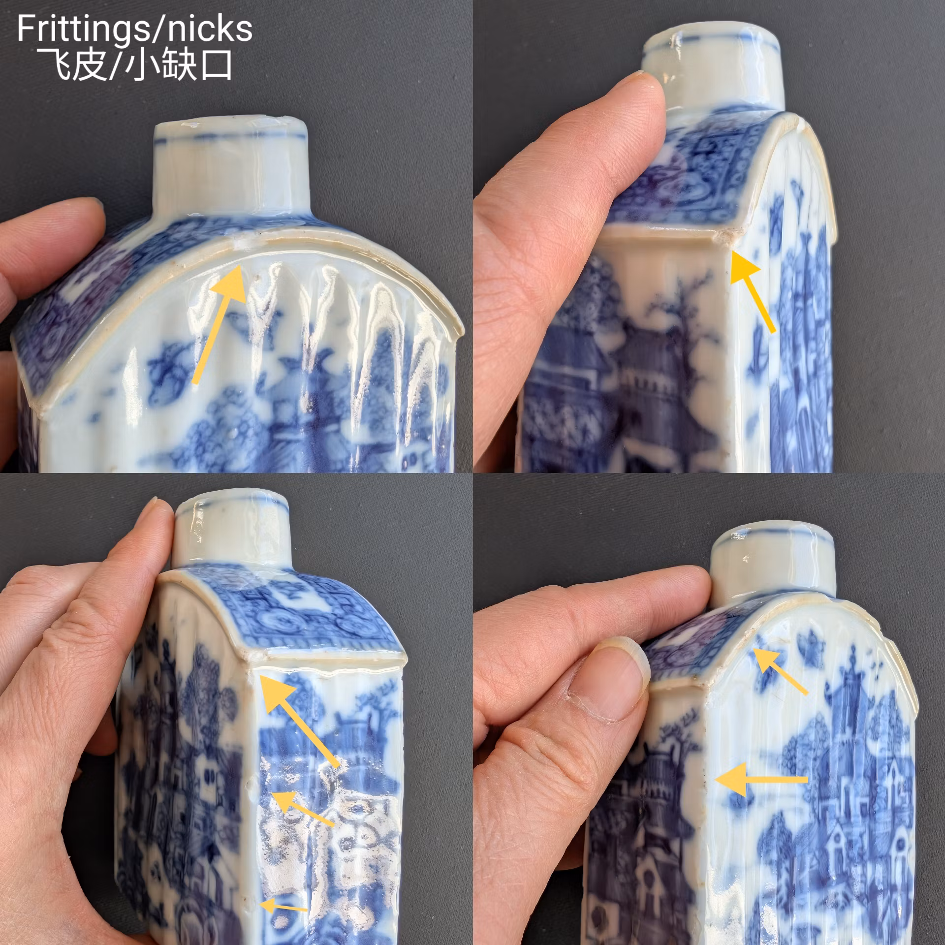 Condition: Checked with UV Lamp, Overall good condition, no cracks, no hairline, no restoration, multiple nicks glaze and frittings around the edges, glaze damages, general wear and manufacturing flaws. See pictures.