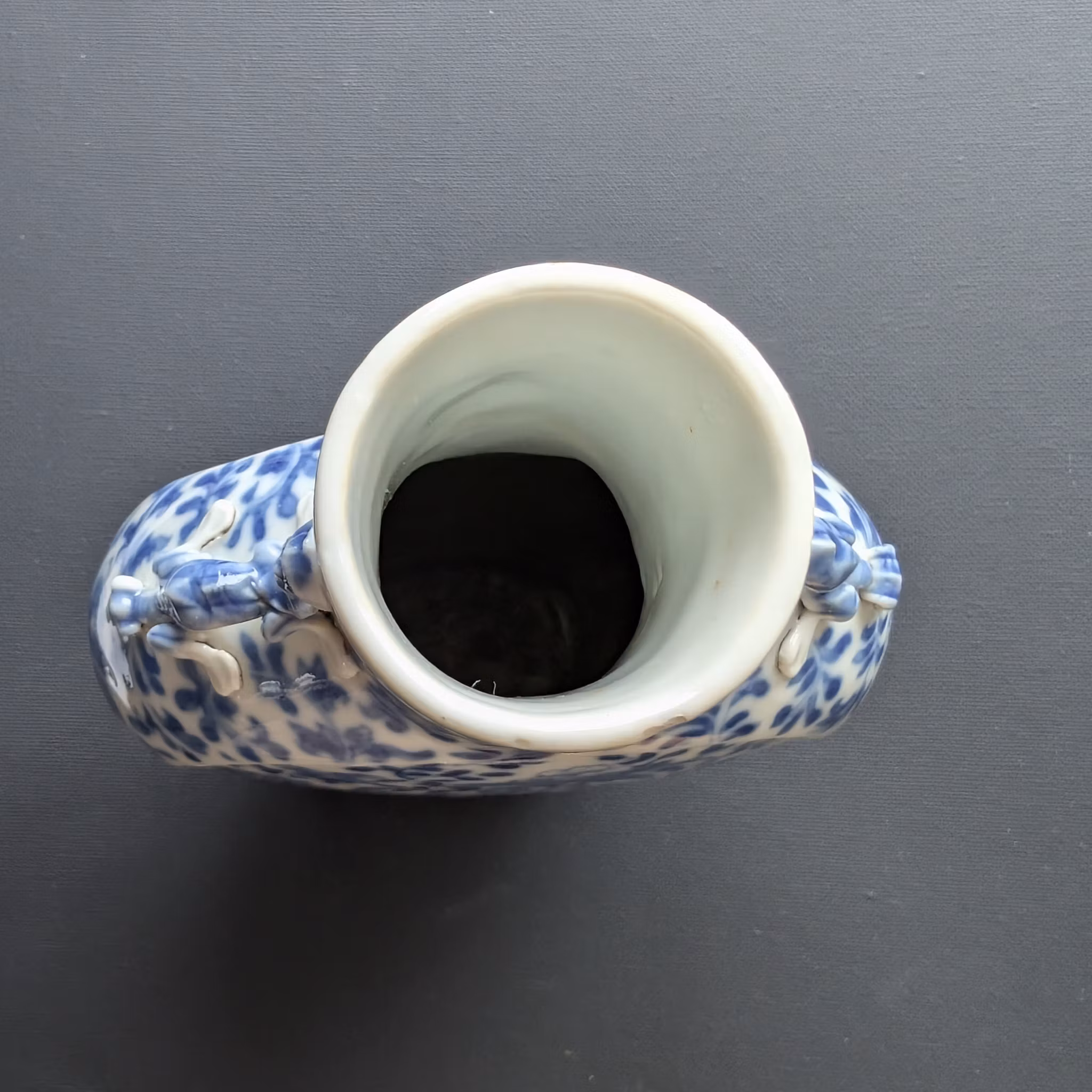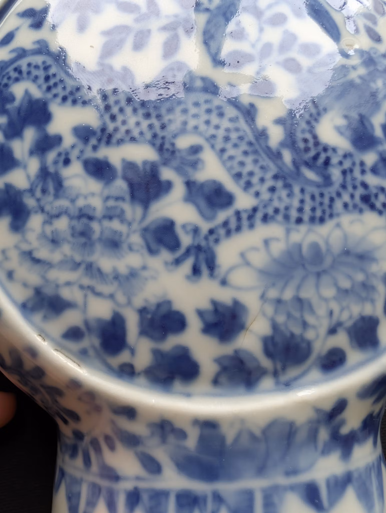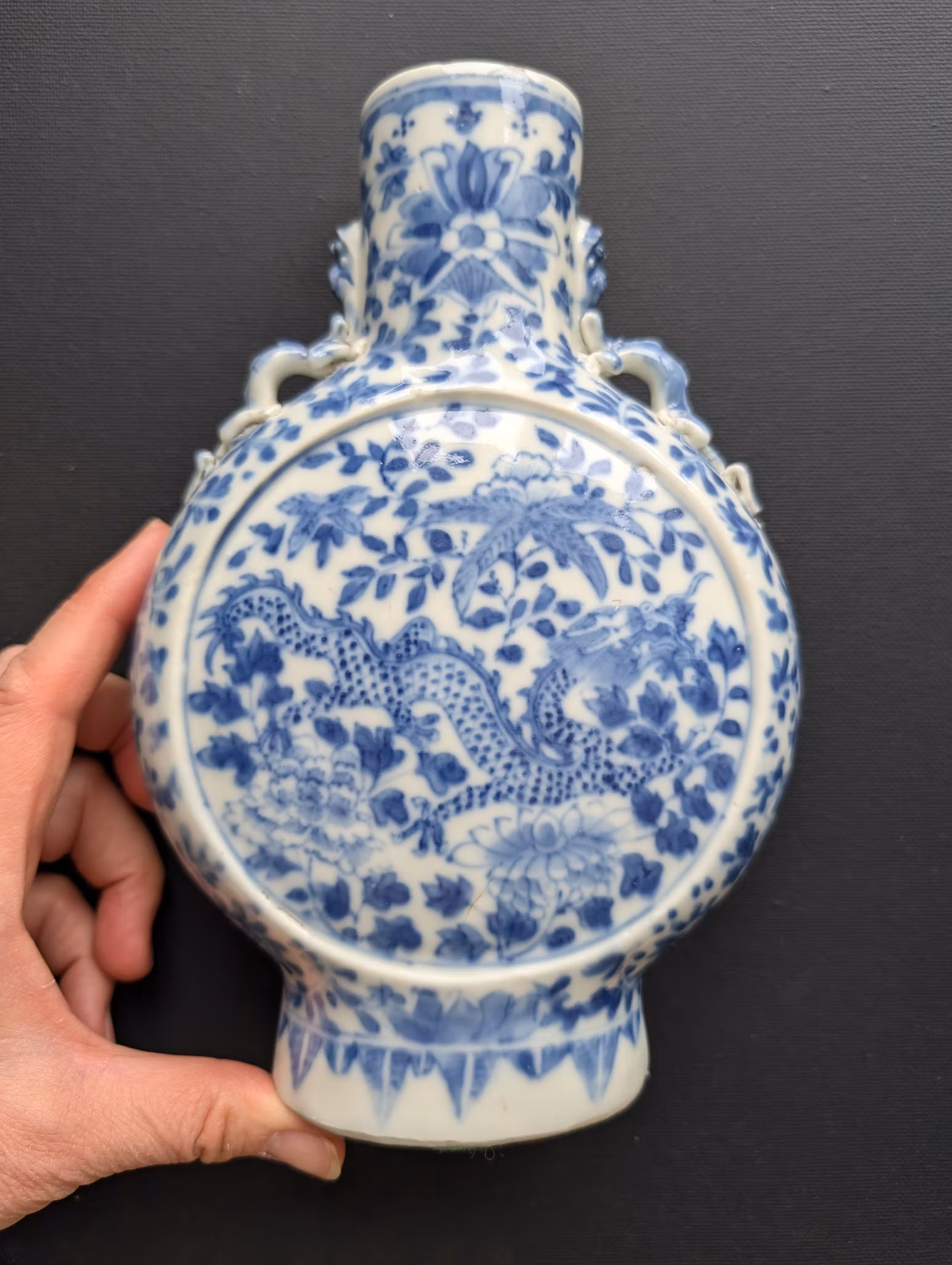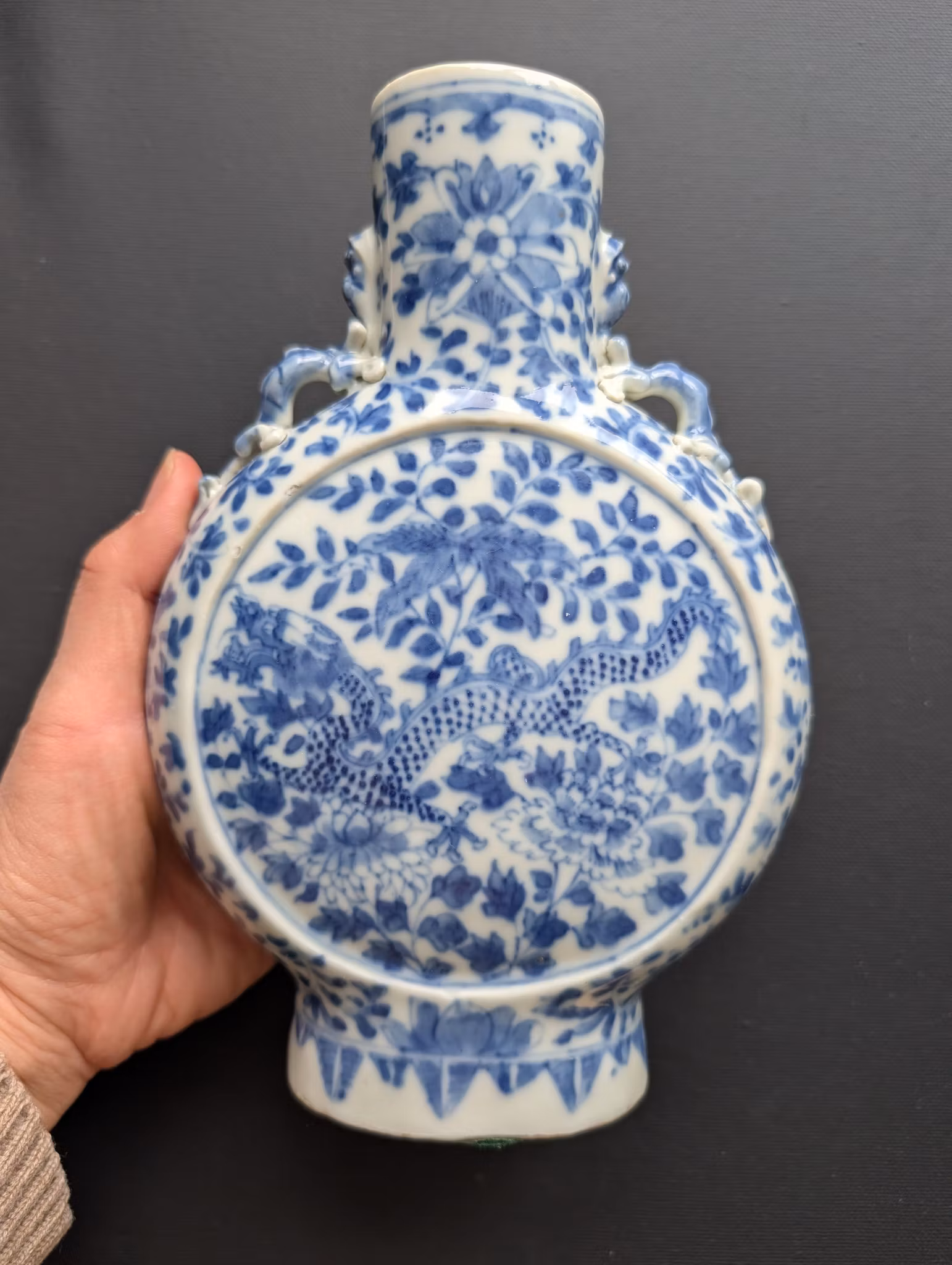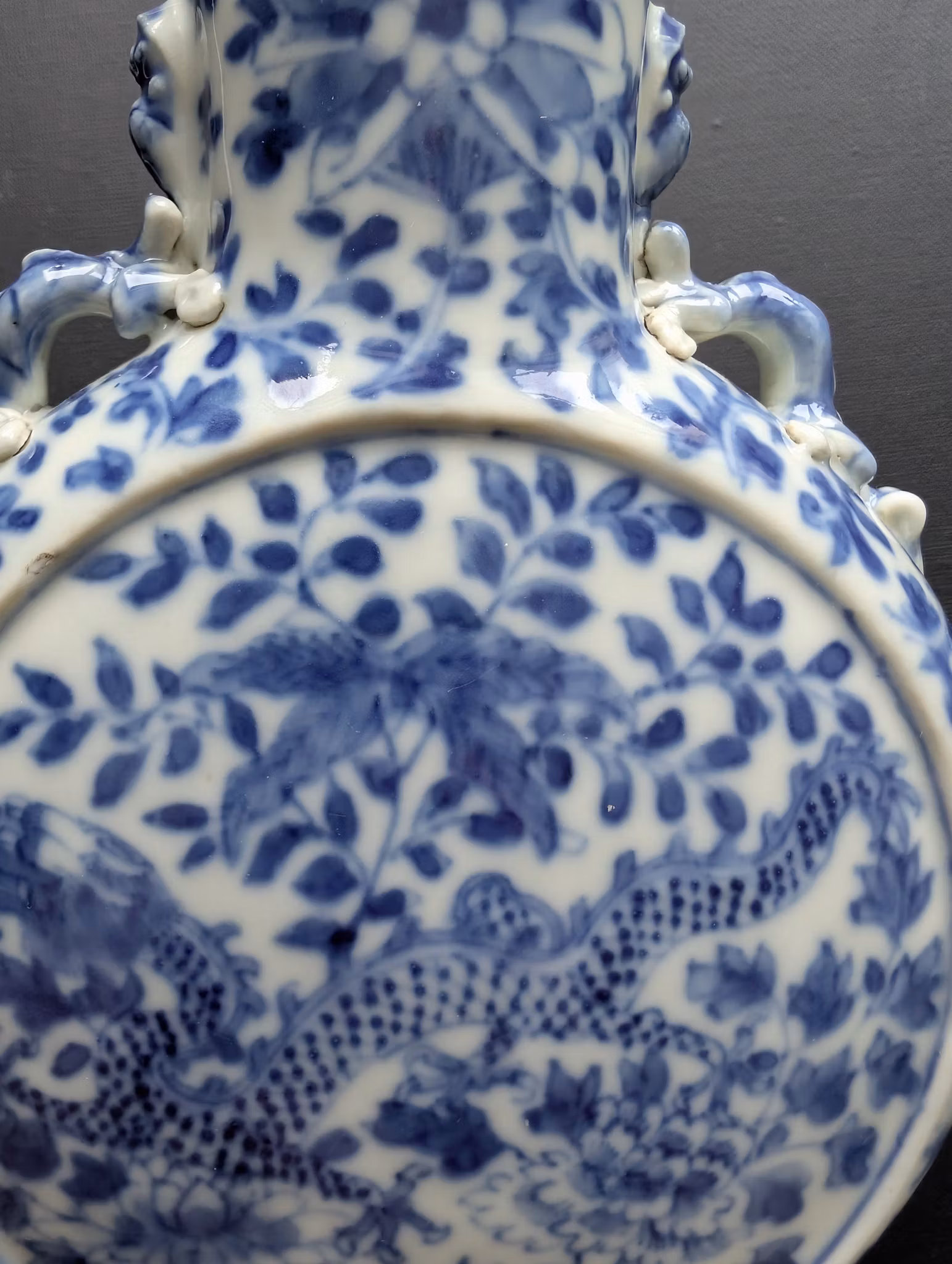 Chinese antique underglazed blue and white moon flask with dragon, Late Qing #2820