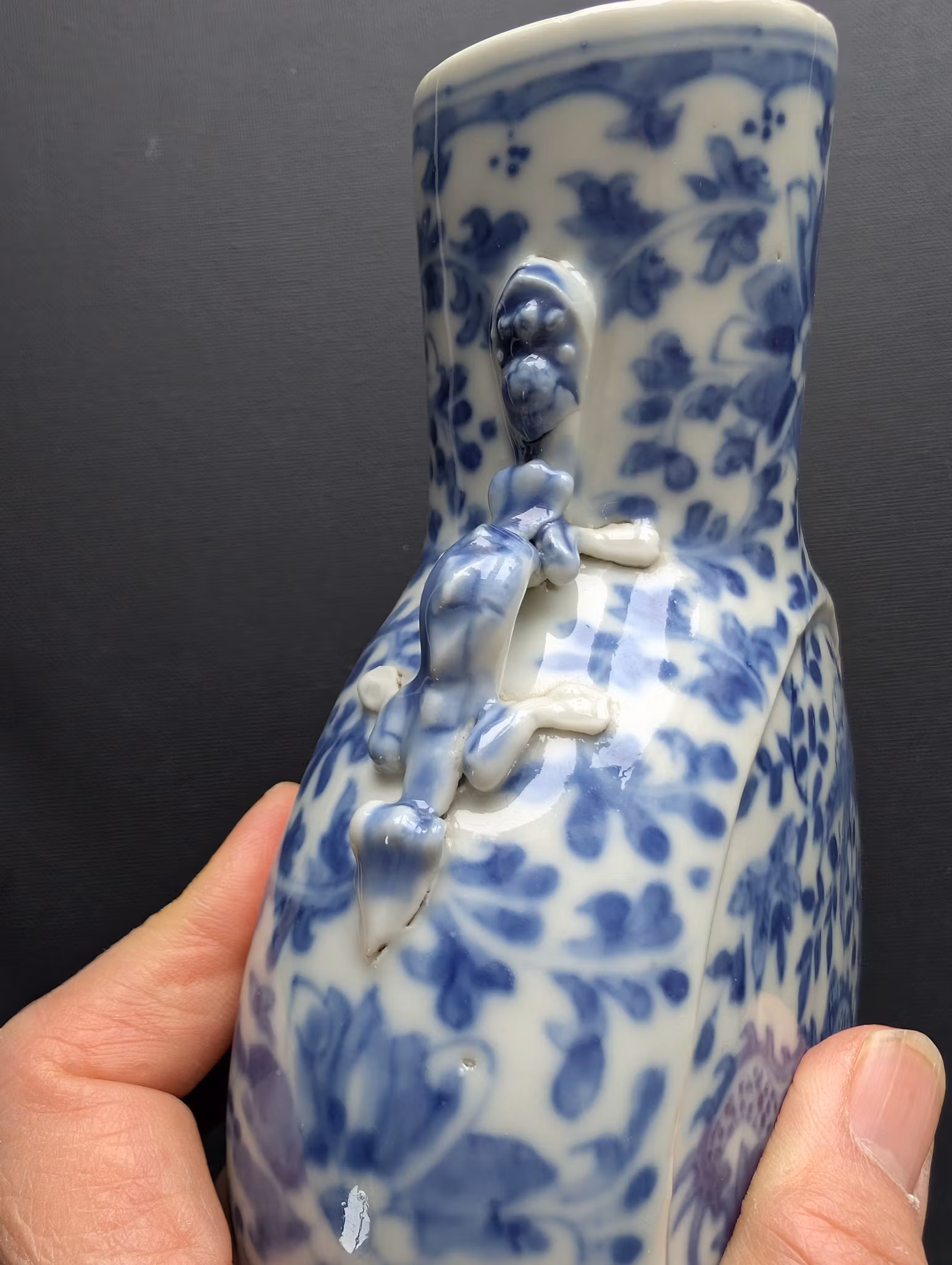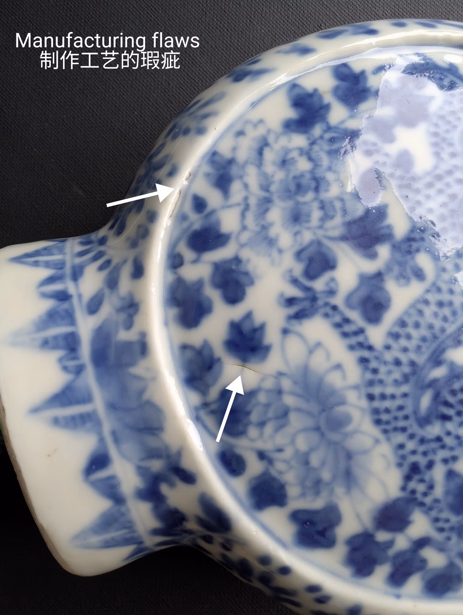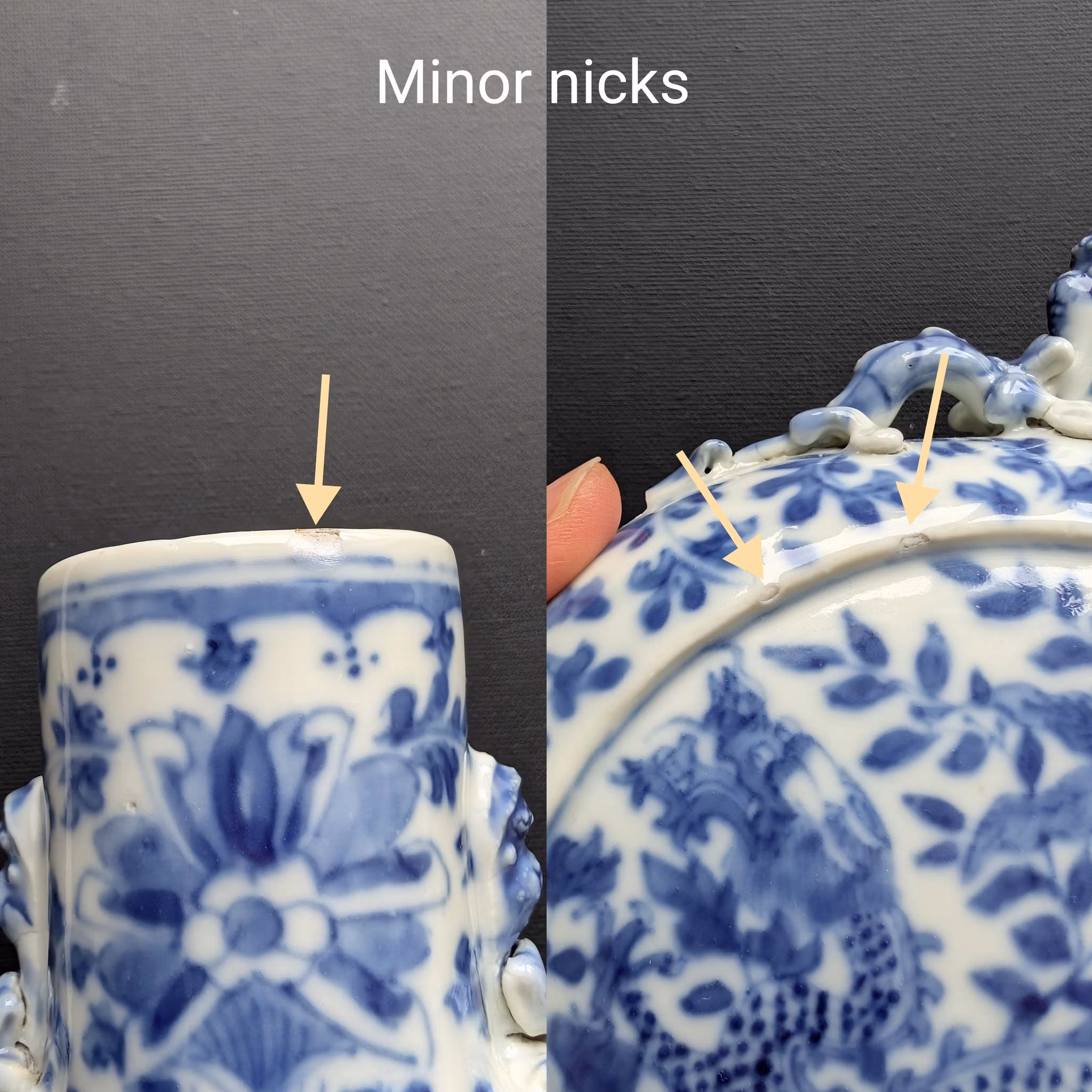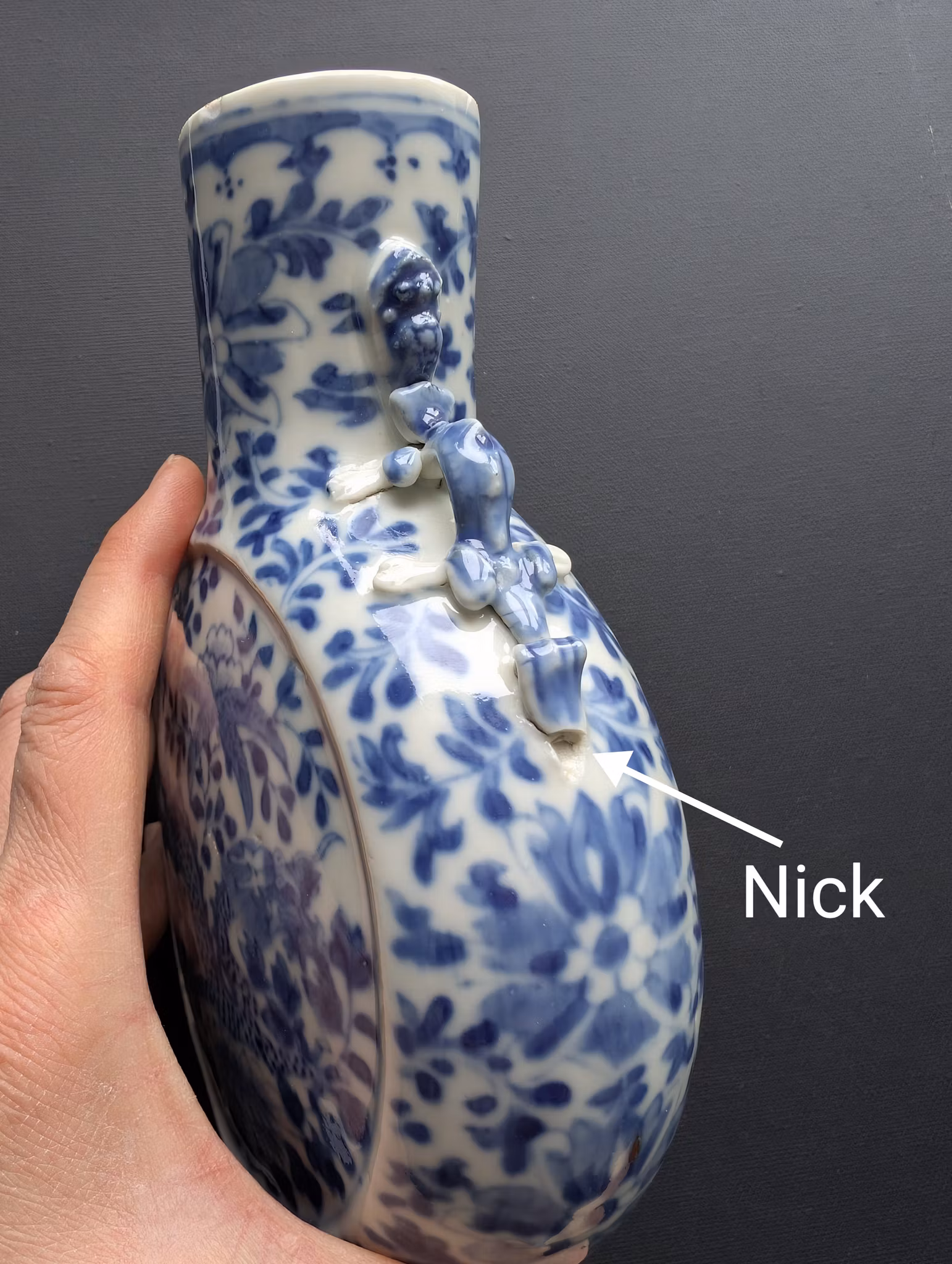 Check with UV light. Overall in nice condition. One nick to the tail of one of the handles, One minor glaze nick to the rim. Minor fritting's to the body of the vase. General wear and manufacturing flaws. See pictures for details.