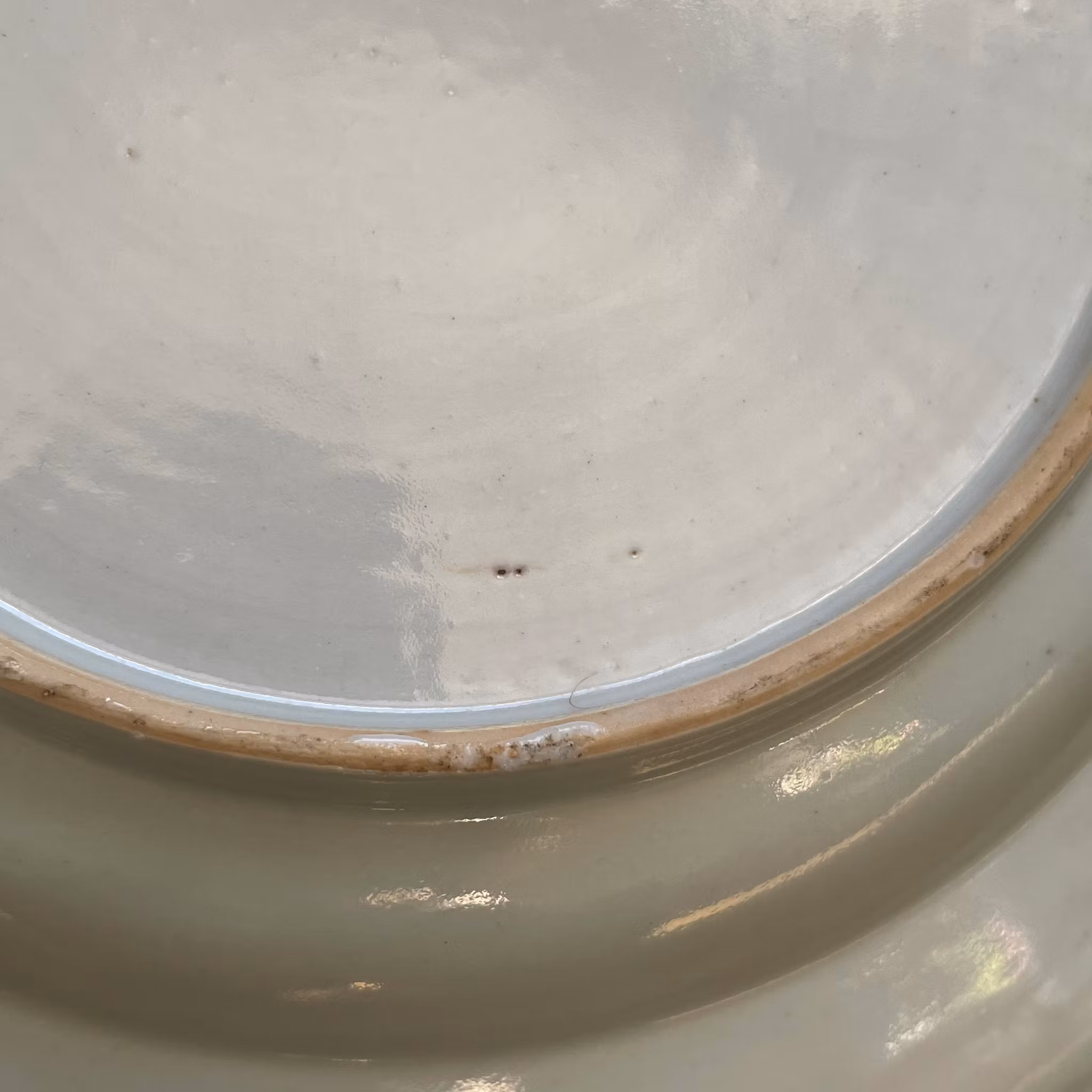 Checked with UV Light. No Hairline, no crack, no restoration. General wear and manufacturing flaws . Micro frittings . One very short firing crack.