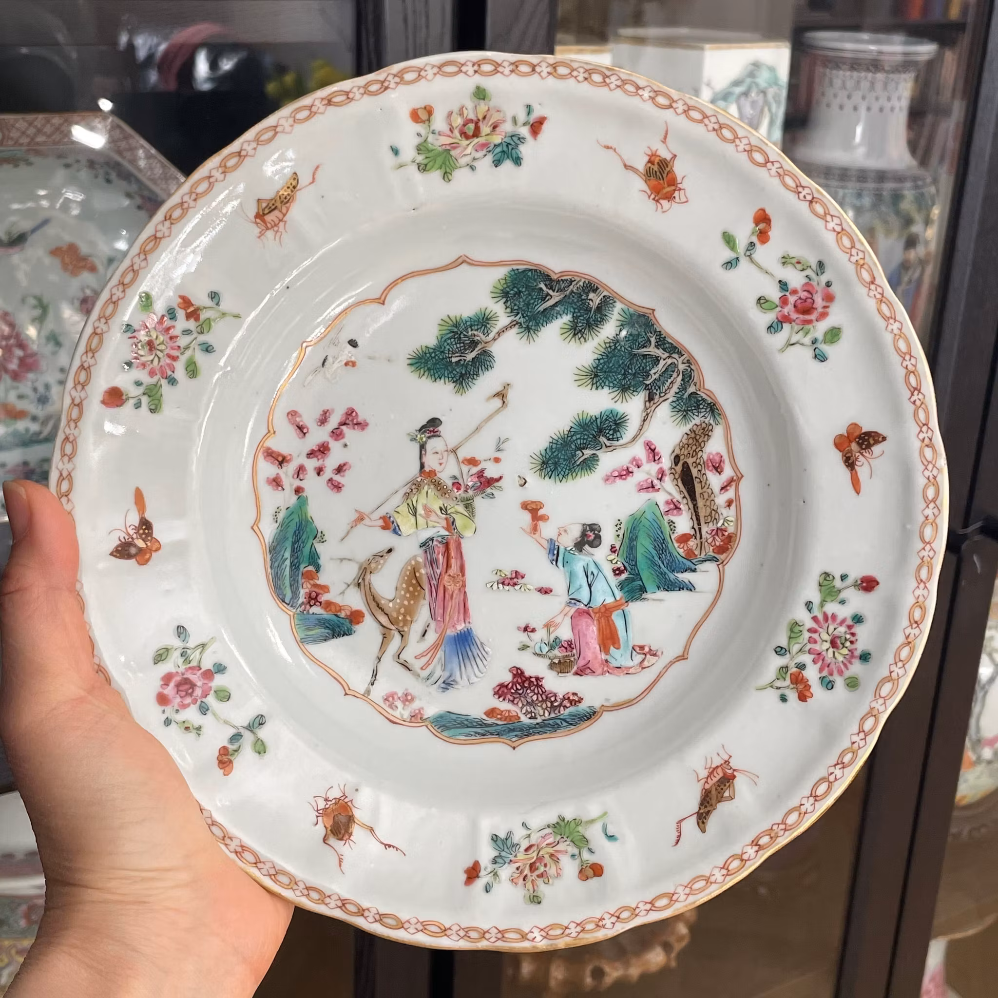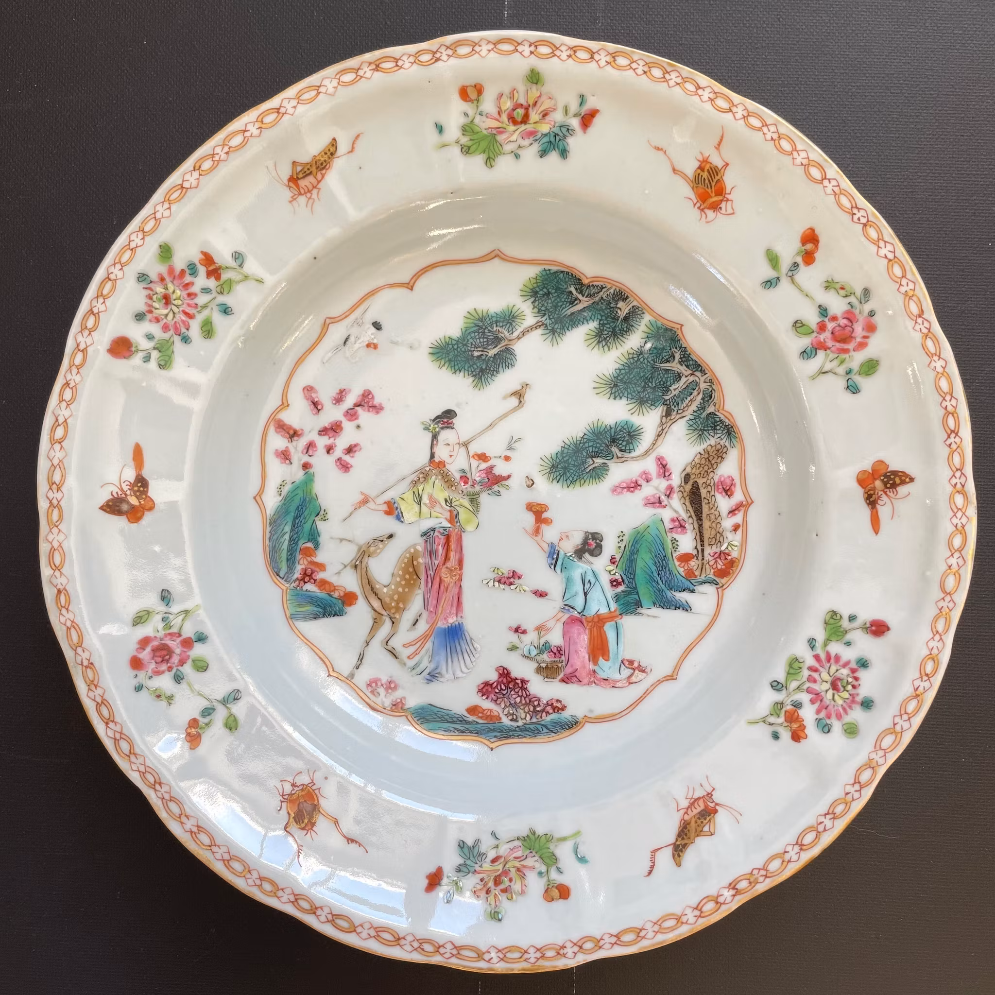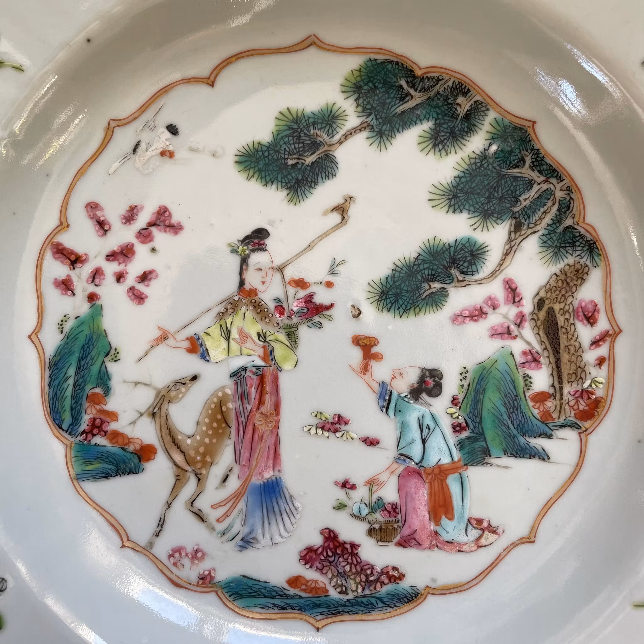 Deep plate with center decoration of Magu with a spotted deer and crane. 麻姑献寿. Nice early famille rose dish. Yongzheng early Qianlong period 18th c, Qing Dynasty.