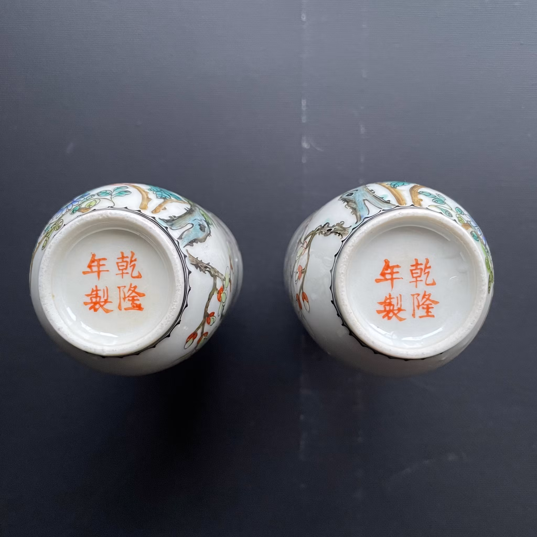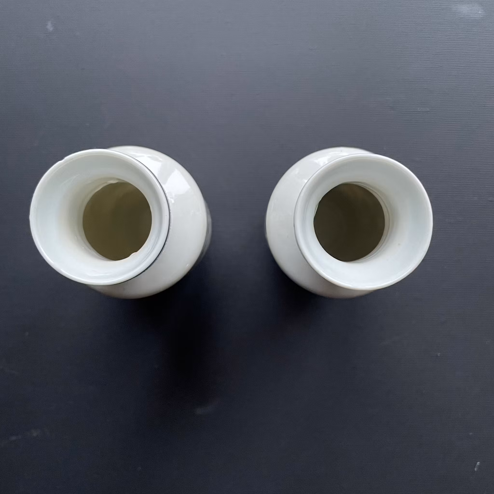 Checked with UV Lamp. Very nice condition. No hairline, no restoration. One of the vases has got a micro nick to the rim. General wear and scratches from usage. Manufacturing flaws.