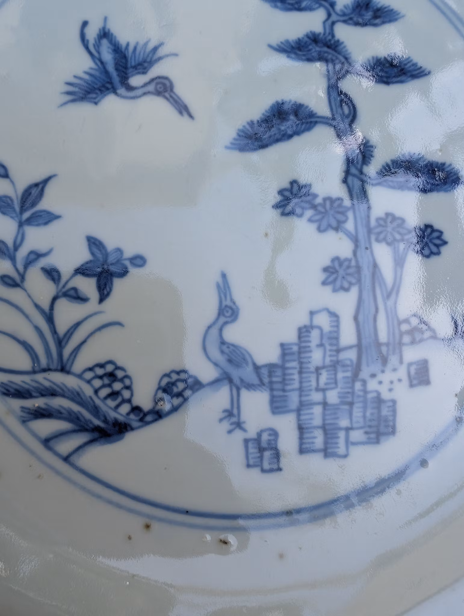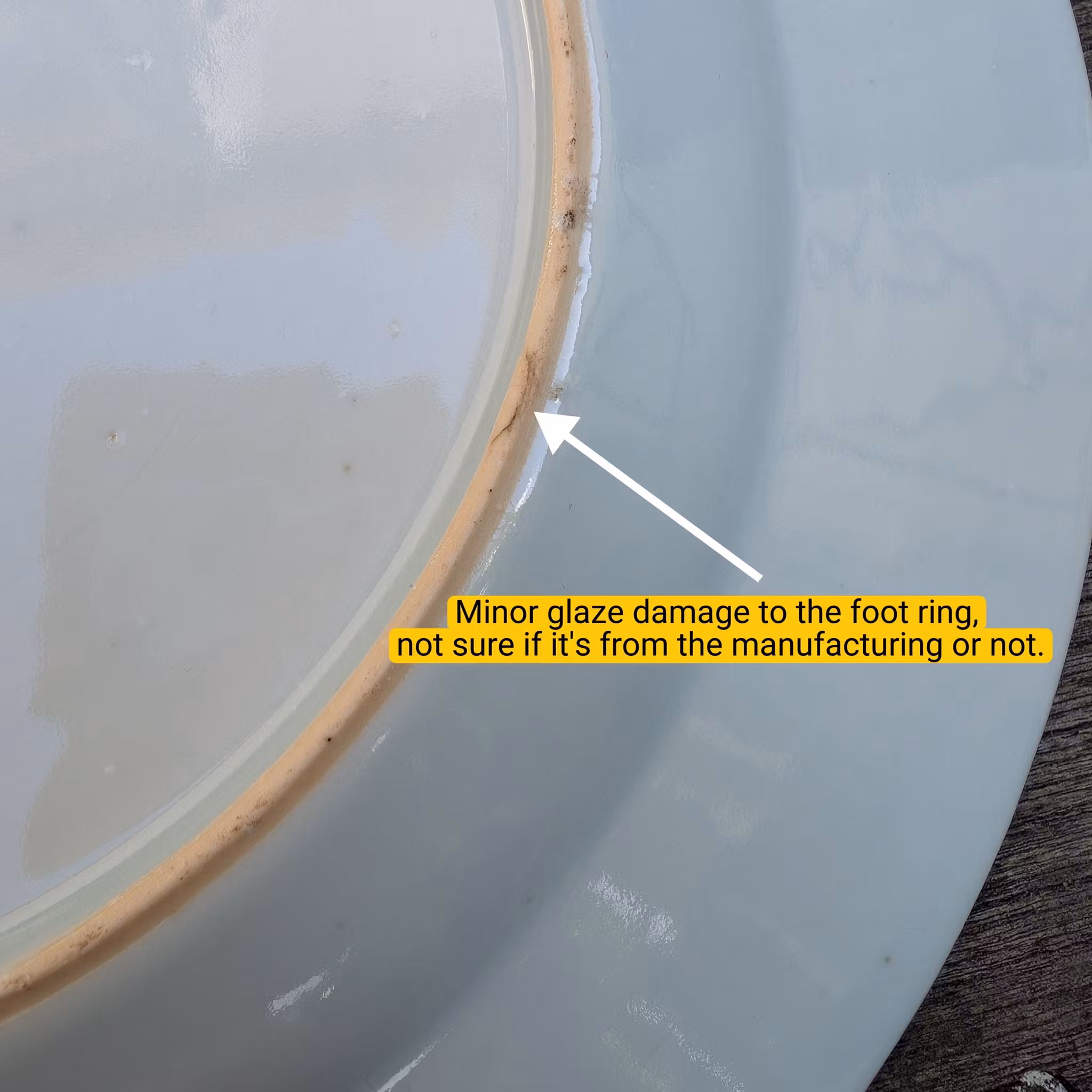 Checked with UV Light. Overall nice condition. No hairline, No restoration. One minor nick to the rim, one minor glaze damage to the foot ring ( Not sure if it is from the manufacturing or not ) . General wear and manufacturing flaws.
