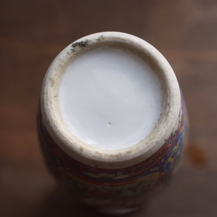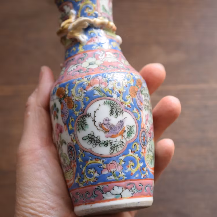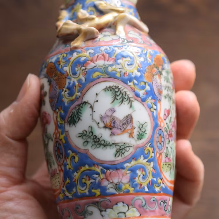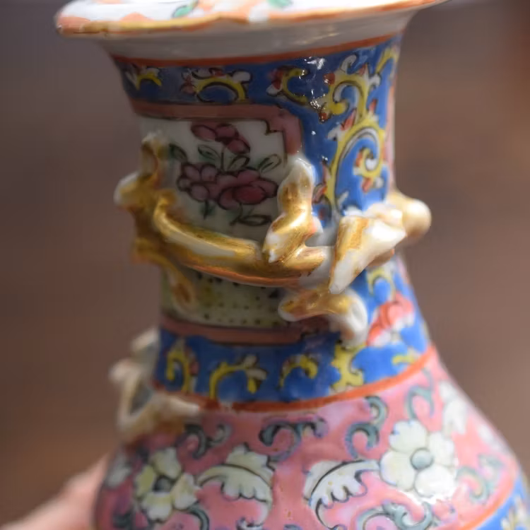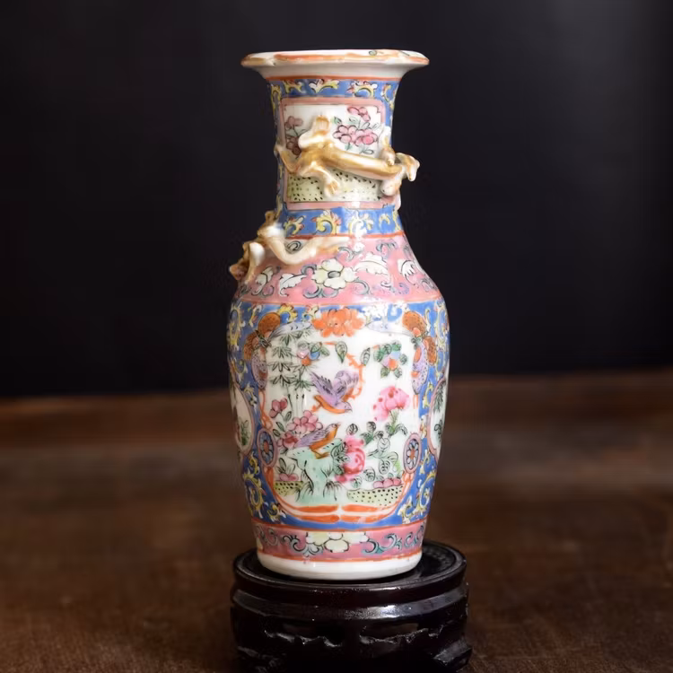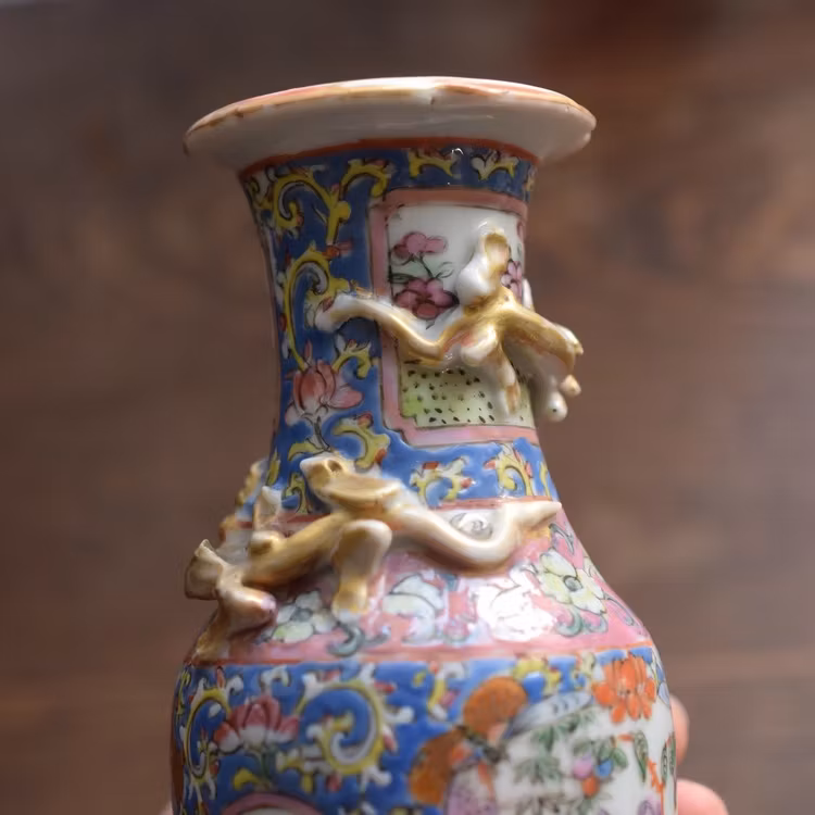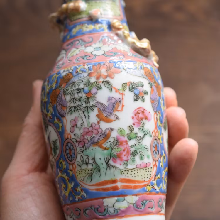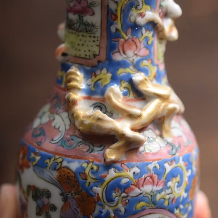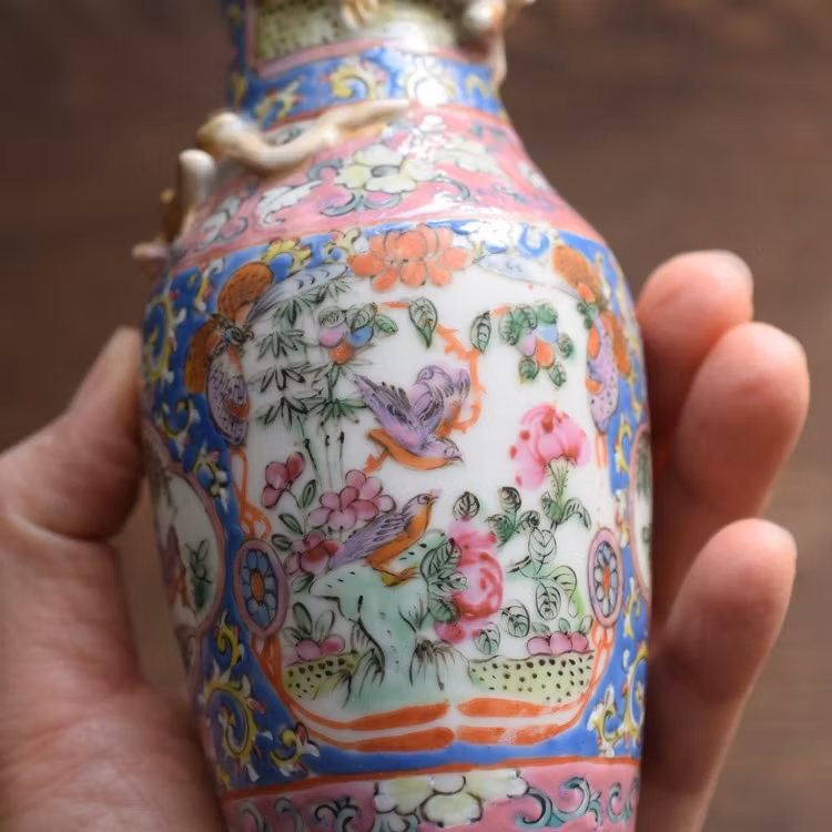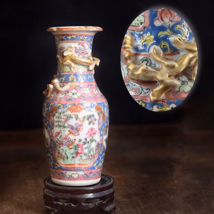A beautiful vase painted in canton rose famille rose colors. The vase have two golden dragons chasing the pearl on each side of the neck. Checked with UV light. No hairlines, No restorations. One micro nick to the top rim. Some minor wear only.