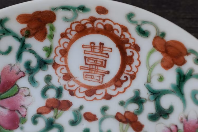 A Chinese porcelain plate decorated in polychrome décor on white glazed porcelain. The enamels are showing the character for Happiness displayed in reserves around the dish.