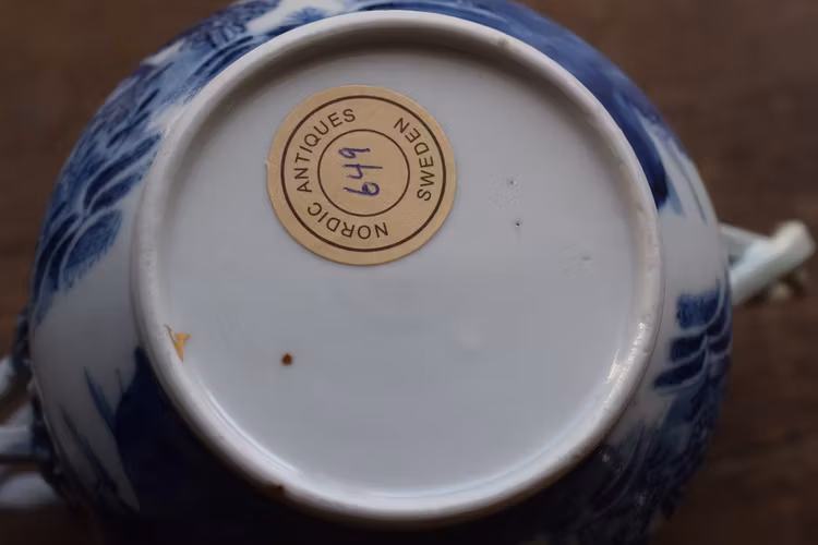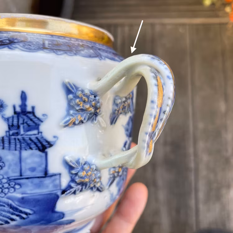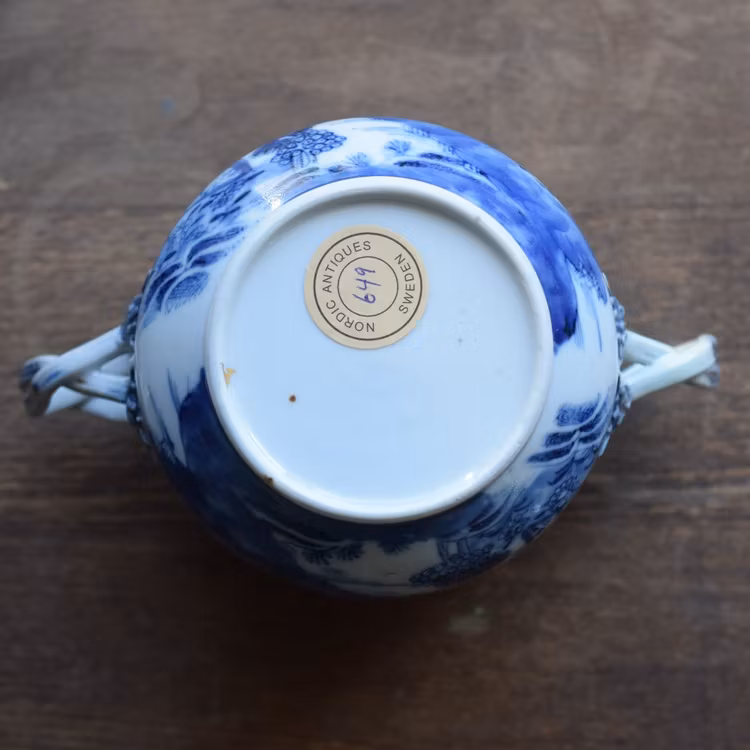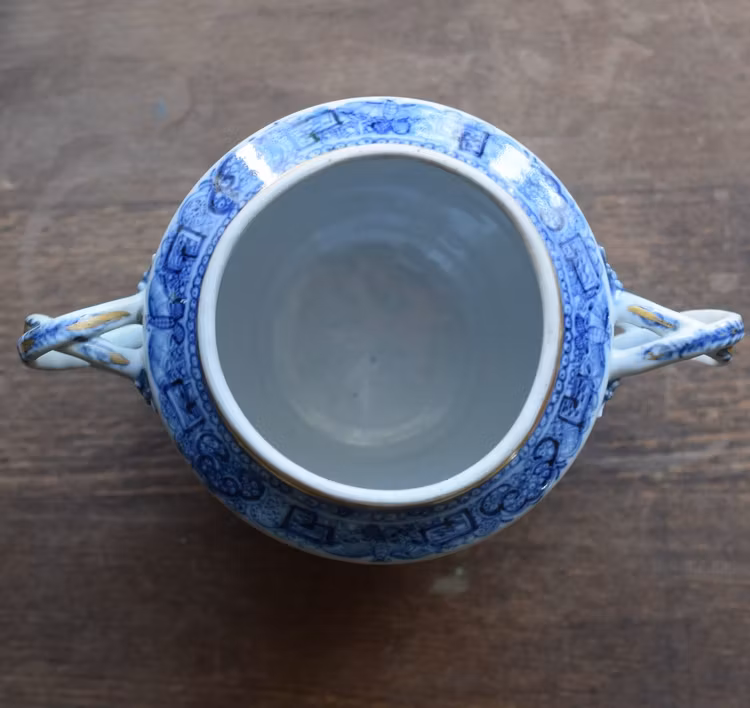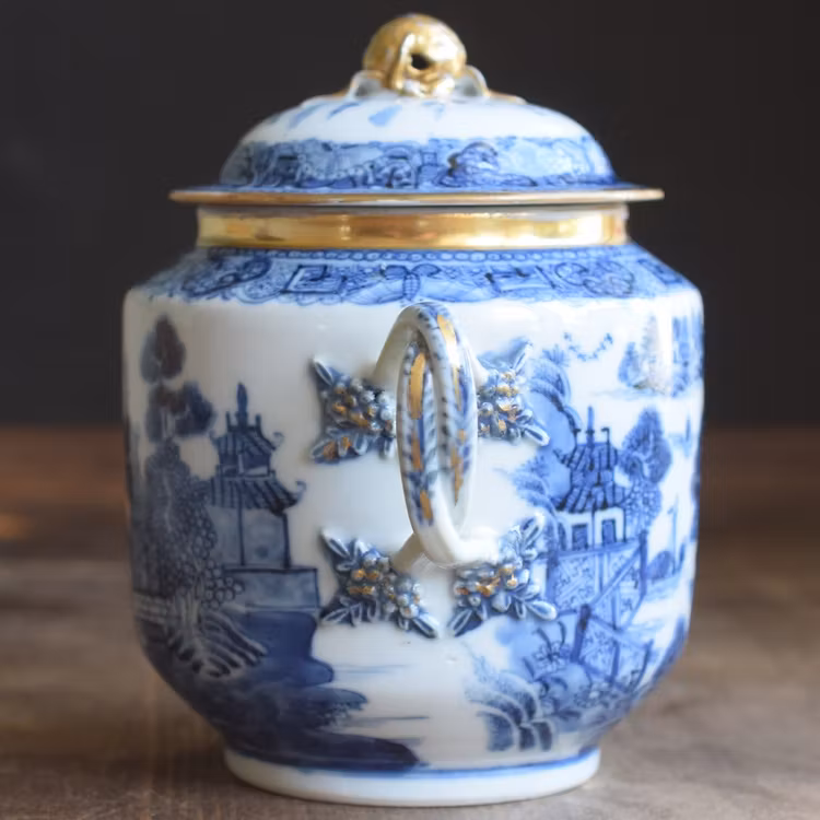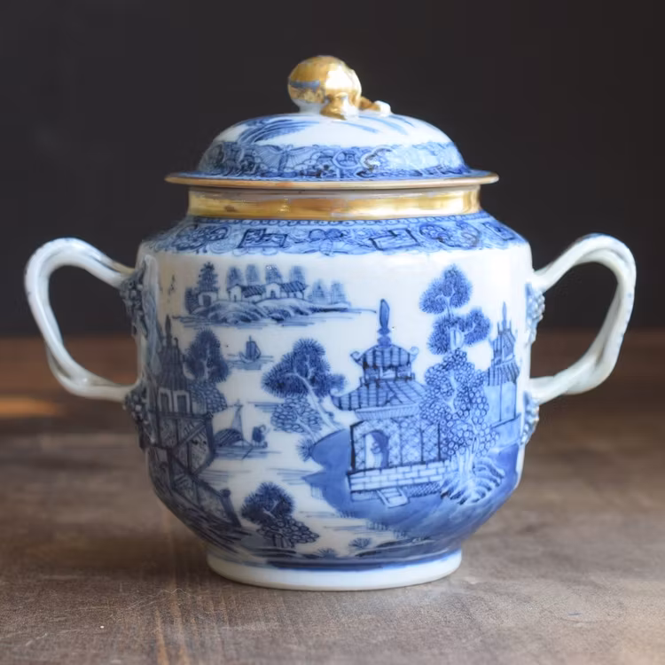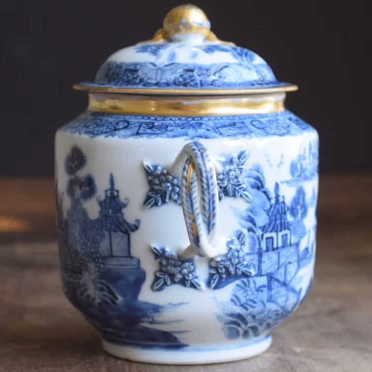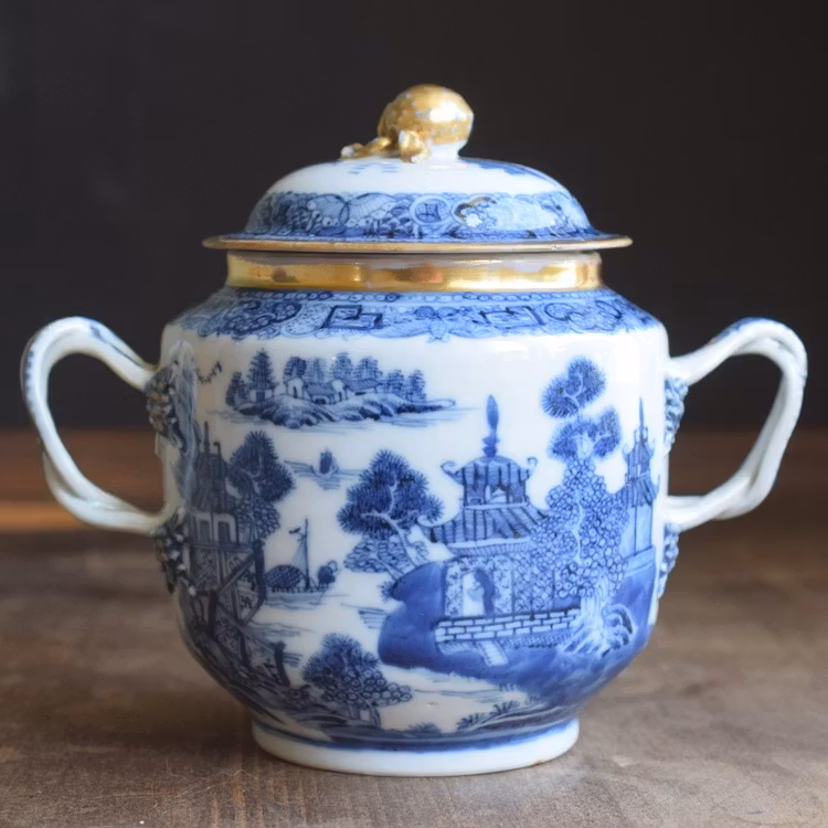 A beautifully and highquality blue and white export sugarbowl with gilt clobbering, made in the era of Qianlong 1736-1795.