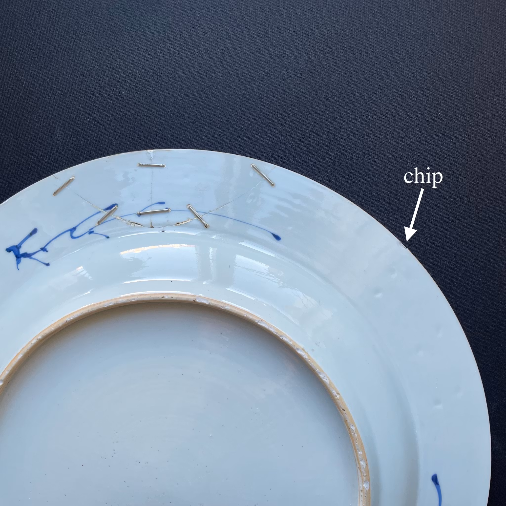Checked with UV Light. Two chips repaired with staples. One nick refilled and retouched. 2 hairlines. (One of which have been stabilized by staples) Some minor nicks. Wear and scratches from usage and age.