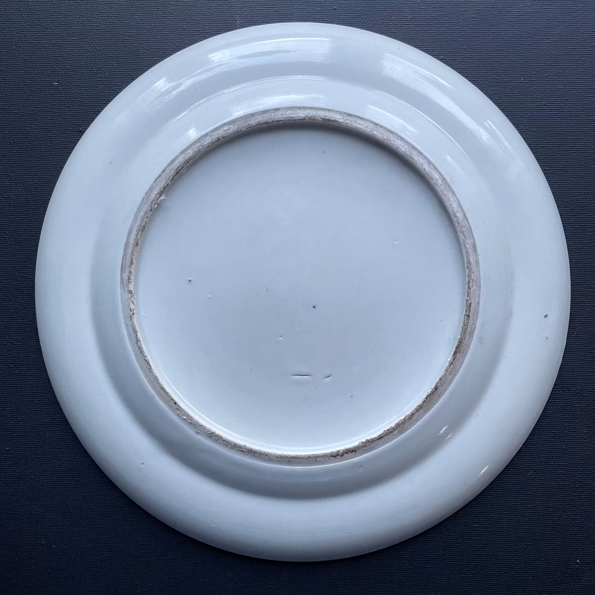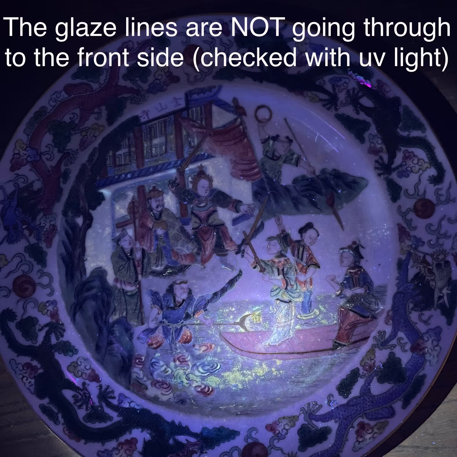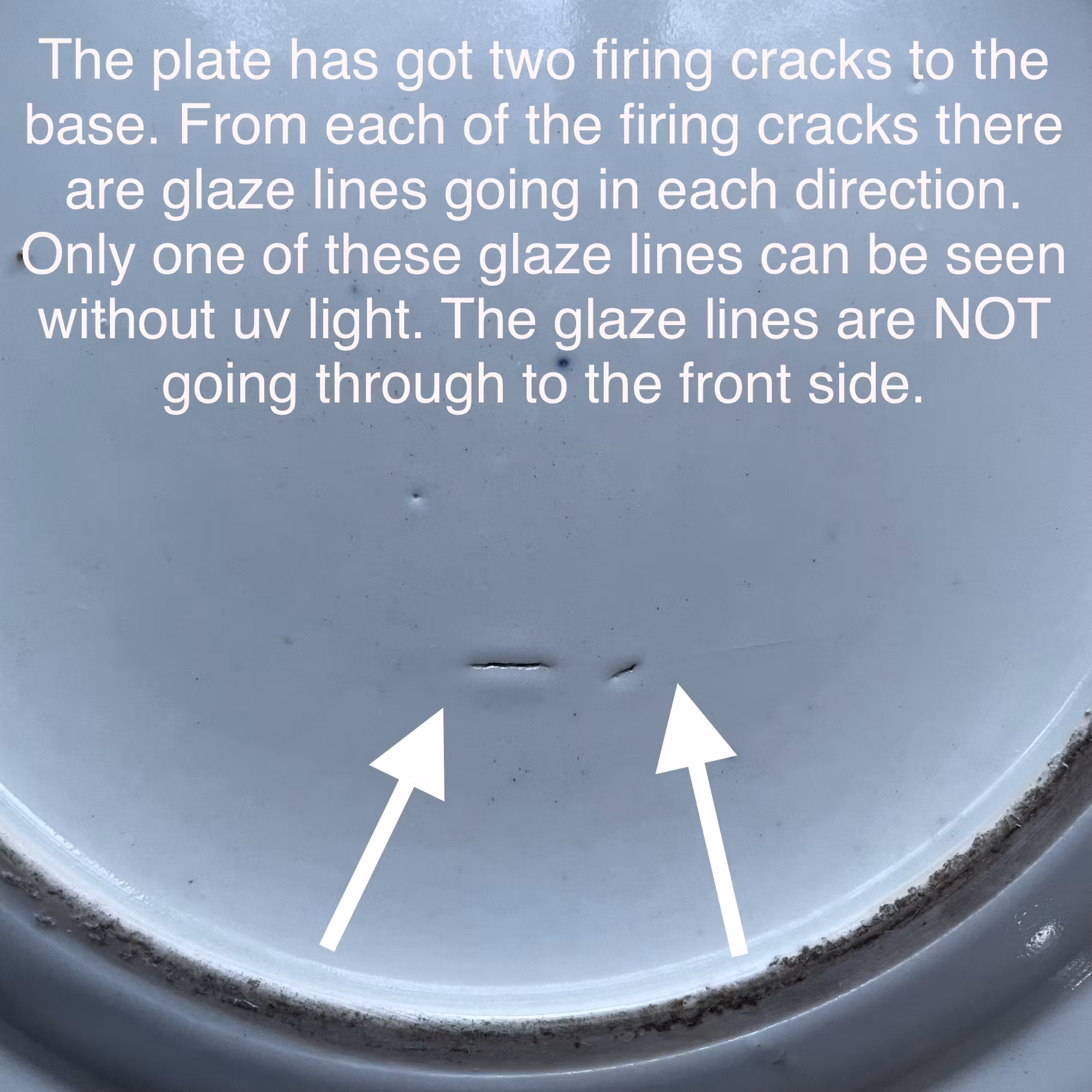 Checked with UV Light. The plate has got two firing cracks to the base. From each of the firing cracks there are glaze lines going in each direction. Only one of these glaze lines can be seen without uv light. The glaze lines are NOT going through to the front side (checked with uv light). Manufacturing flaws and general wear.