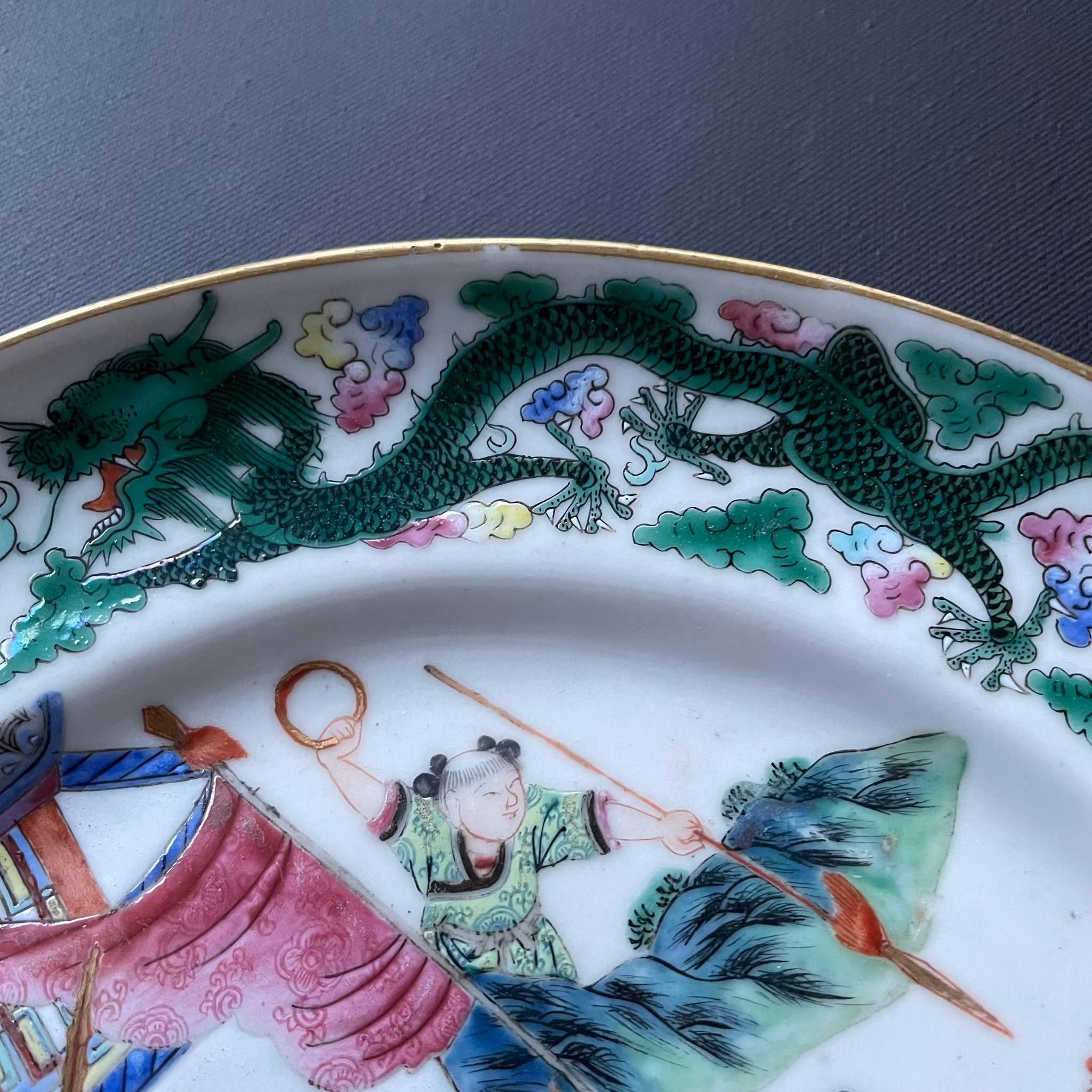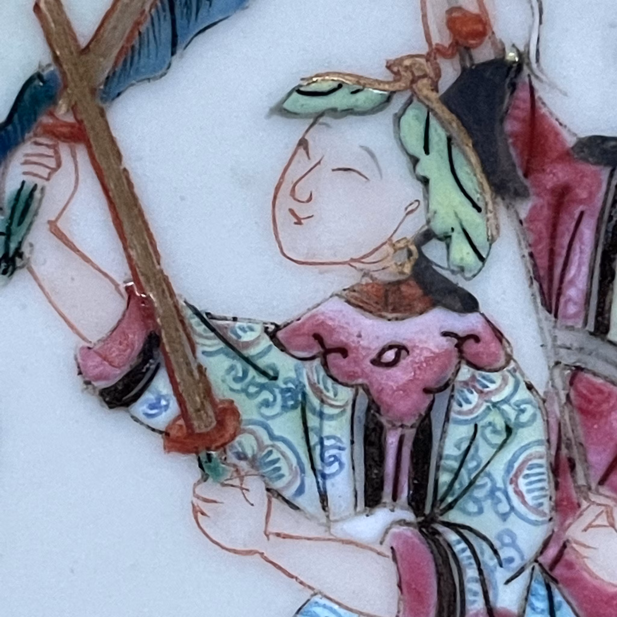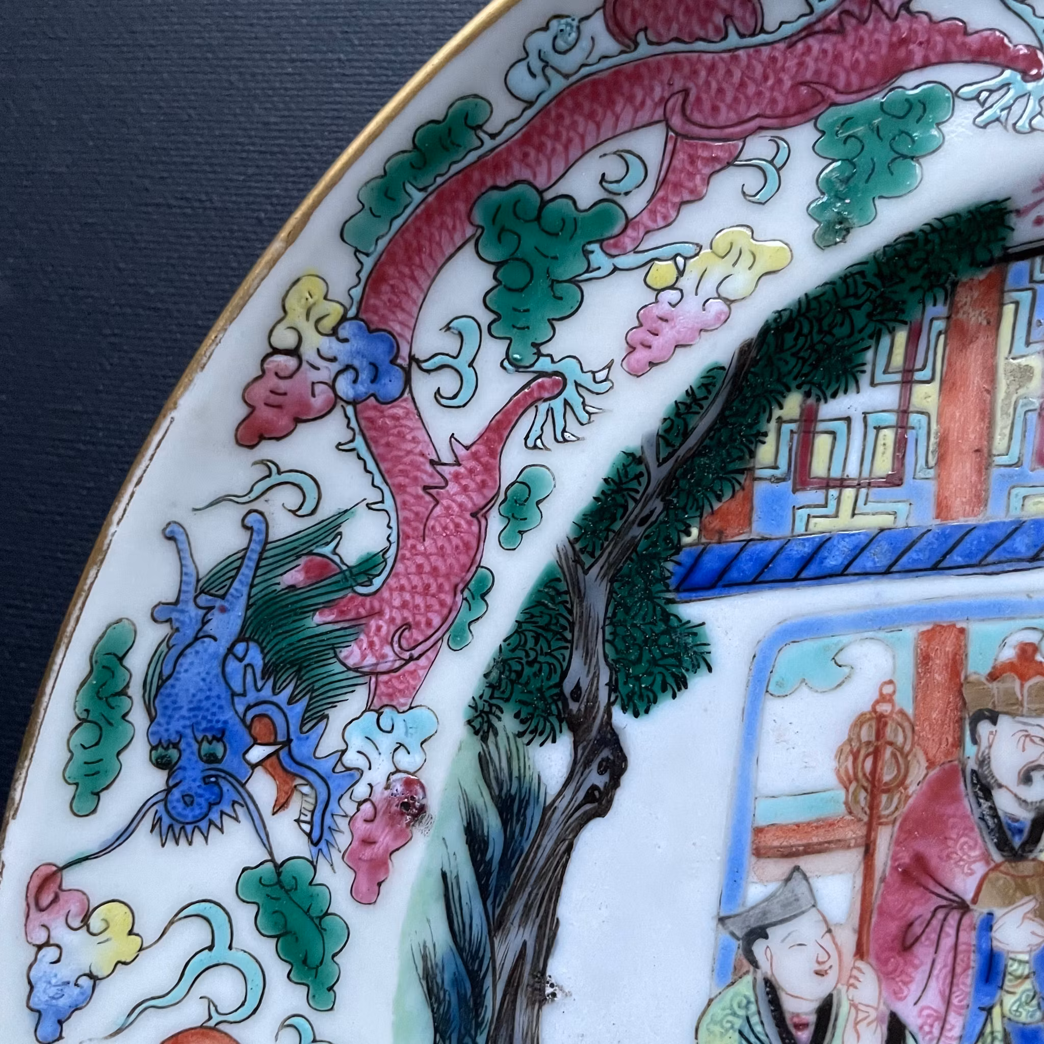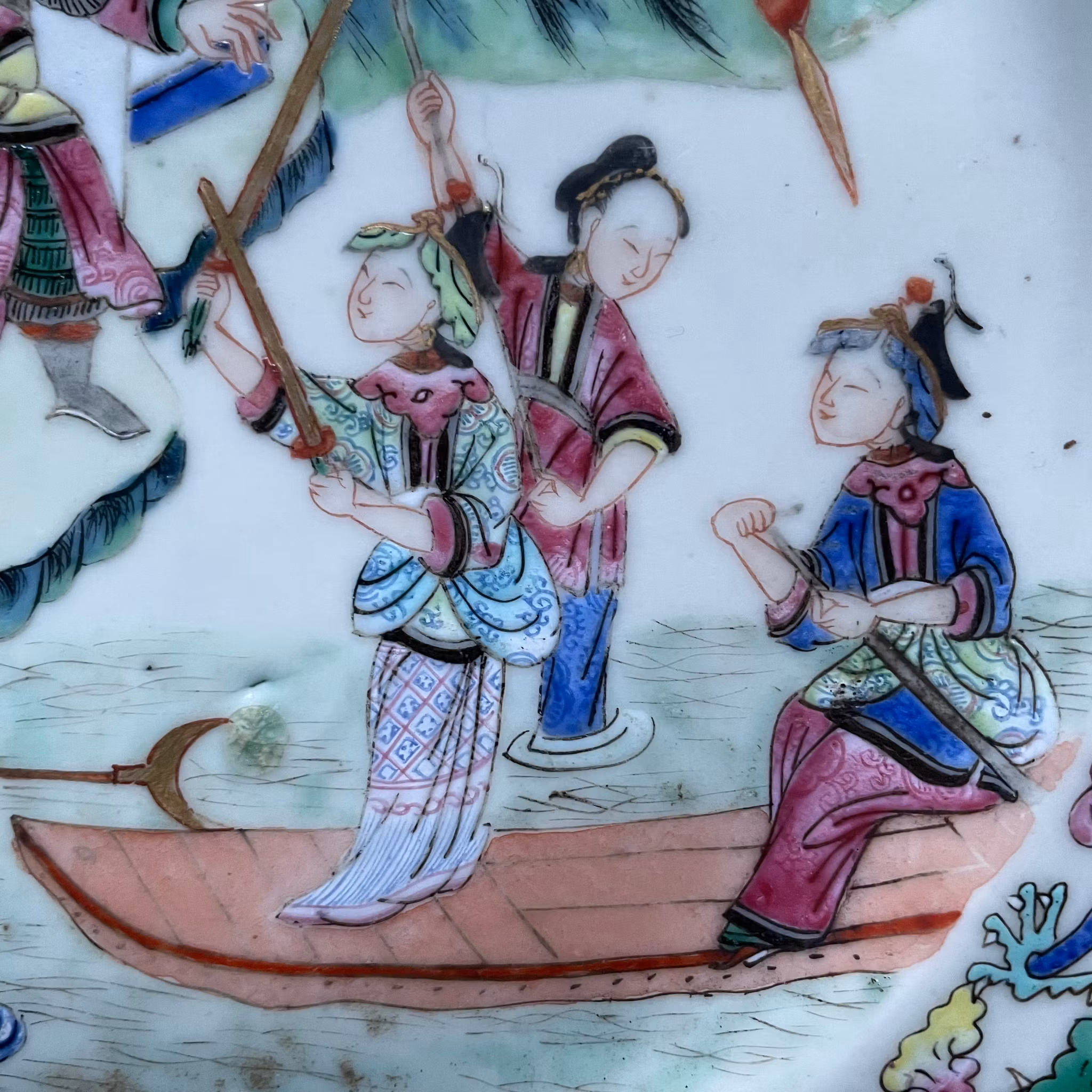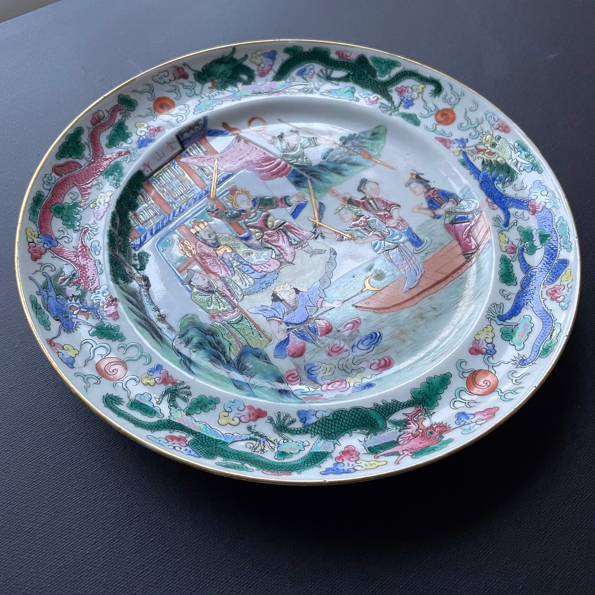 A spectacular and rare plate decorated with a scene from the famous folklore story” The Legend of the White Snake” (白蛇传). You can google the full story but in short it tells the love story between a human and an immortal snake spirit. The scene on the plate is depicting the episode when the snake spirit try to get to her husband who is at the Golden mountain temple. This particular episode of the legend is called” flooding the Golden Mountain Temple” (水漫金山寺). The details of the decoration are simply amazing depicting every part of this episode in such vivid manner.