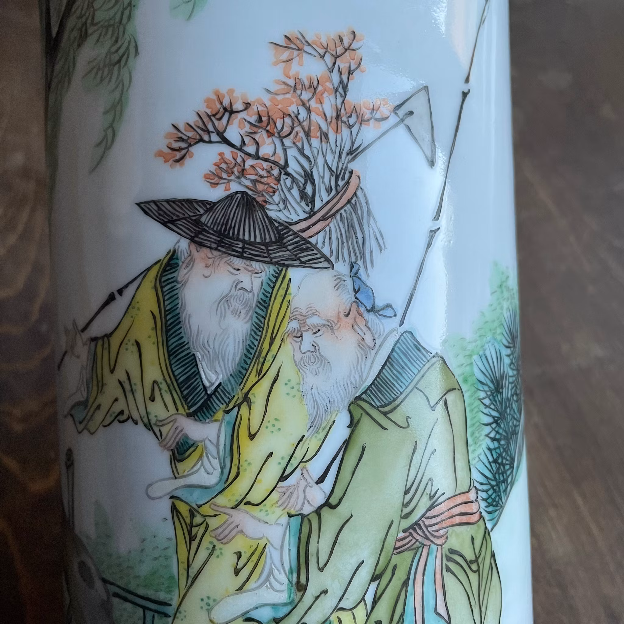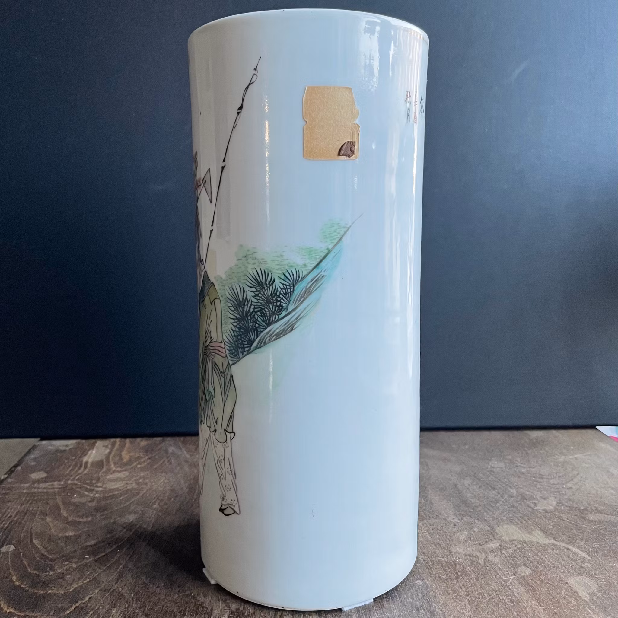 An antique handpainted brushpot / hatstand decorated figural scenes.