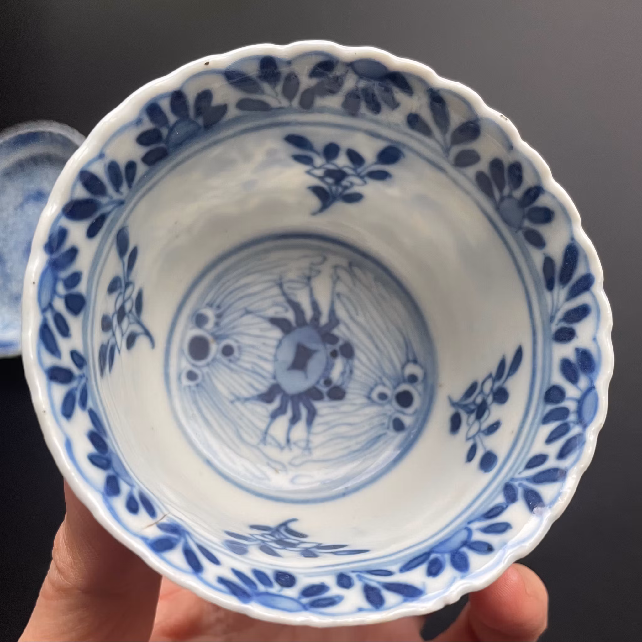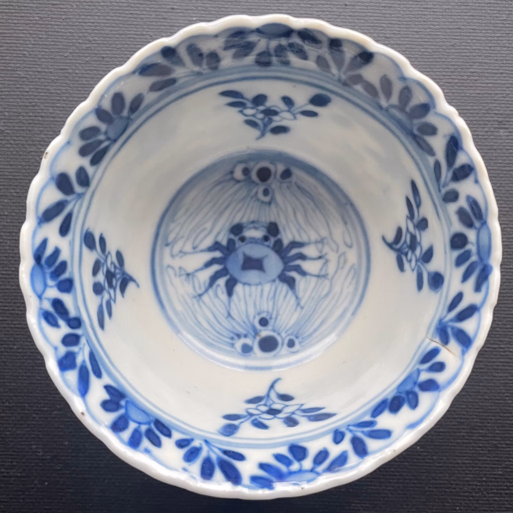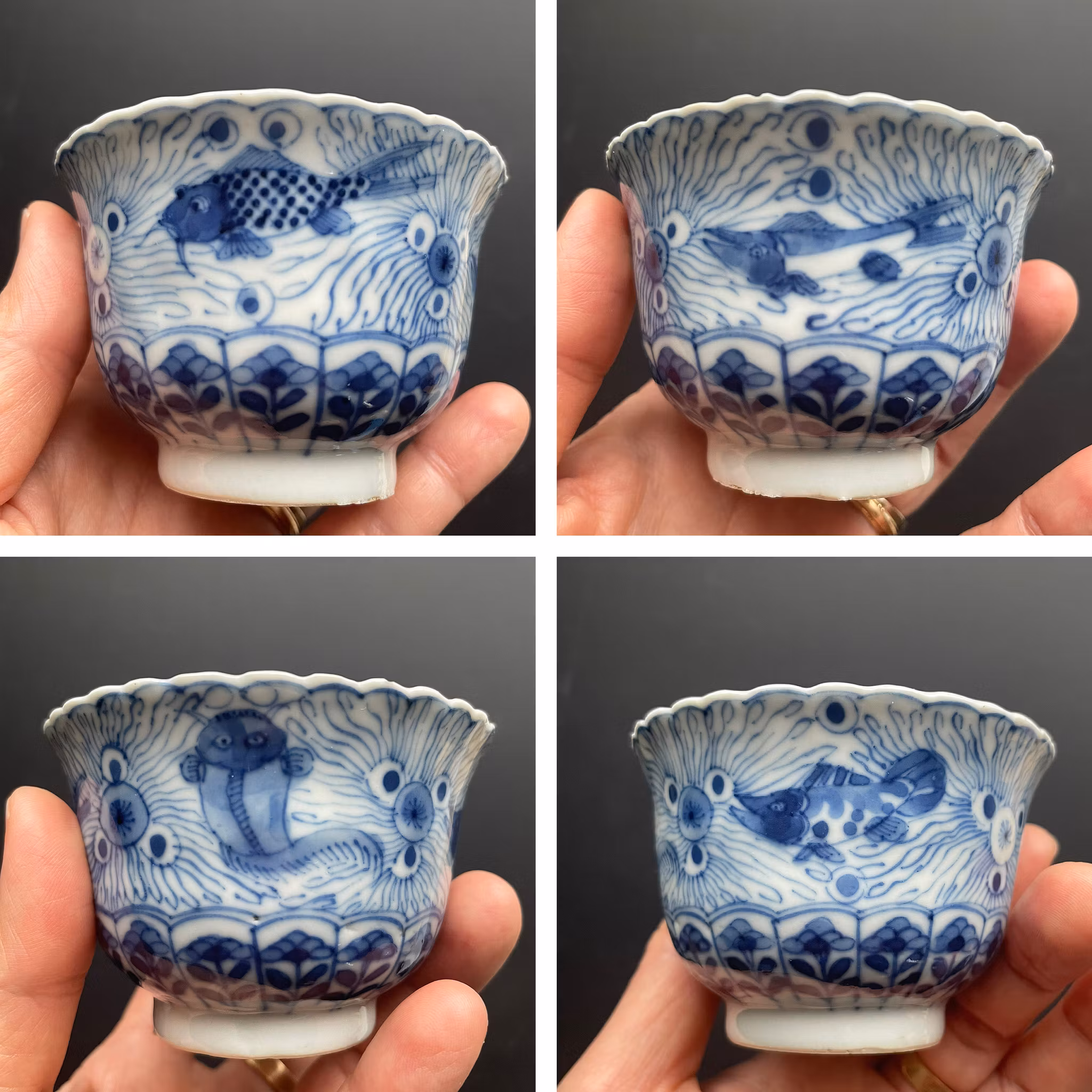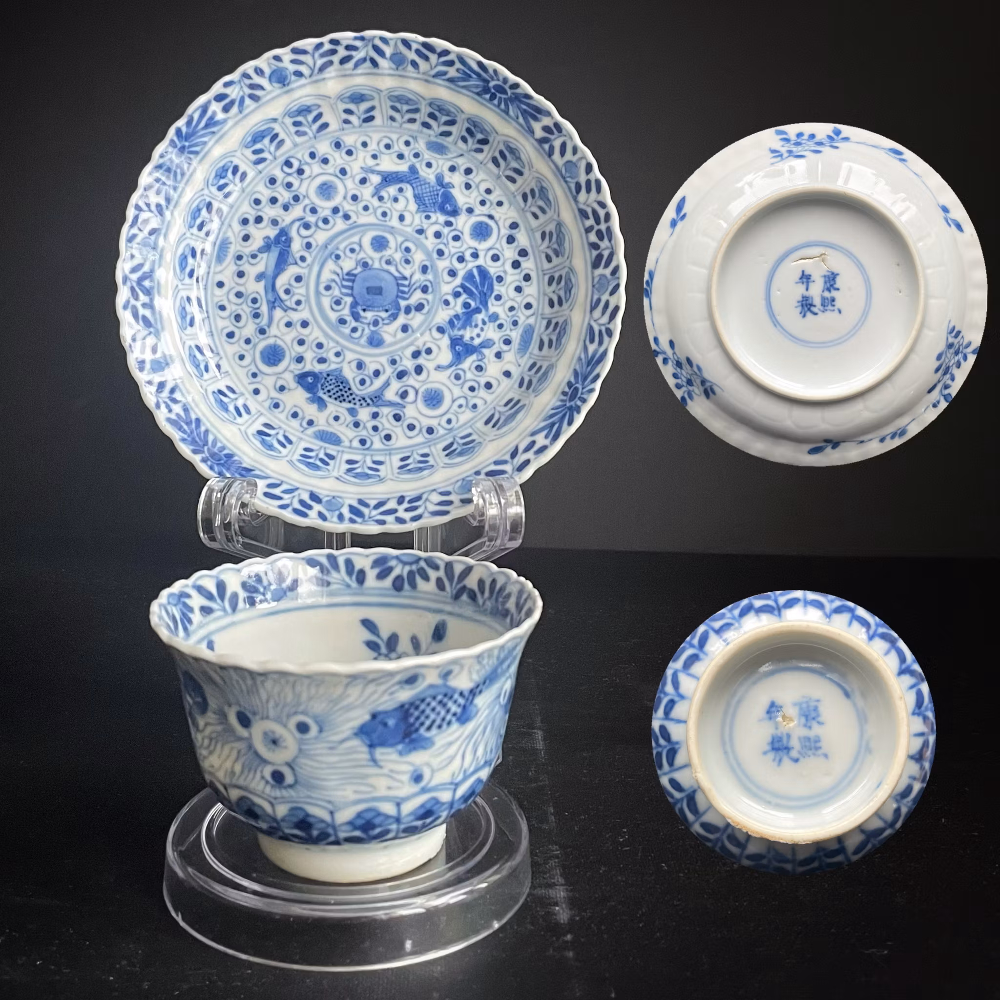 A very nice set of cup and saucer. Decorated with fish and crab. Kangxi 4 characters mark at the base, but late Qing.
