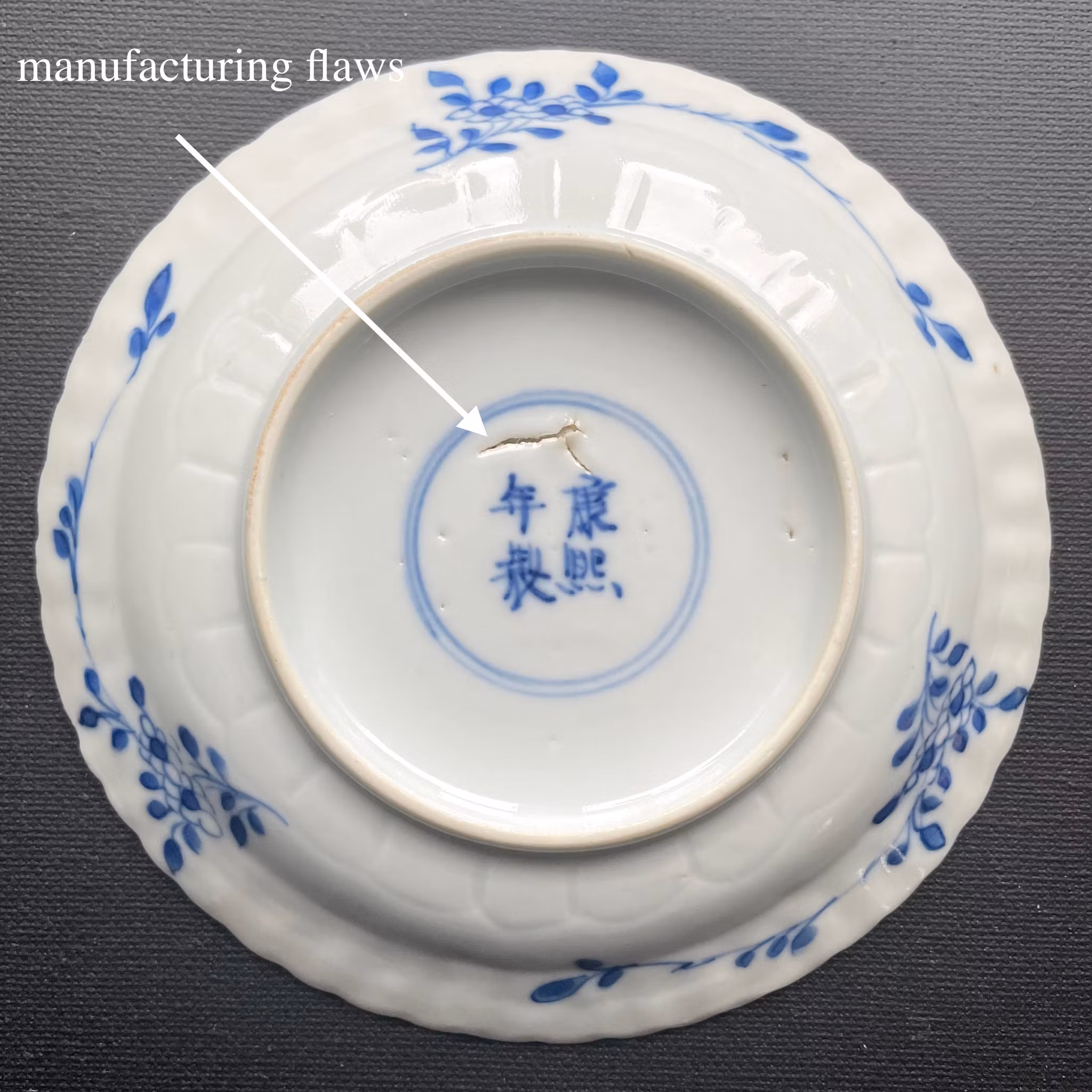 Checked with UV Light. No Crack, No hairlines. The saucer has a manufacturing flaw (firing crack) to the base, and the cup also have a firing crack from manufacturing to the inside of the cup. Not going through. (see pictures) Manufacturing flaw to the base of the cup. Both cup and saucer has micro nicks / frittings around the rim.