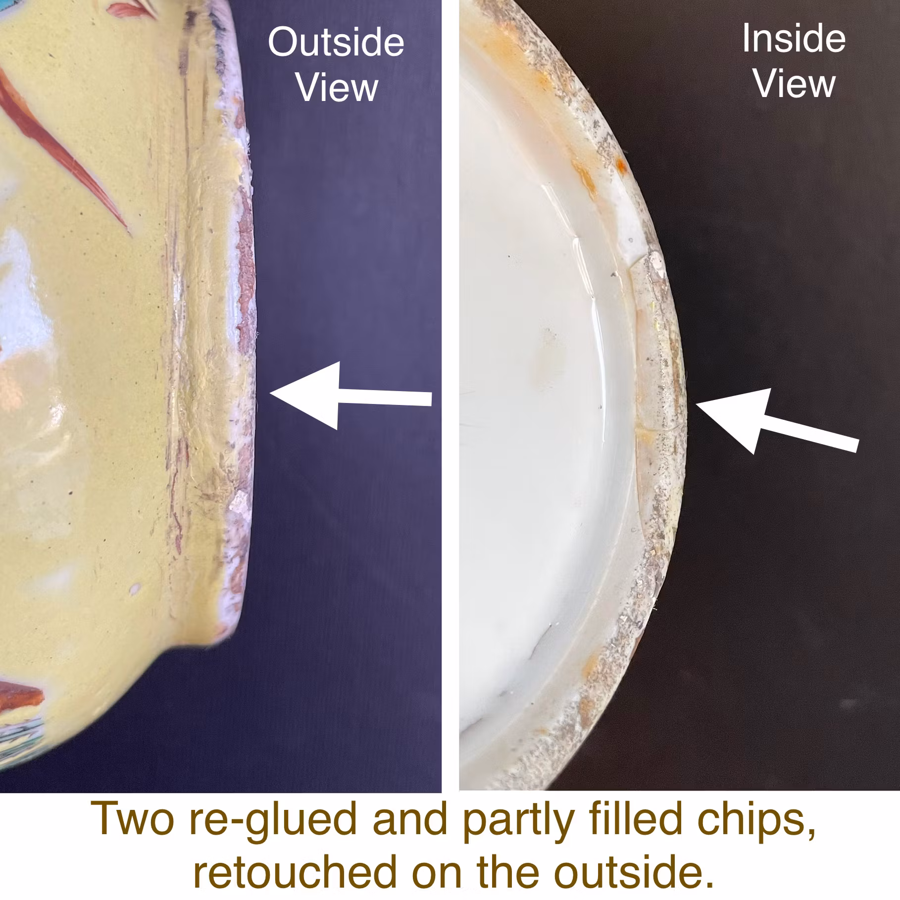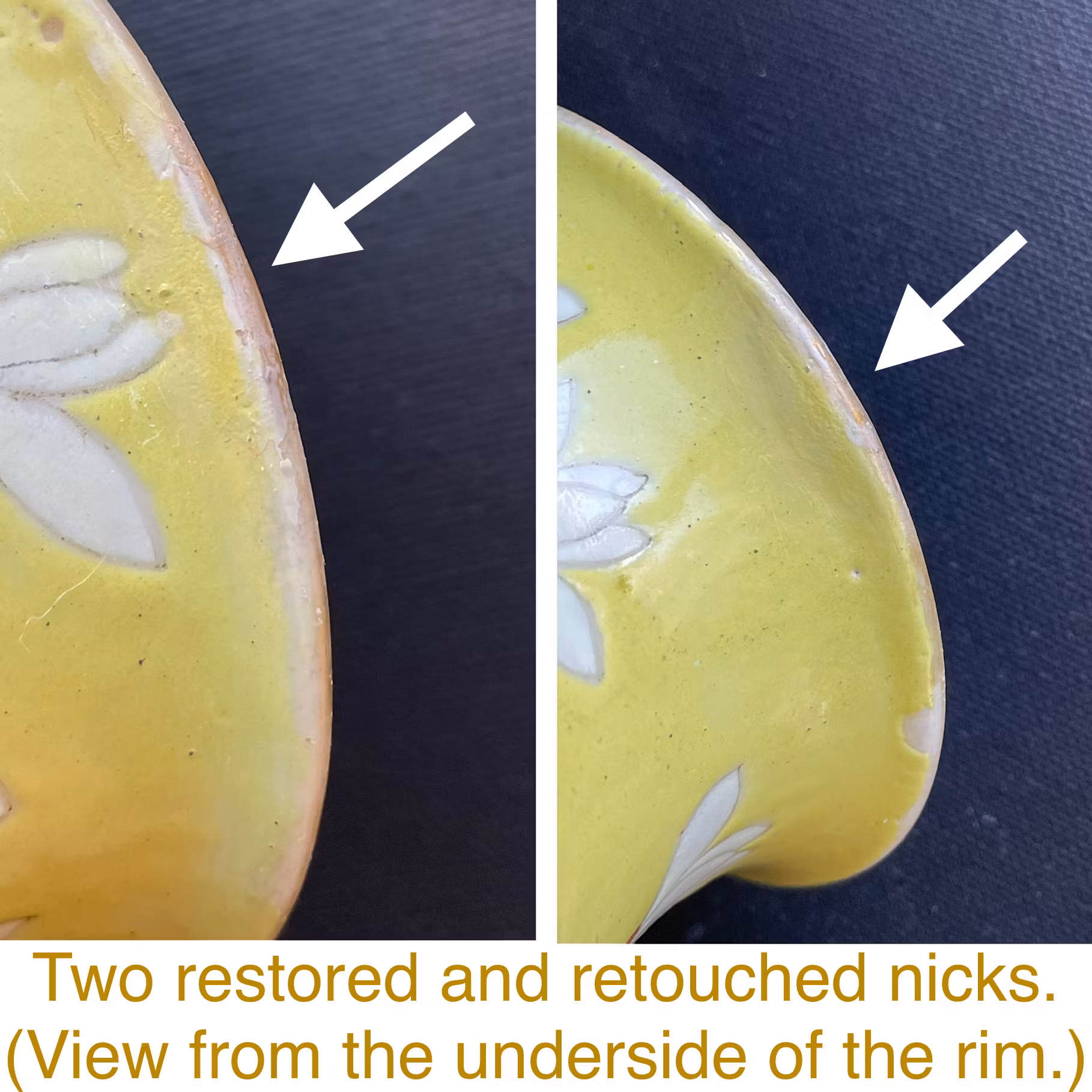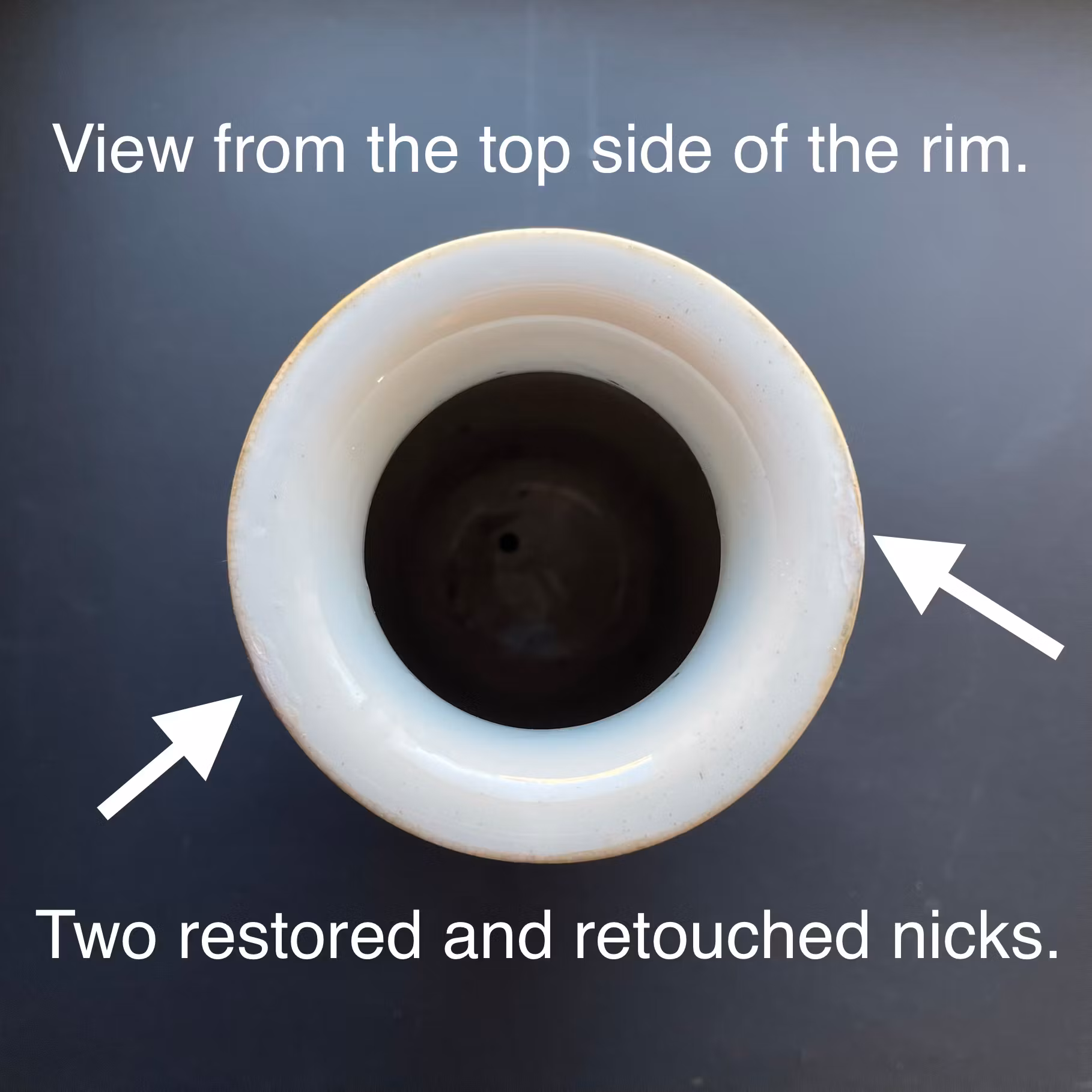 Checked with UV Lamp. The vase has been drilled at the base. Two small restored and retouched chips to the rim. Footring have two re-glued and partly filled nicks. (retouched on the outside of the footring) Glaze loss, scratches and wear.