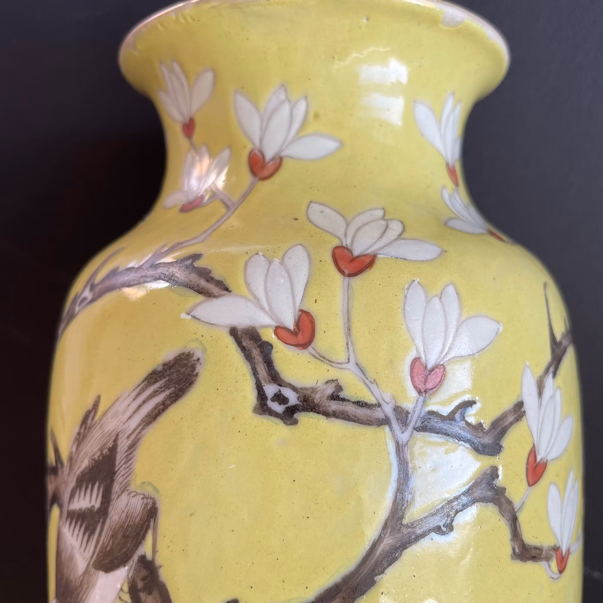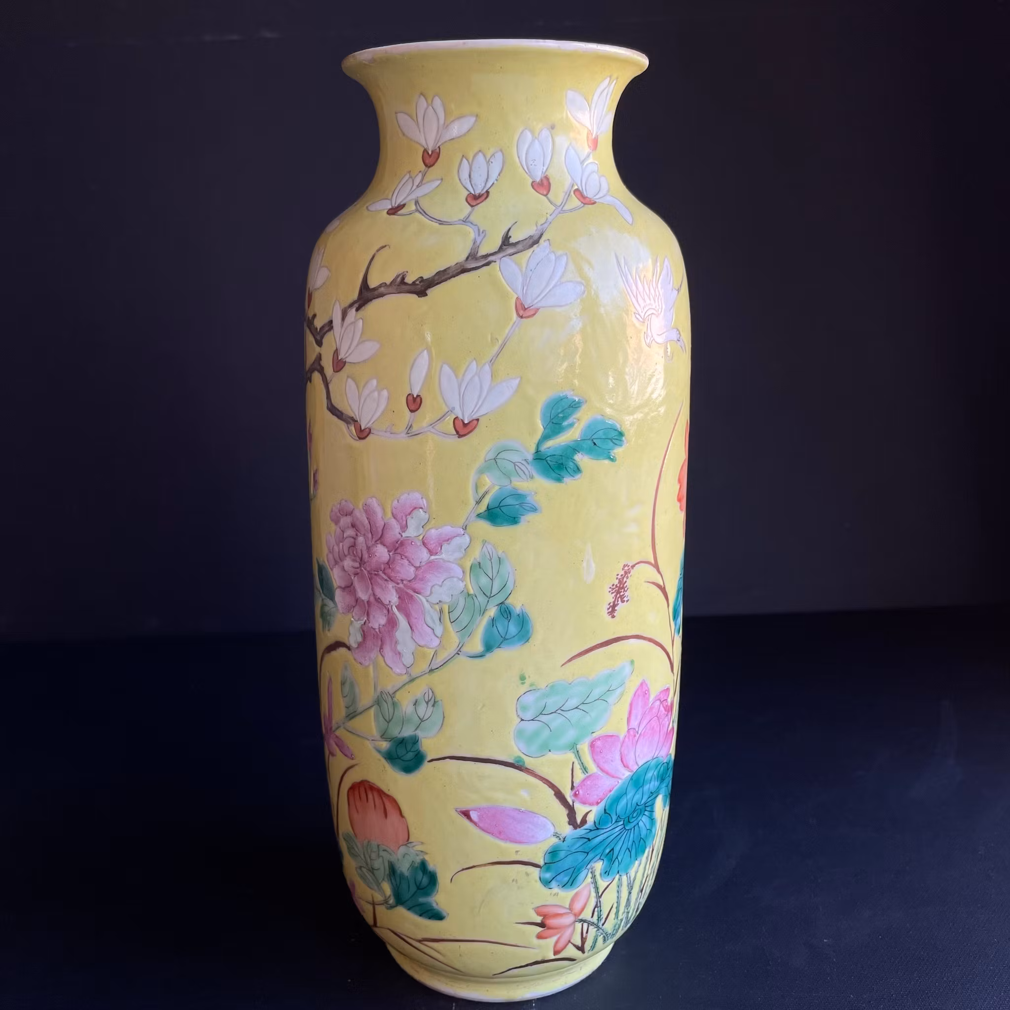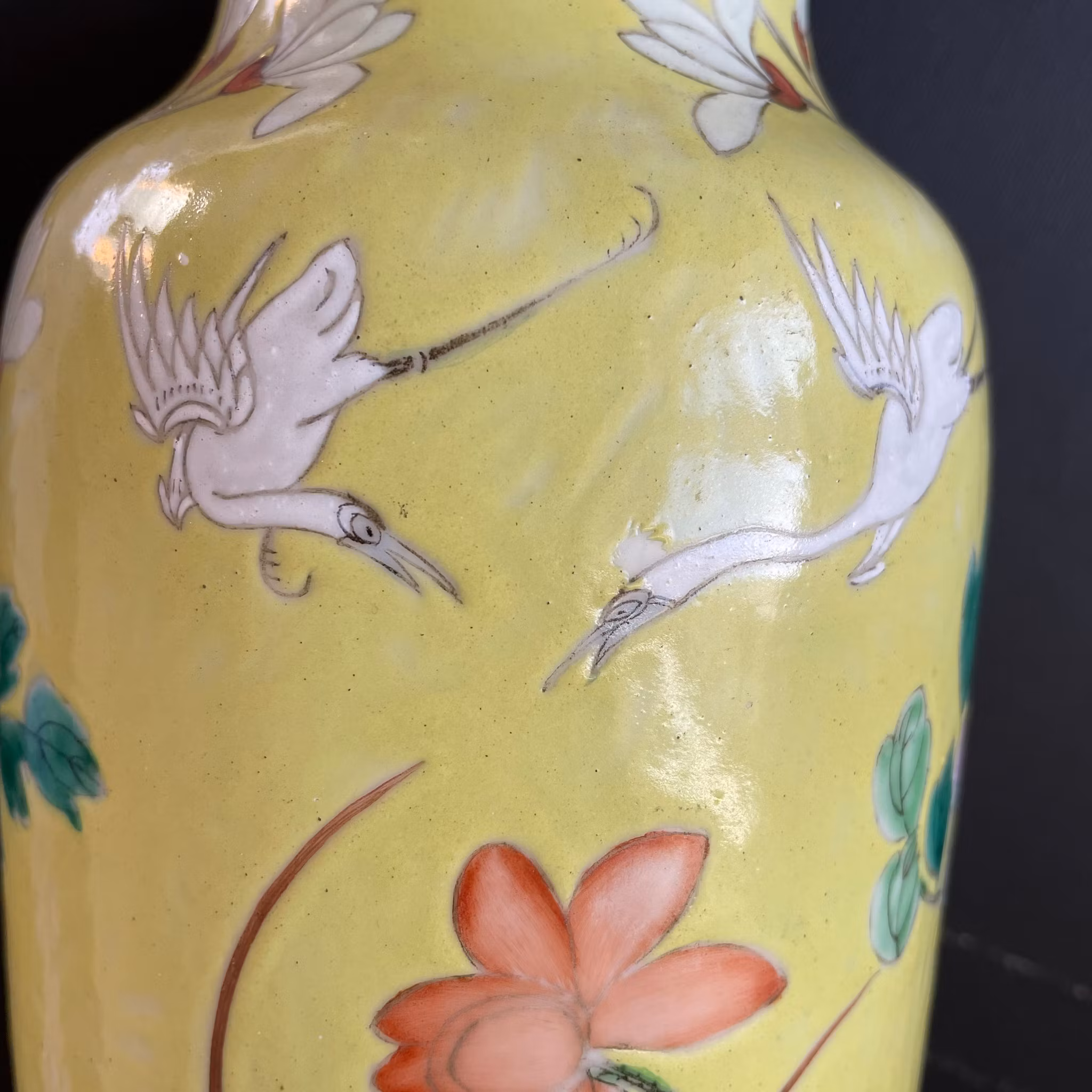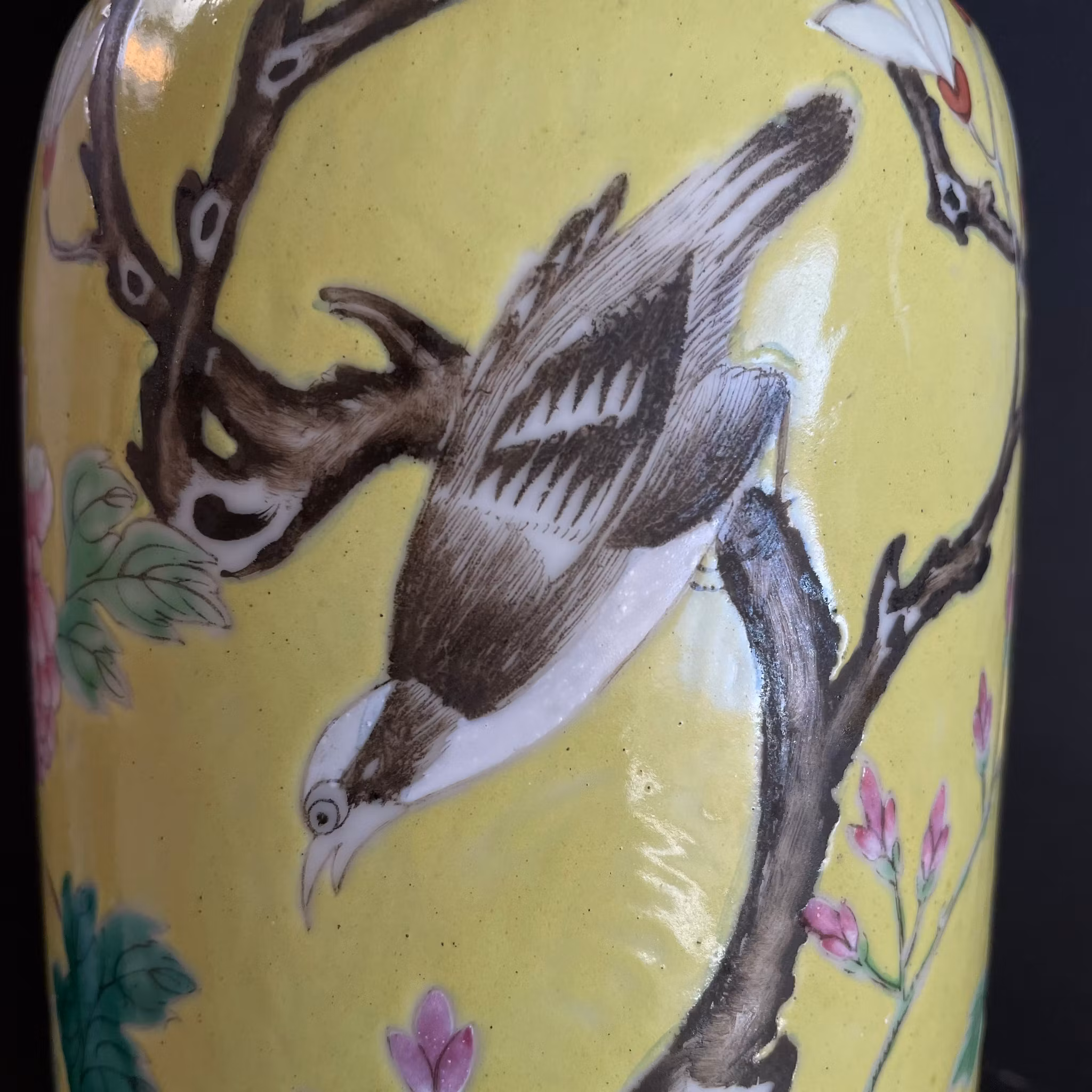 A very beautiful yellow ground vase decorated with flowers, birds and lotus flowers. Guangxu mark to the base and likely from the period.