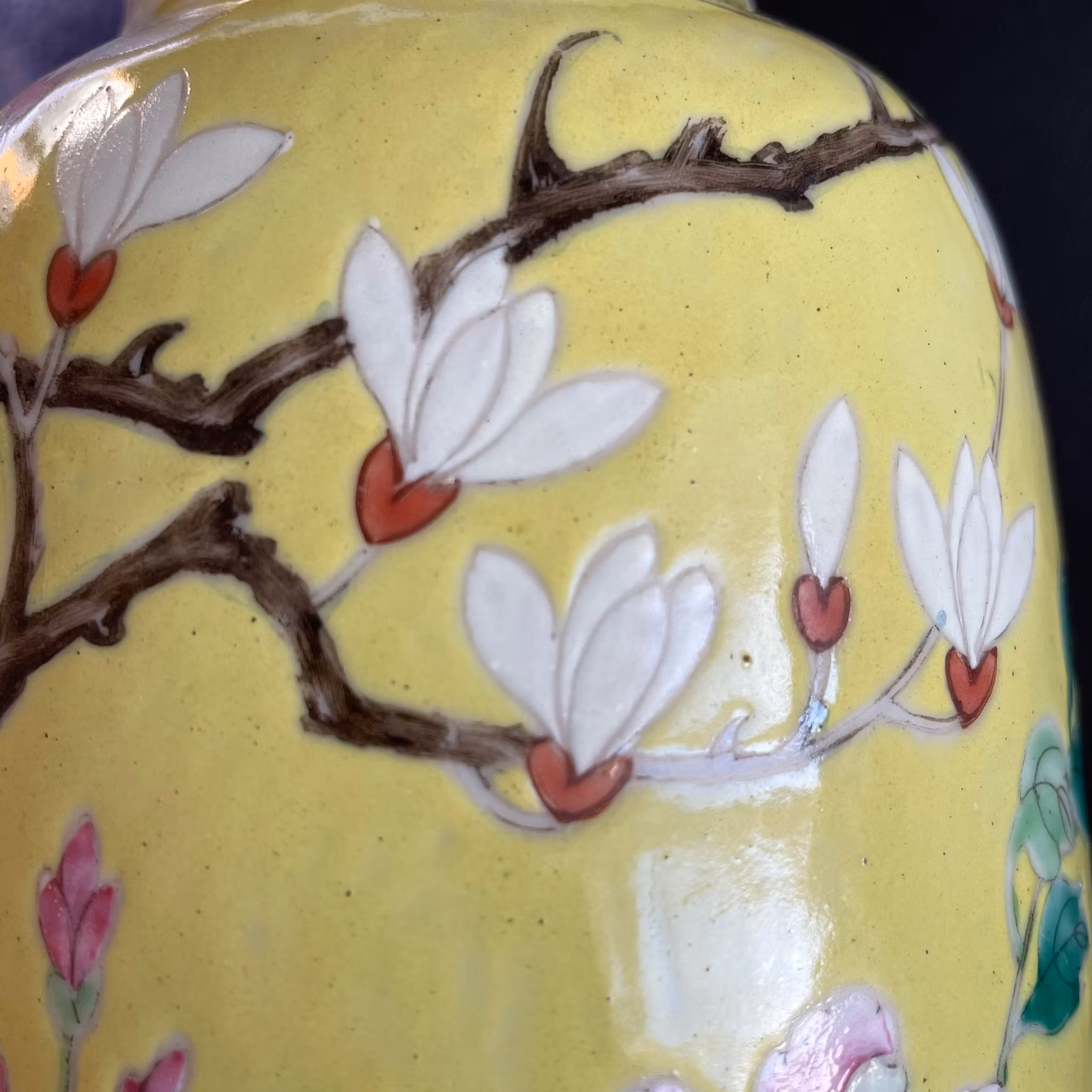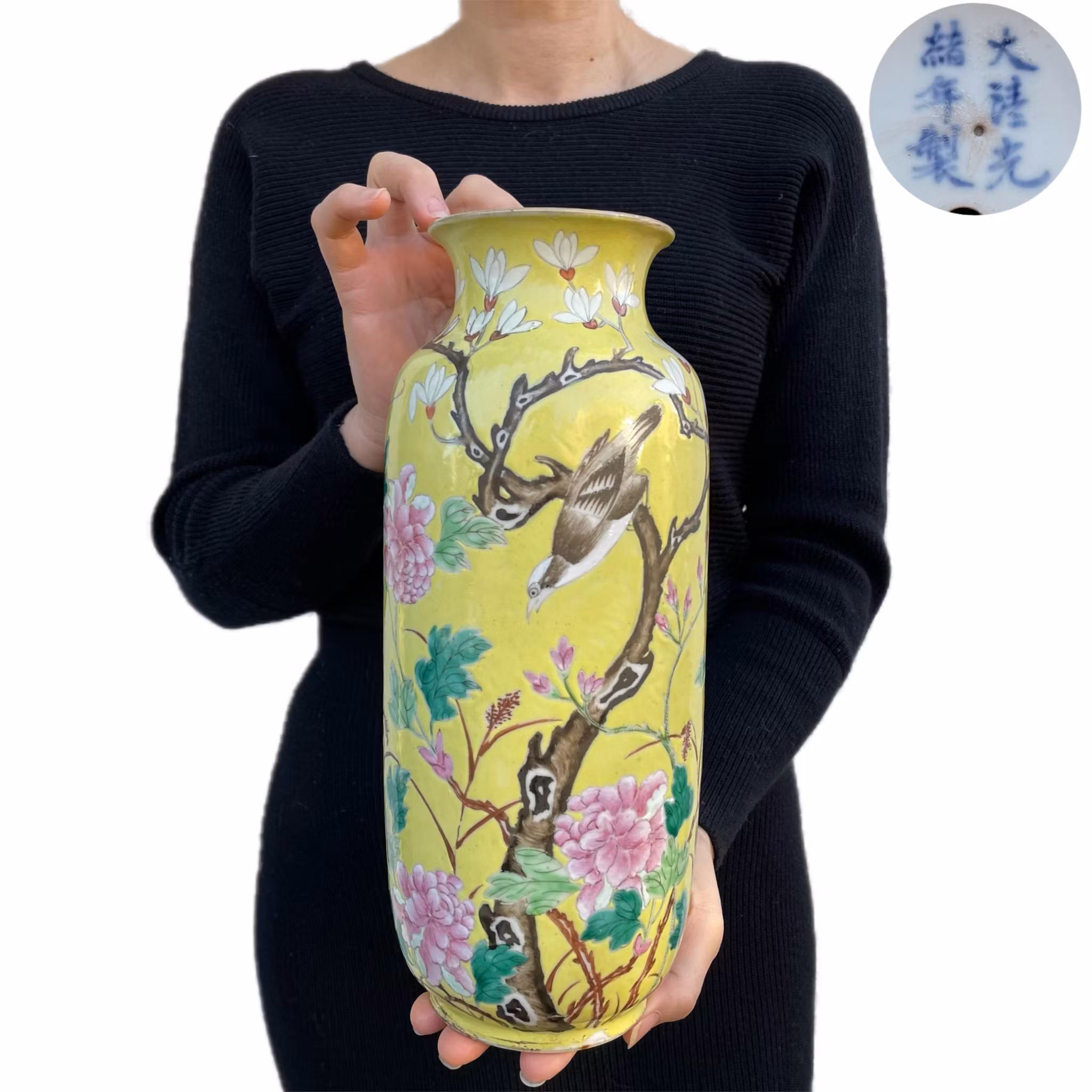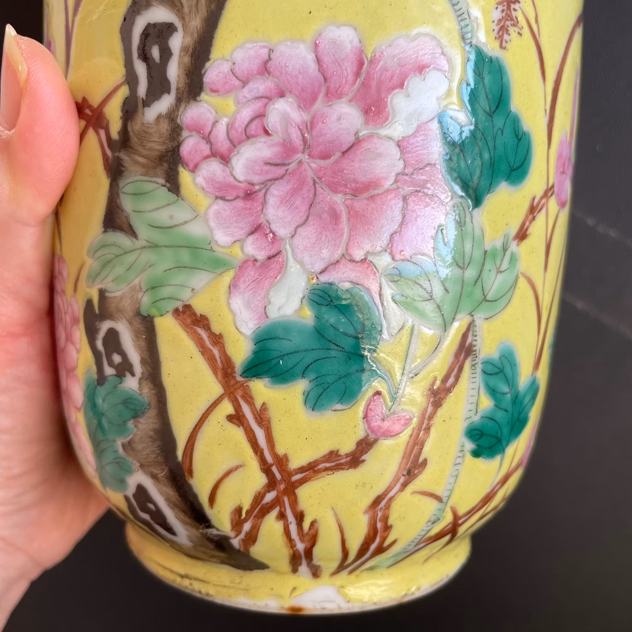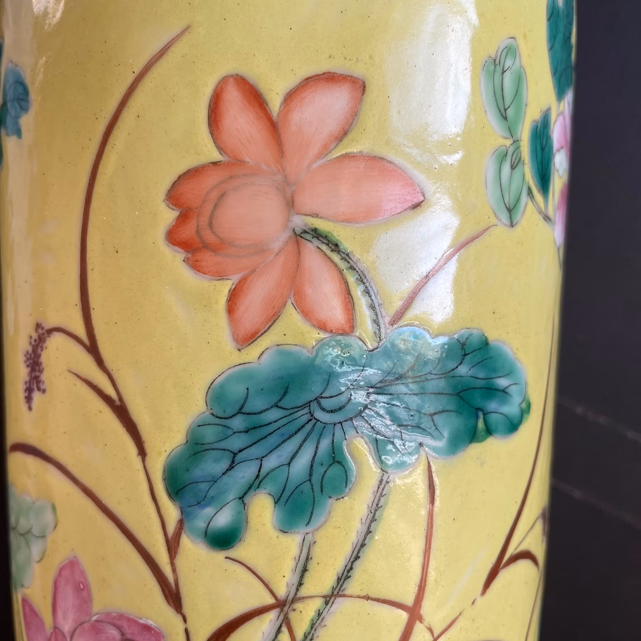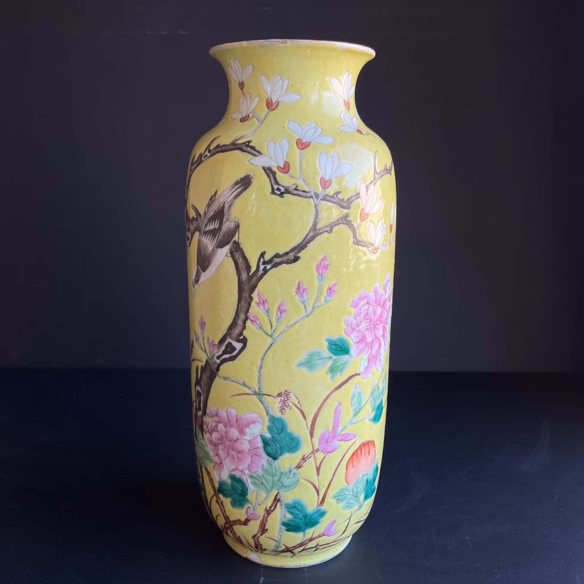 A very beautiful yellow ground vase decorated with flowers, birds and lotus flowers. Guangxu mark to the base and likely from the period.
