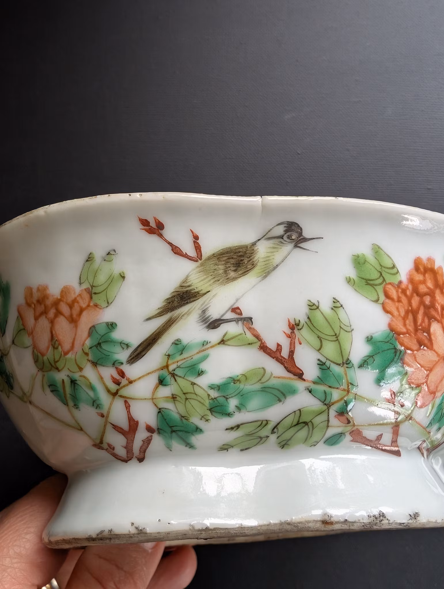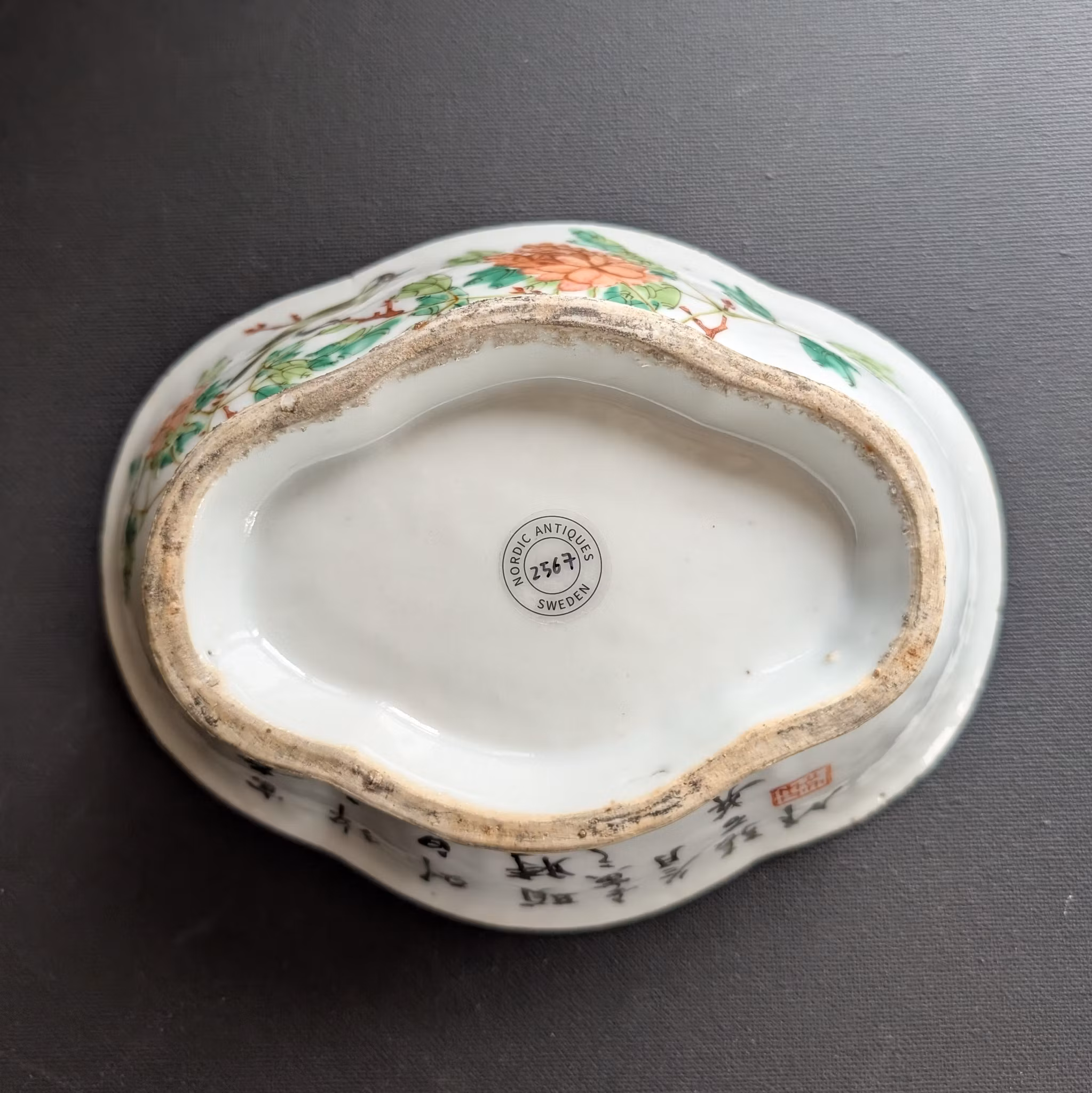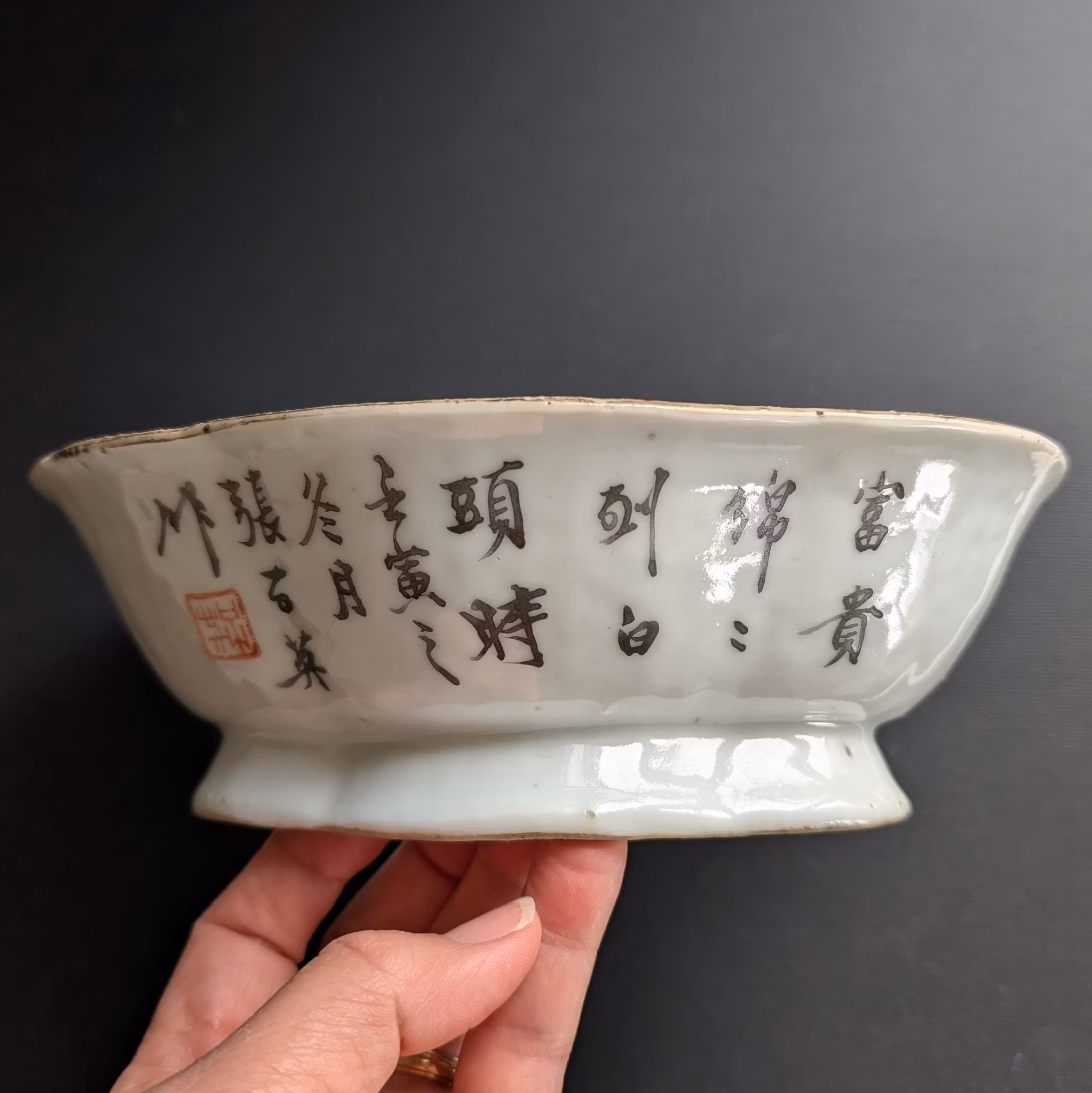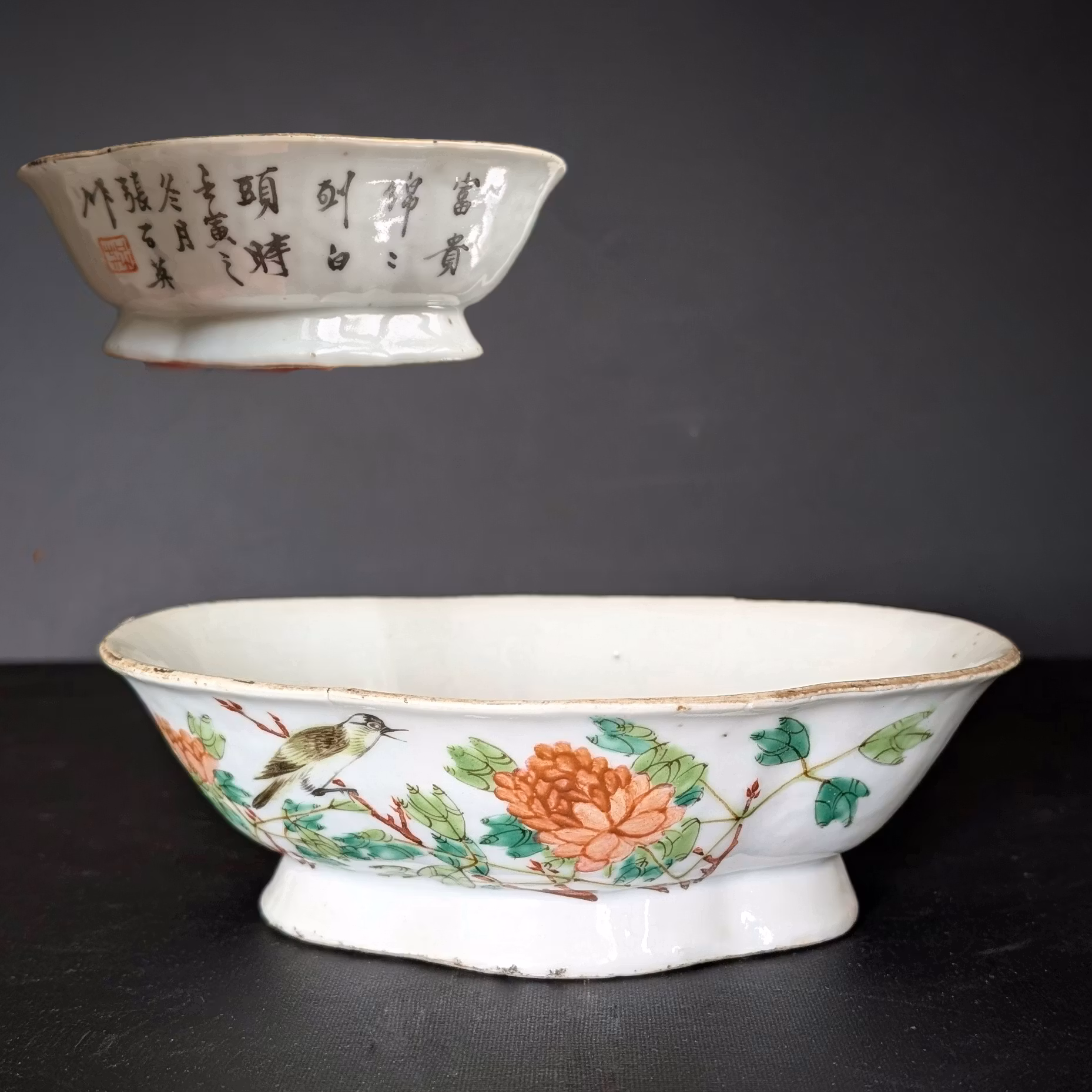 Nice altar bowl decorated with flowers and bird on one side the other with calligraphy. Signed 张子英 and dated to the year 1902, Guangxu period.