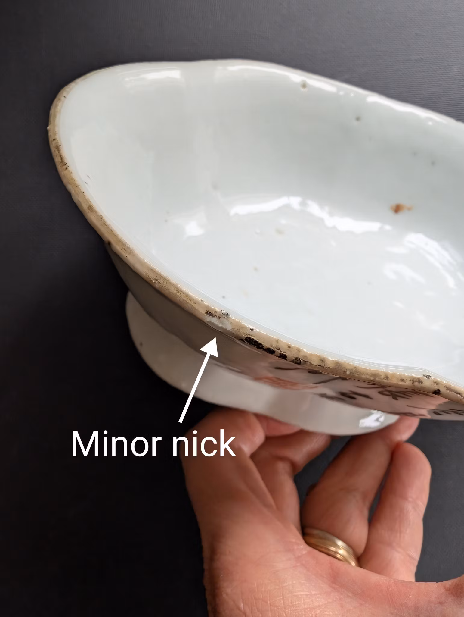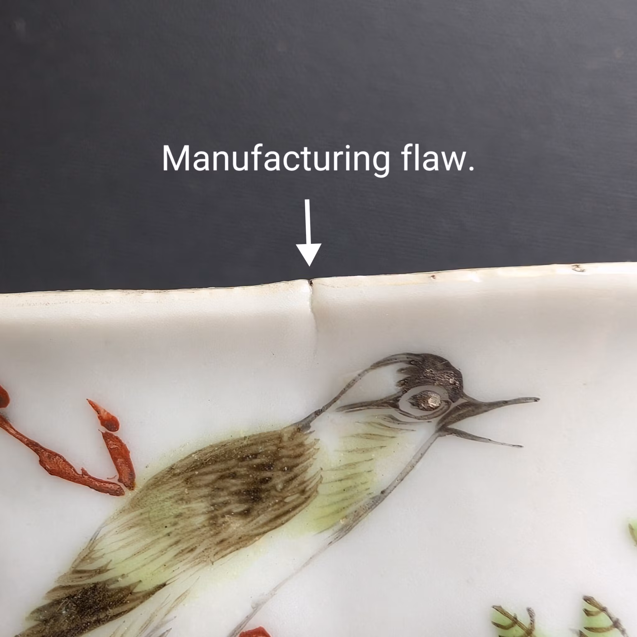 Checked with UV Lamp. Overall in nice condition. One firing / baking defect to the rim, one minor nick to the rim. General wear and manufacturing flaws.