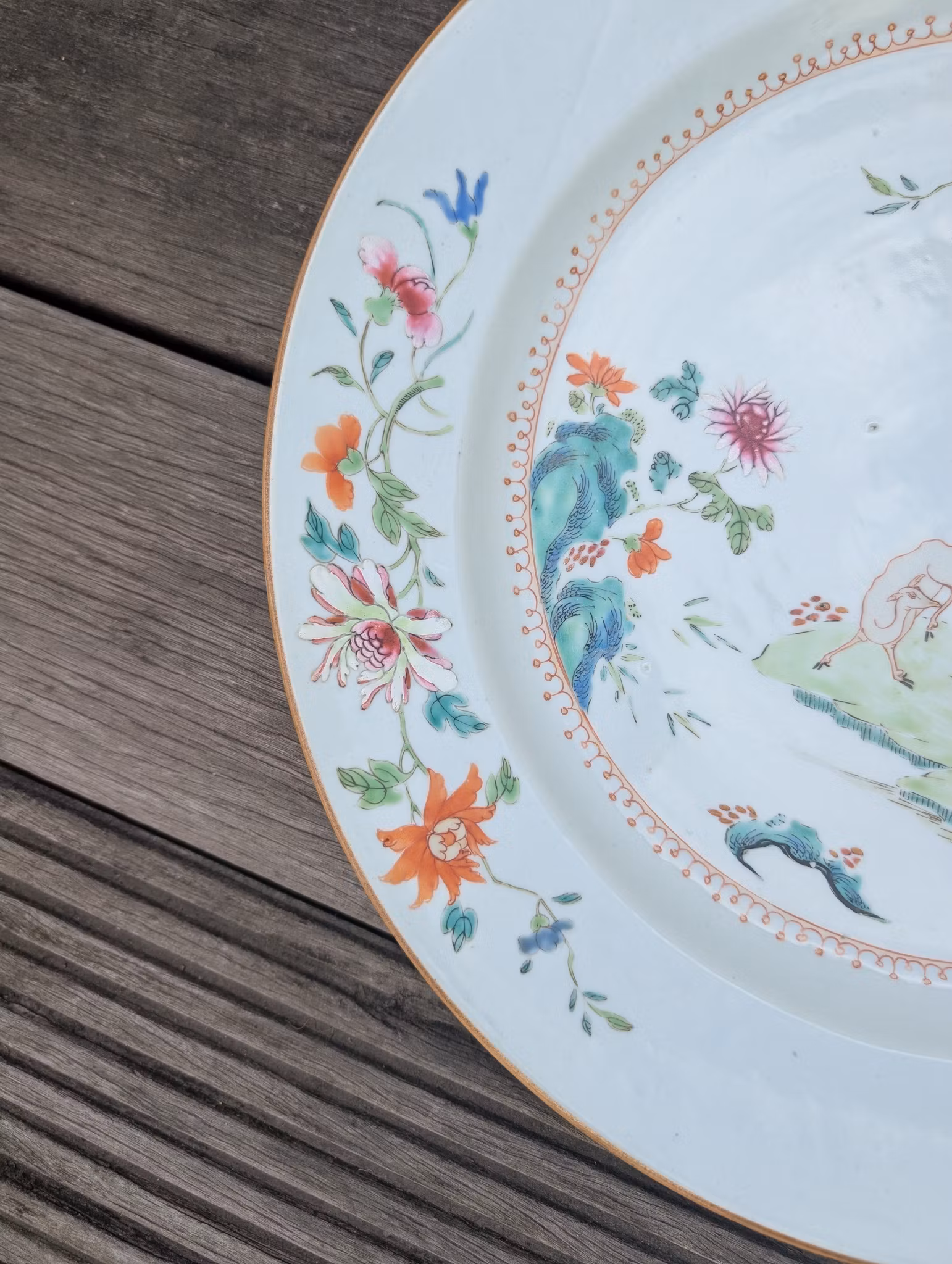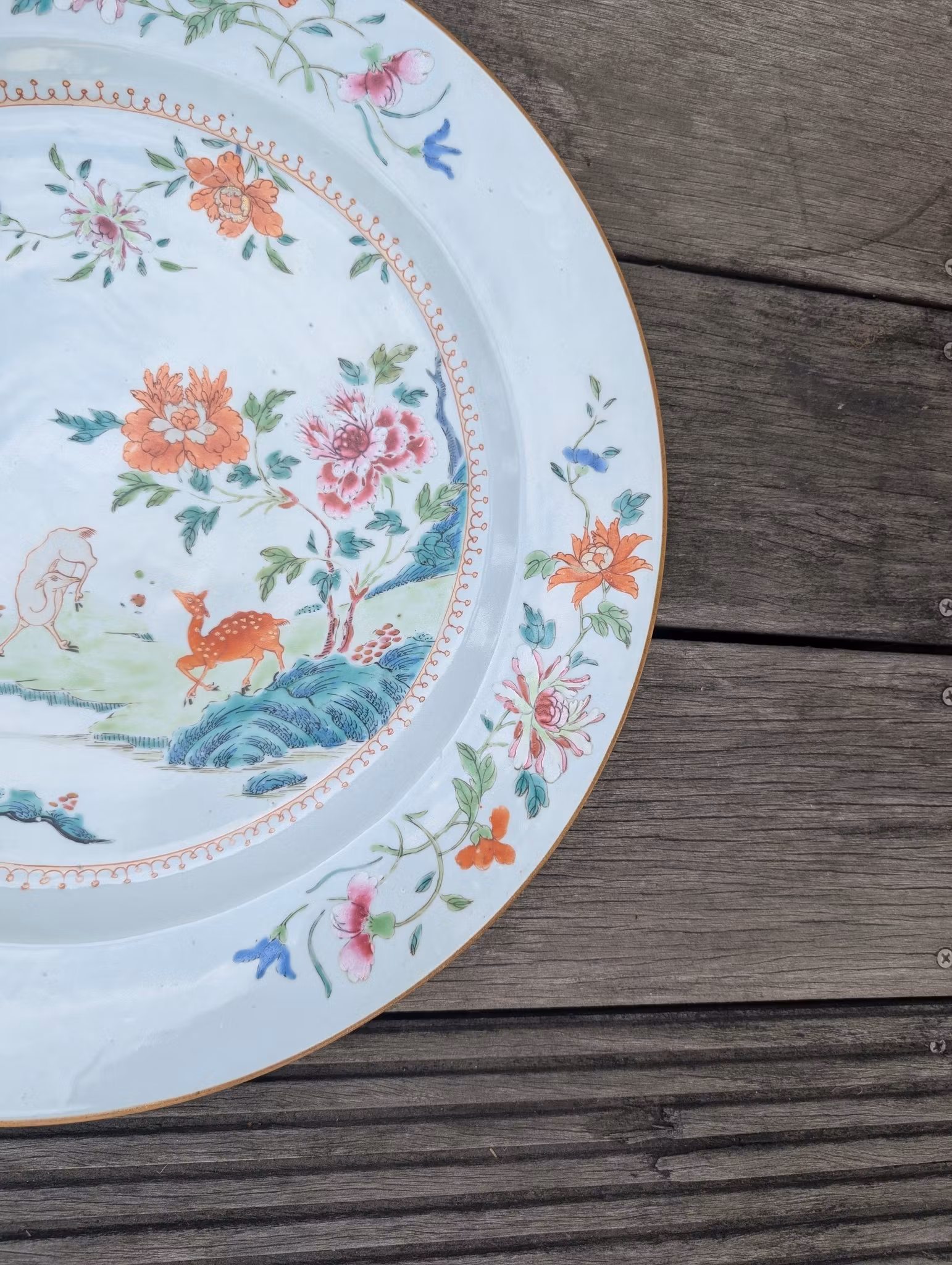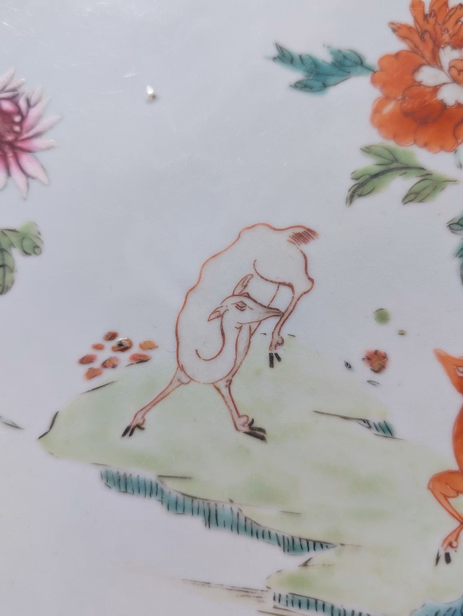 Nice large famille rose charger decorated with two deer in a landscape scene. 18th century, Qianlong period.