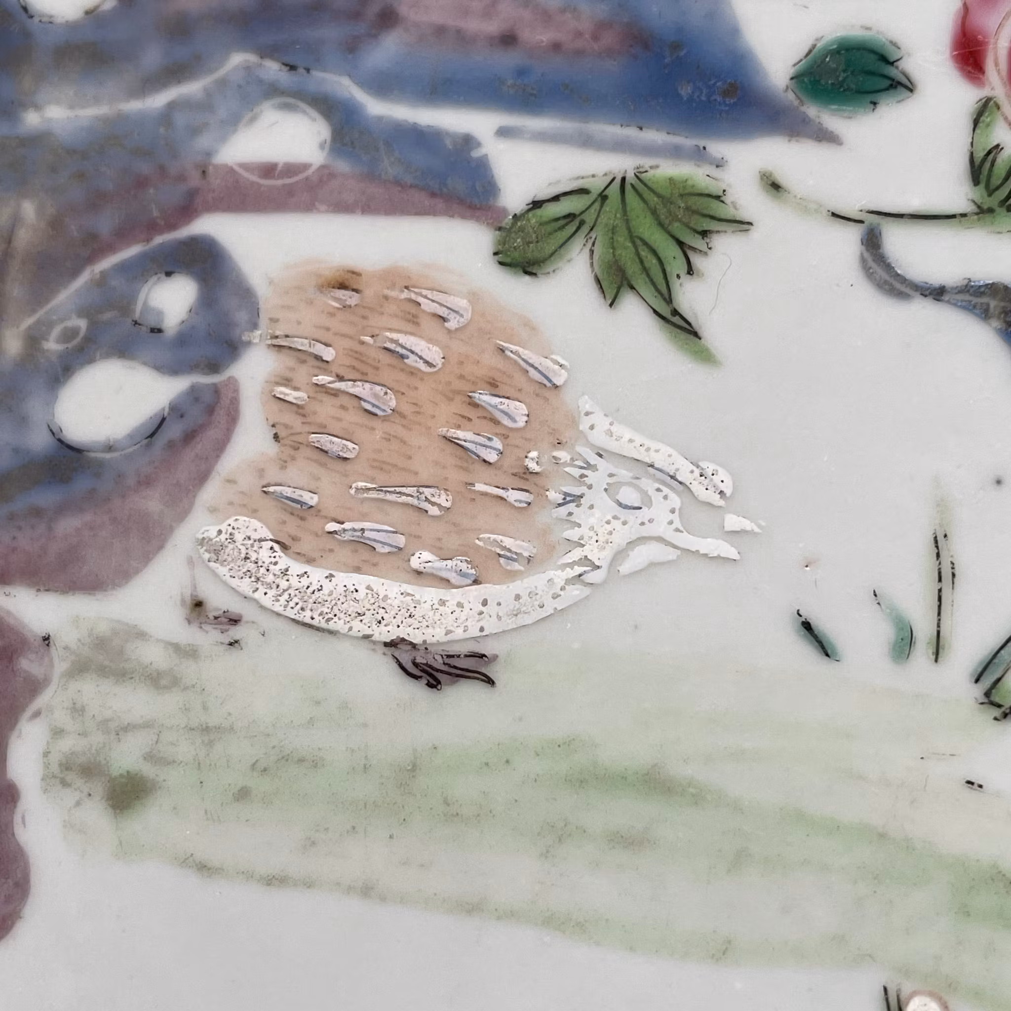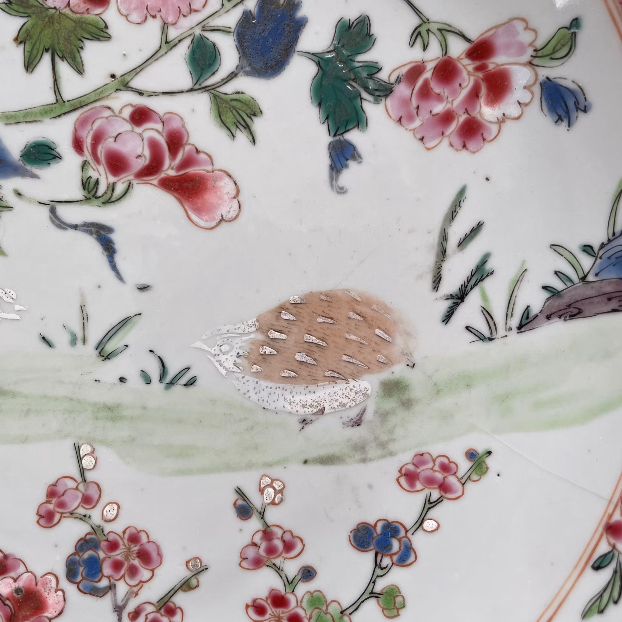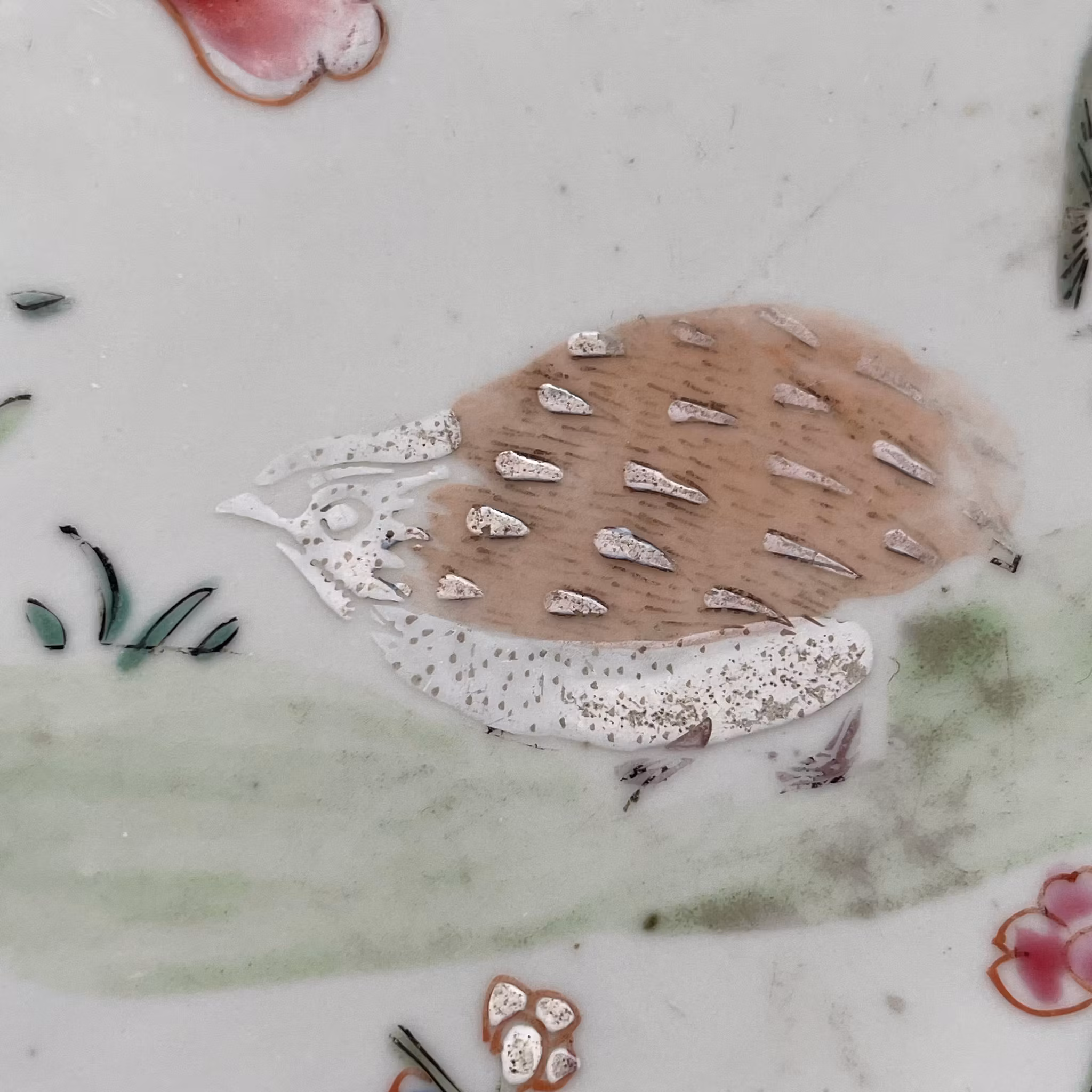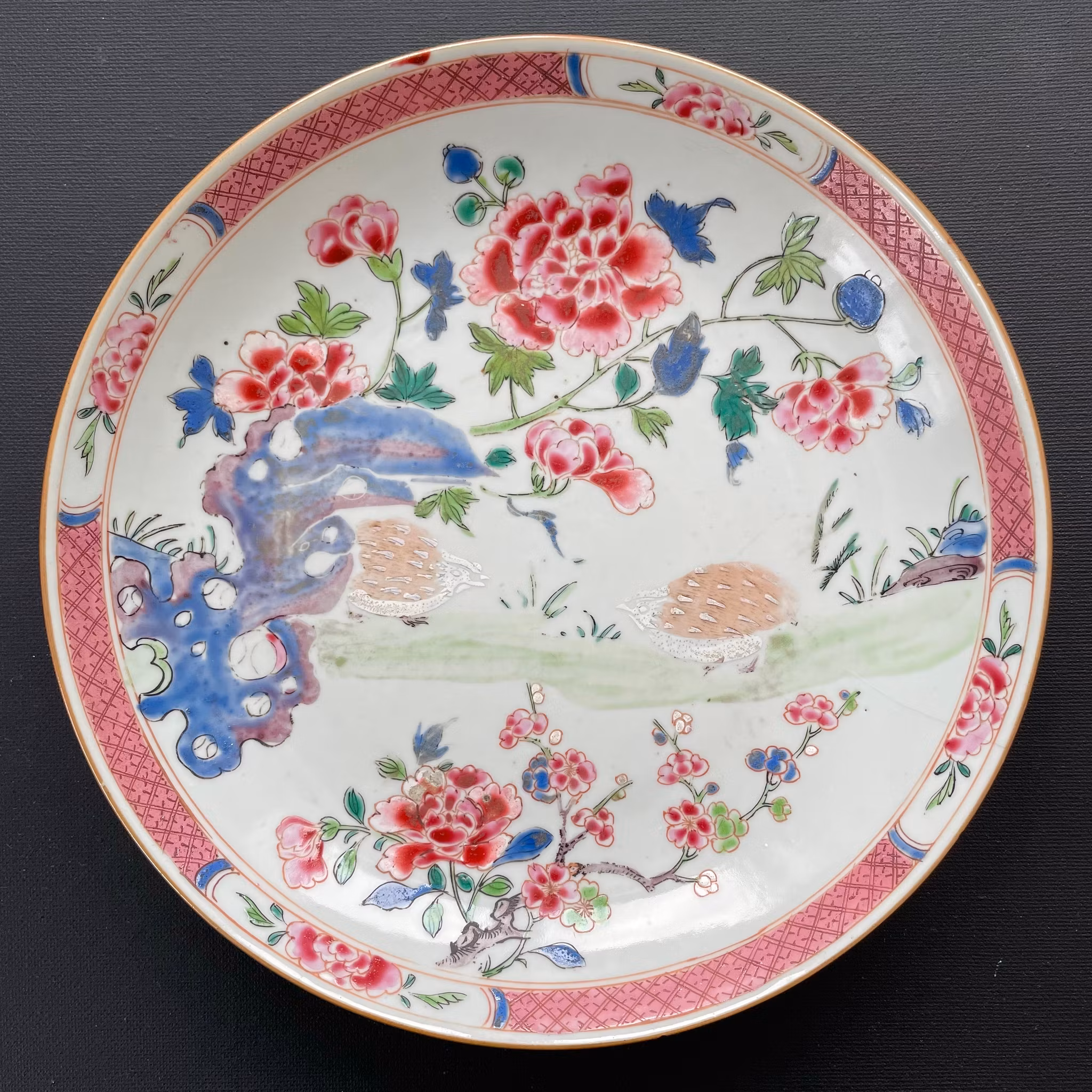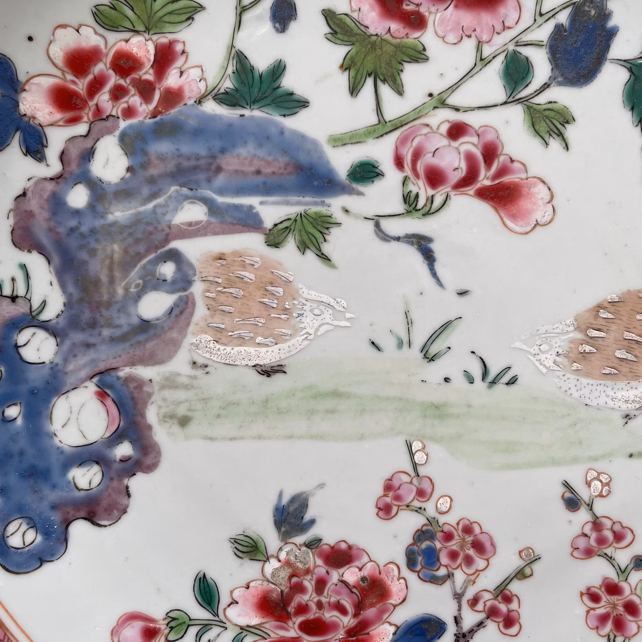 Beautiful deep mouth plate decorated in various famille rose enamels with two quails in a garden landscape with flowering peony and prunus plants and taihu (garden) rocks. On the rim a trellis pattern border with four reserves filled with peony flower heads. The reverse is undecorated.