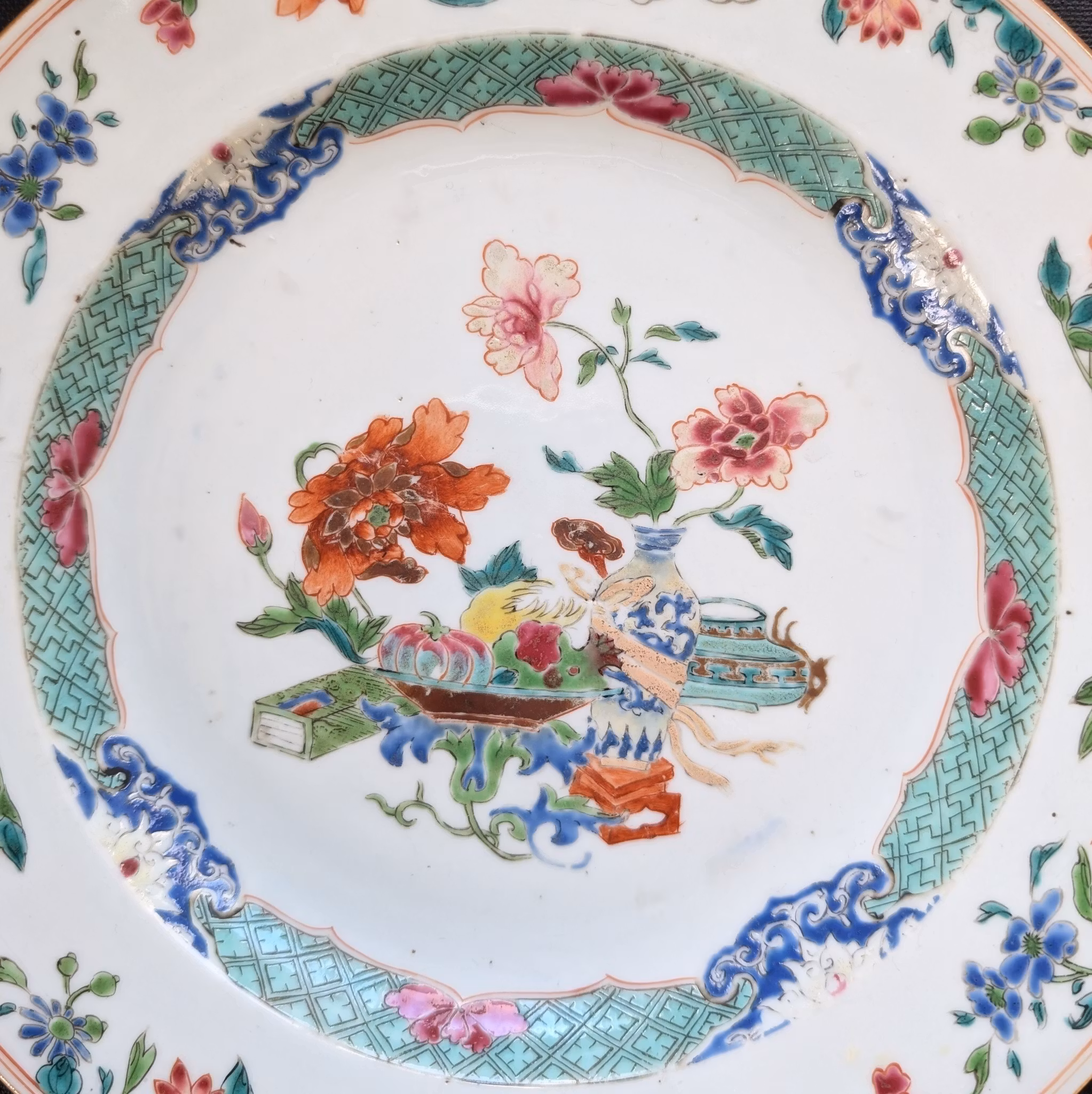 Beautiful famille rose plate with decoration of precious and antique objects. Yongzheng / Qianlong, first half of the 18th century.