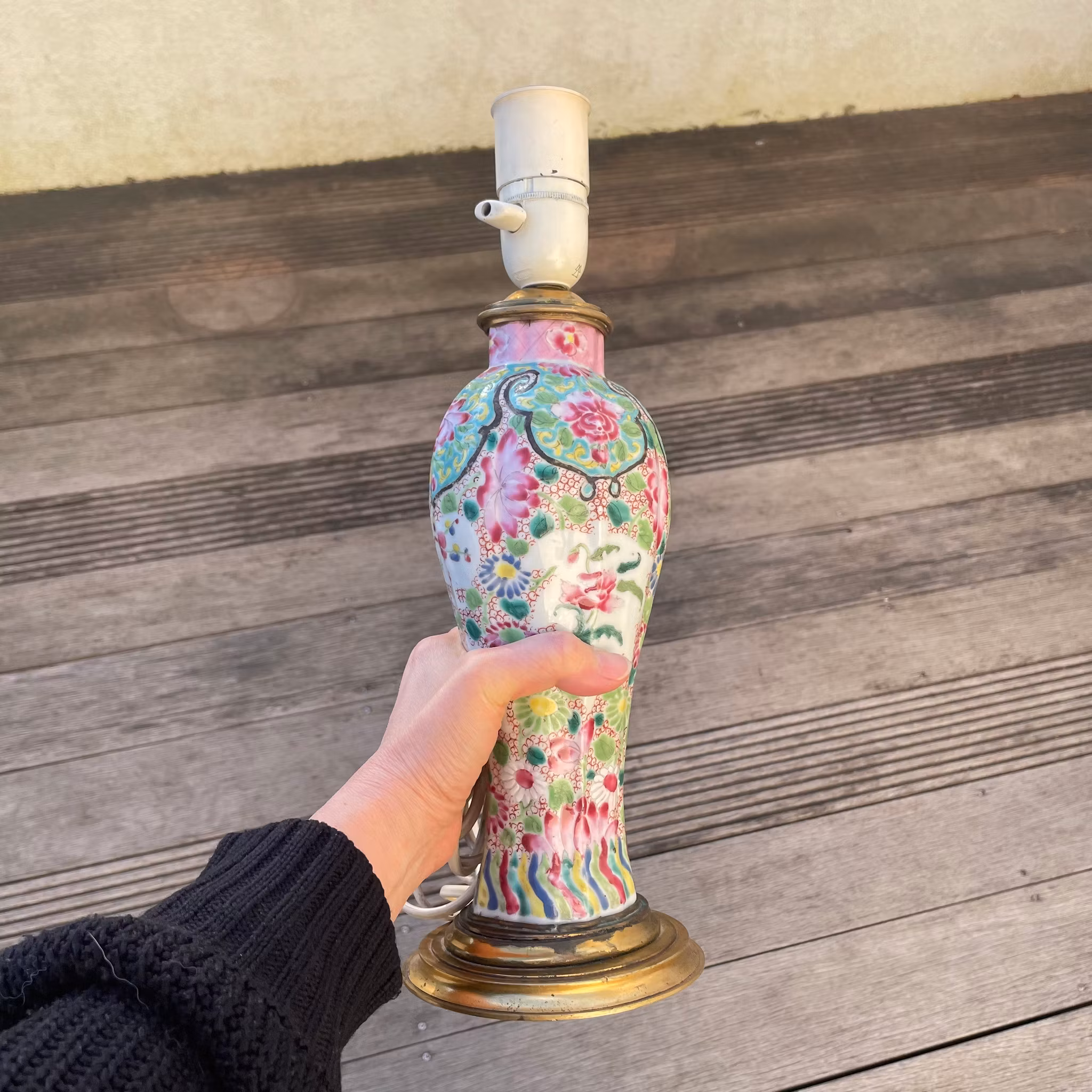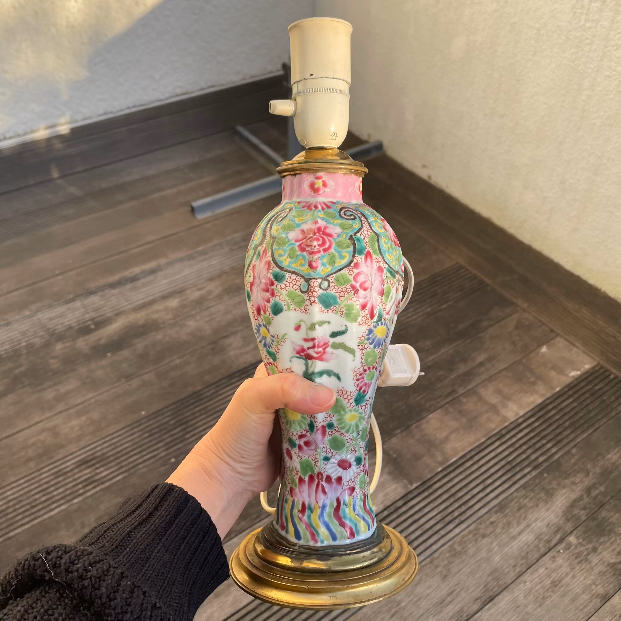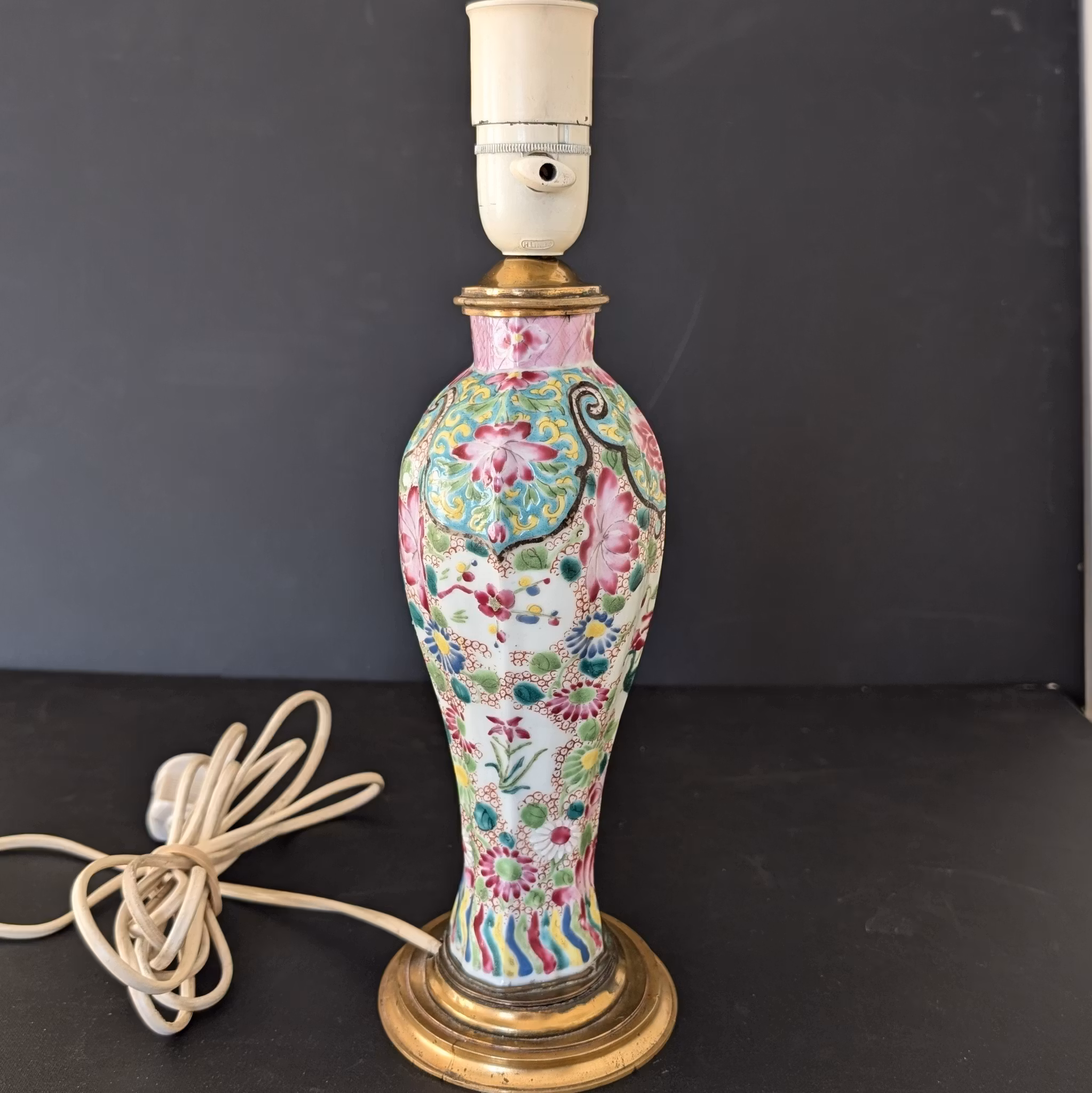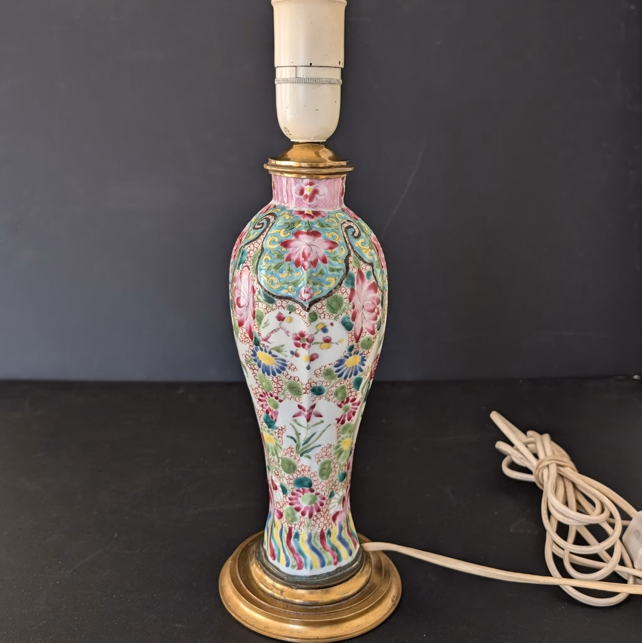 A beautiful vase decorated in famille rose made into a lamp. Likely Qianlong period. Nice custom made metal mount at the top and base makes the lamp look very high class.