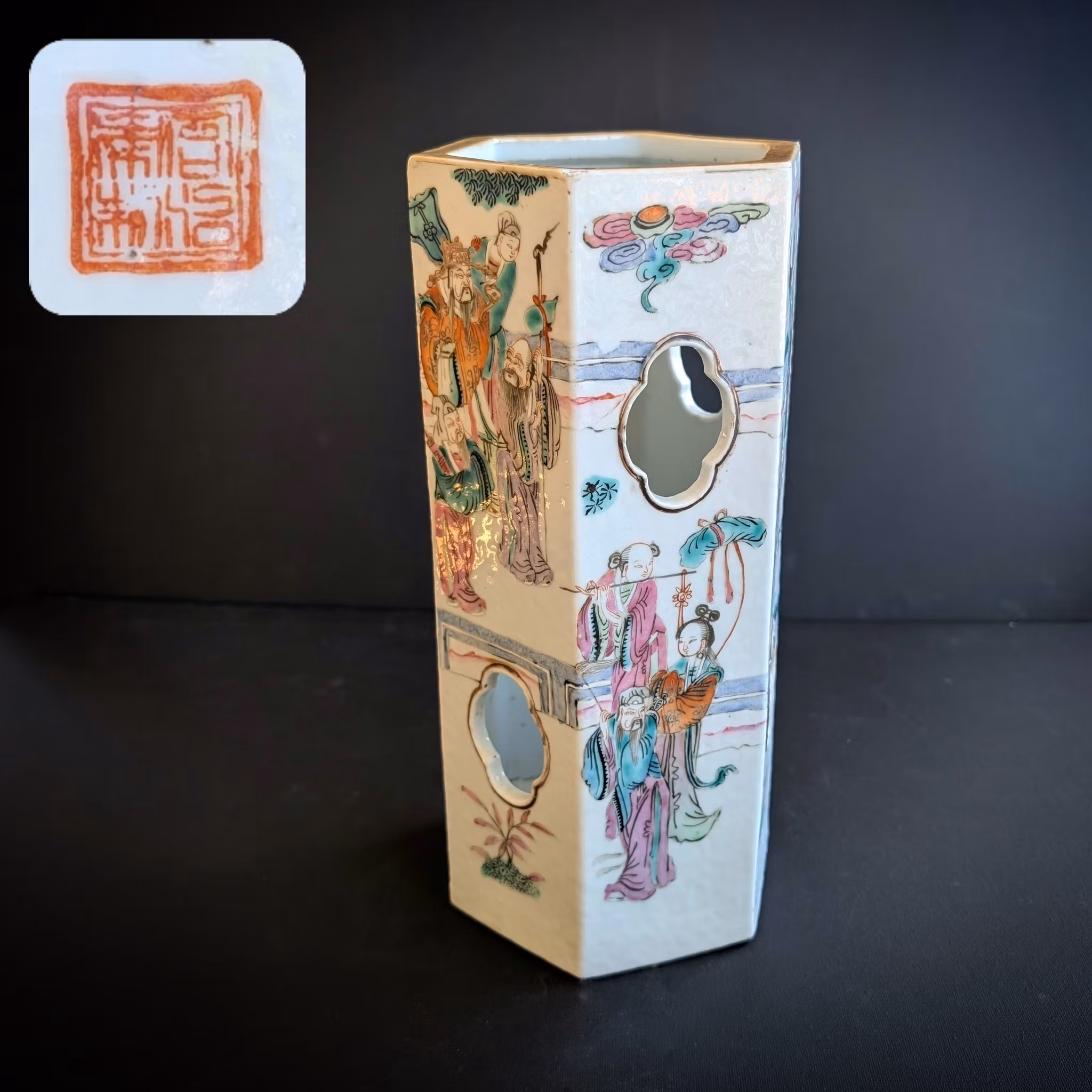 Beautiful large famille rose decorated hatstand with various gods and immortals from the Chinese mythology, totally 17 figures.